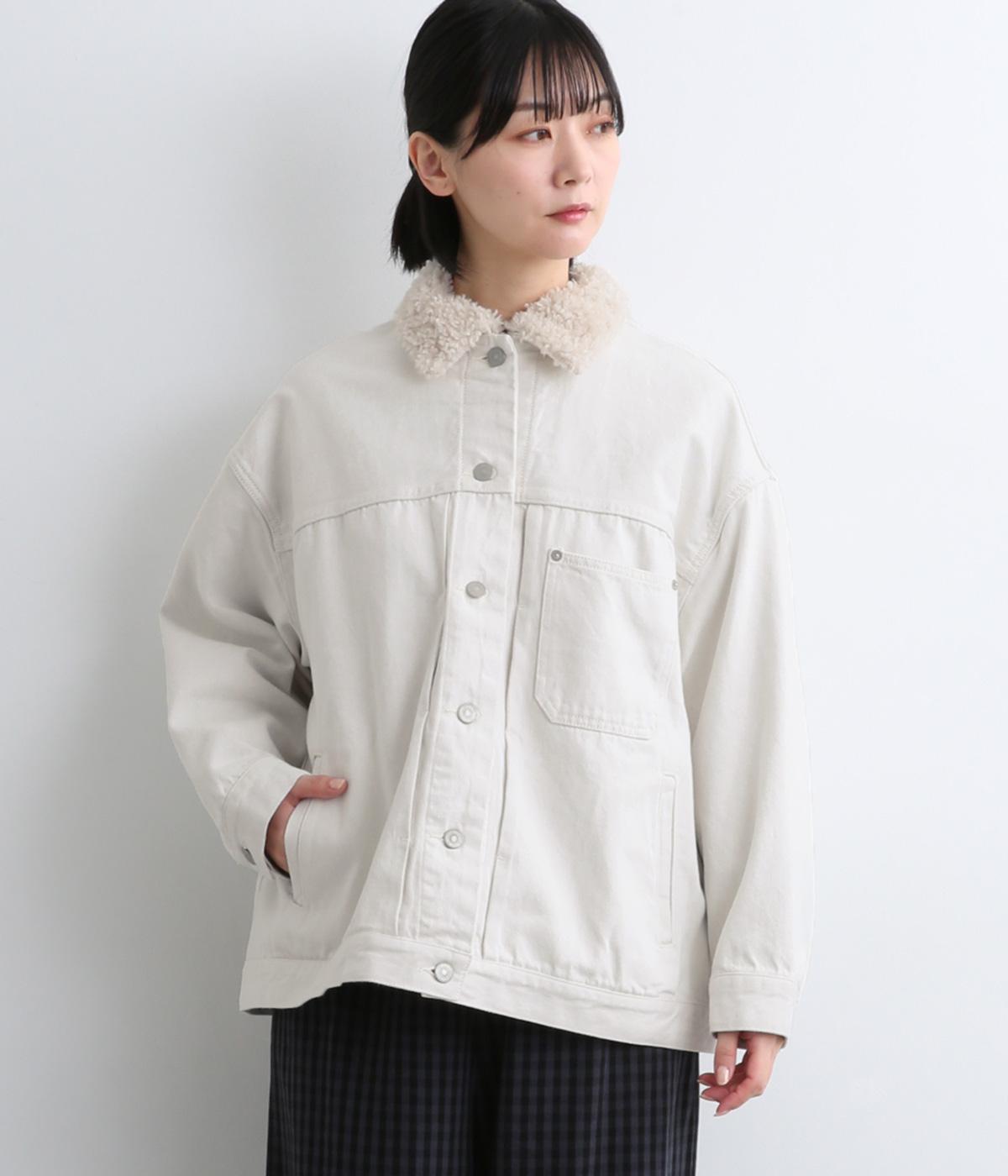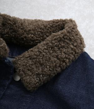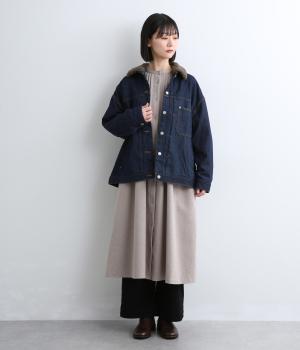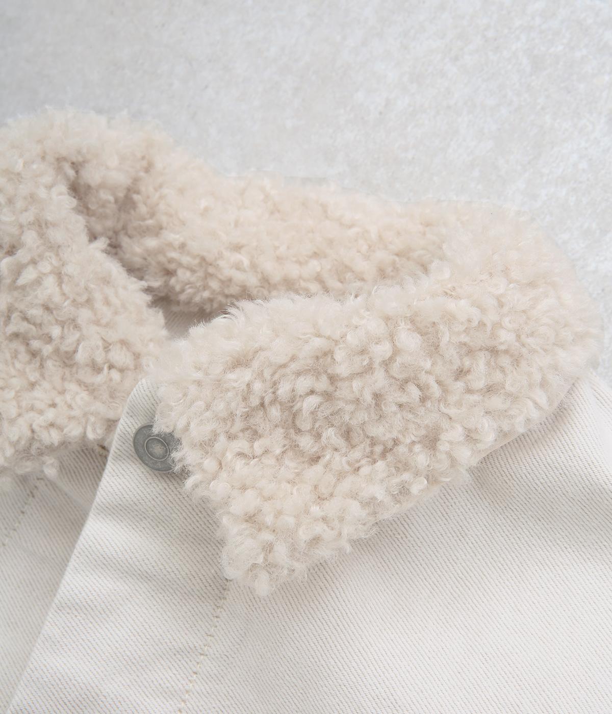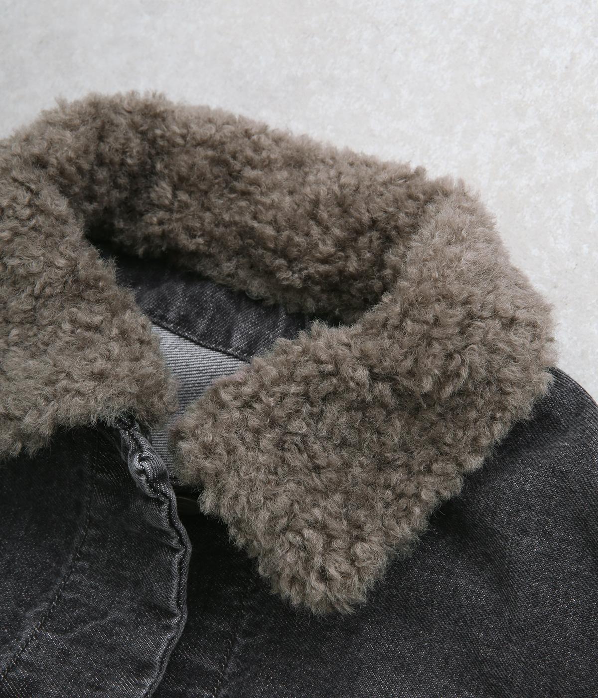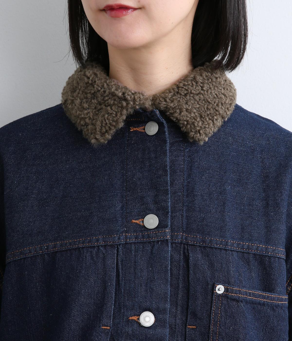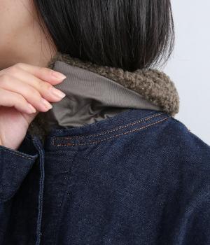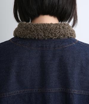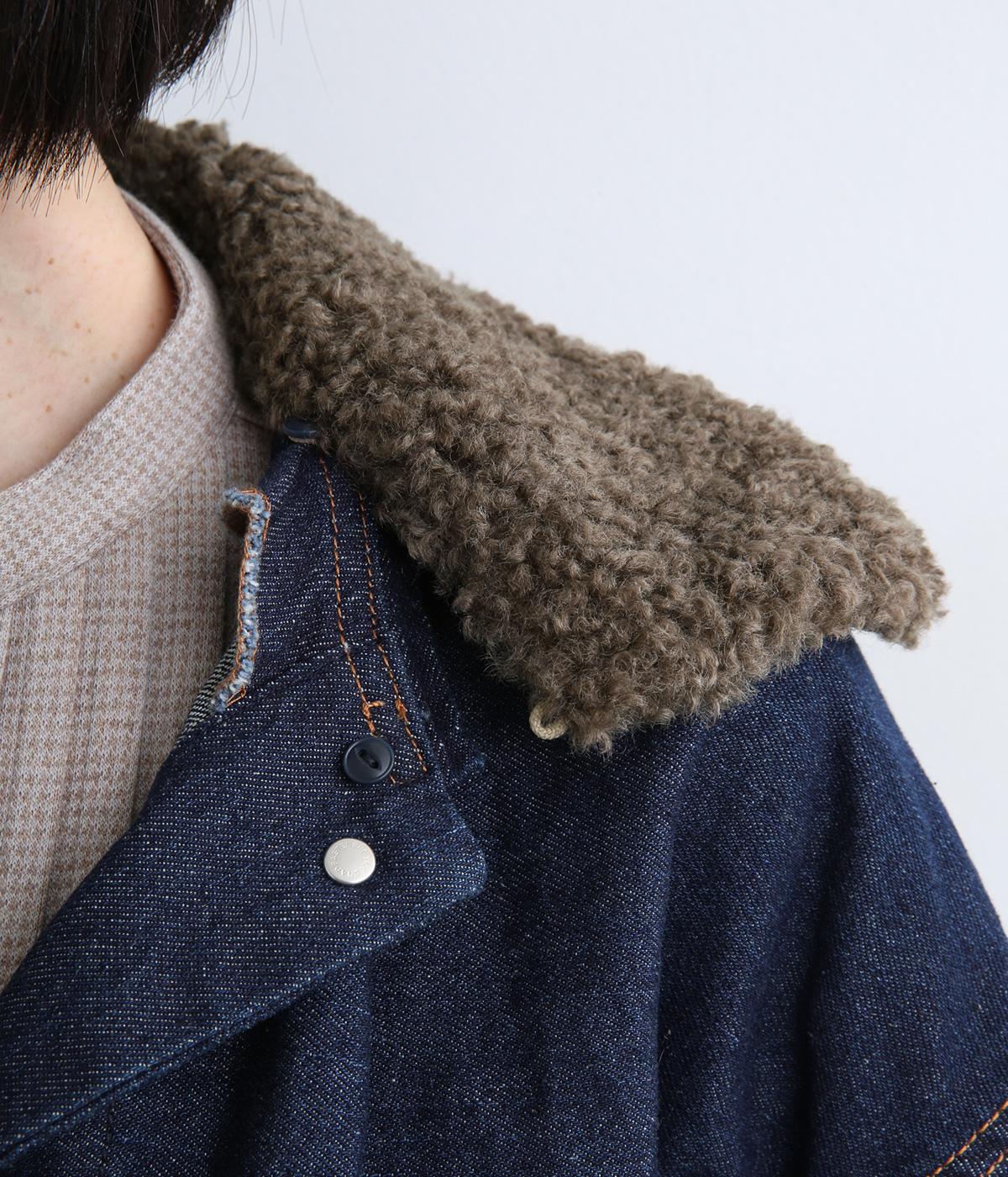 硬さの少ないコットンリネンデニム生地を使用しています。ほどよいハリでシルエットをきれいに保ちます。襟には取り外し可能なふわふわのボアを合わせました。