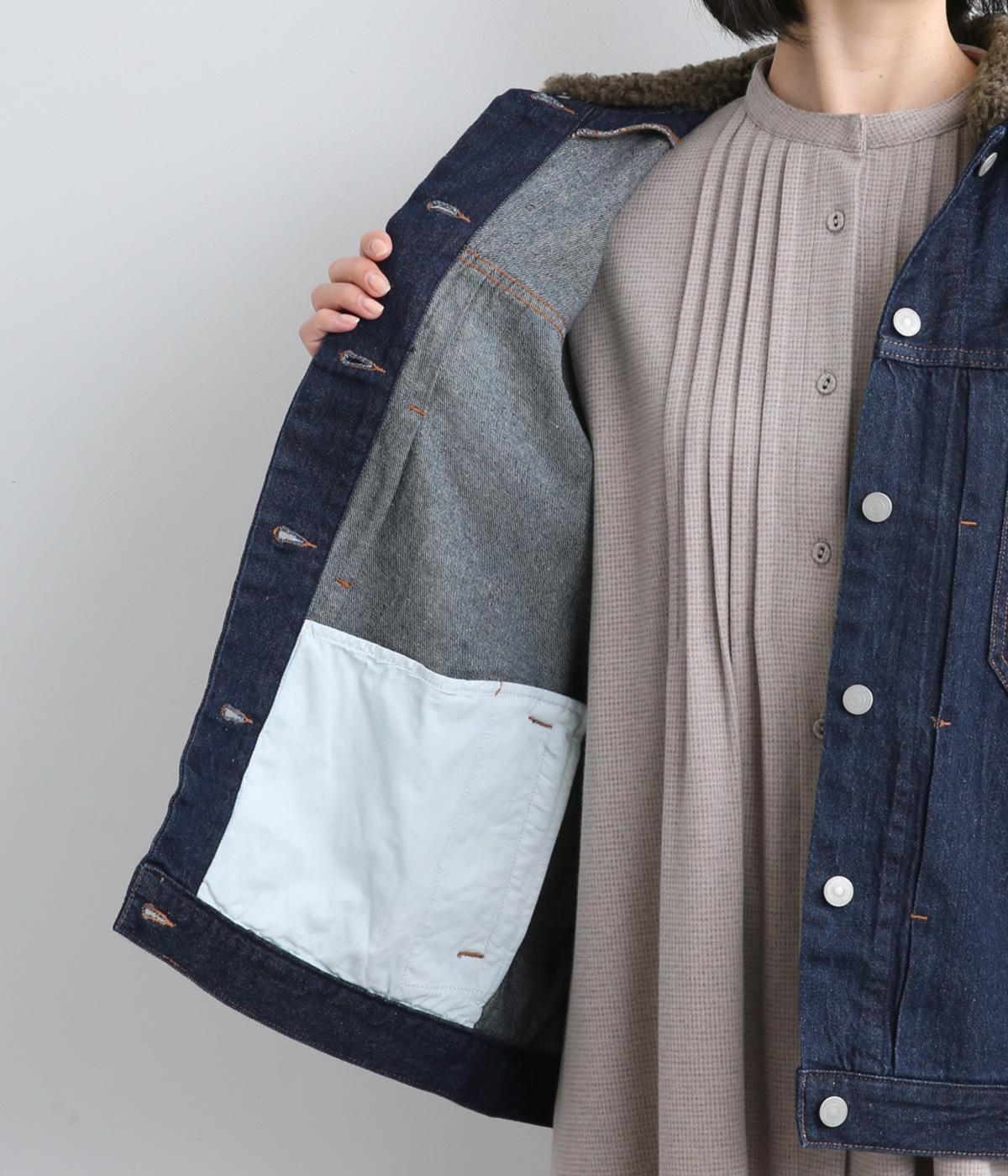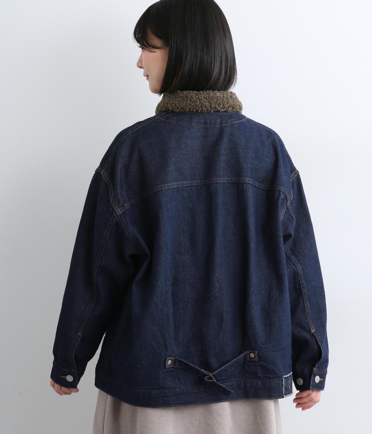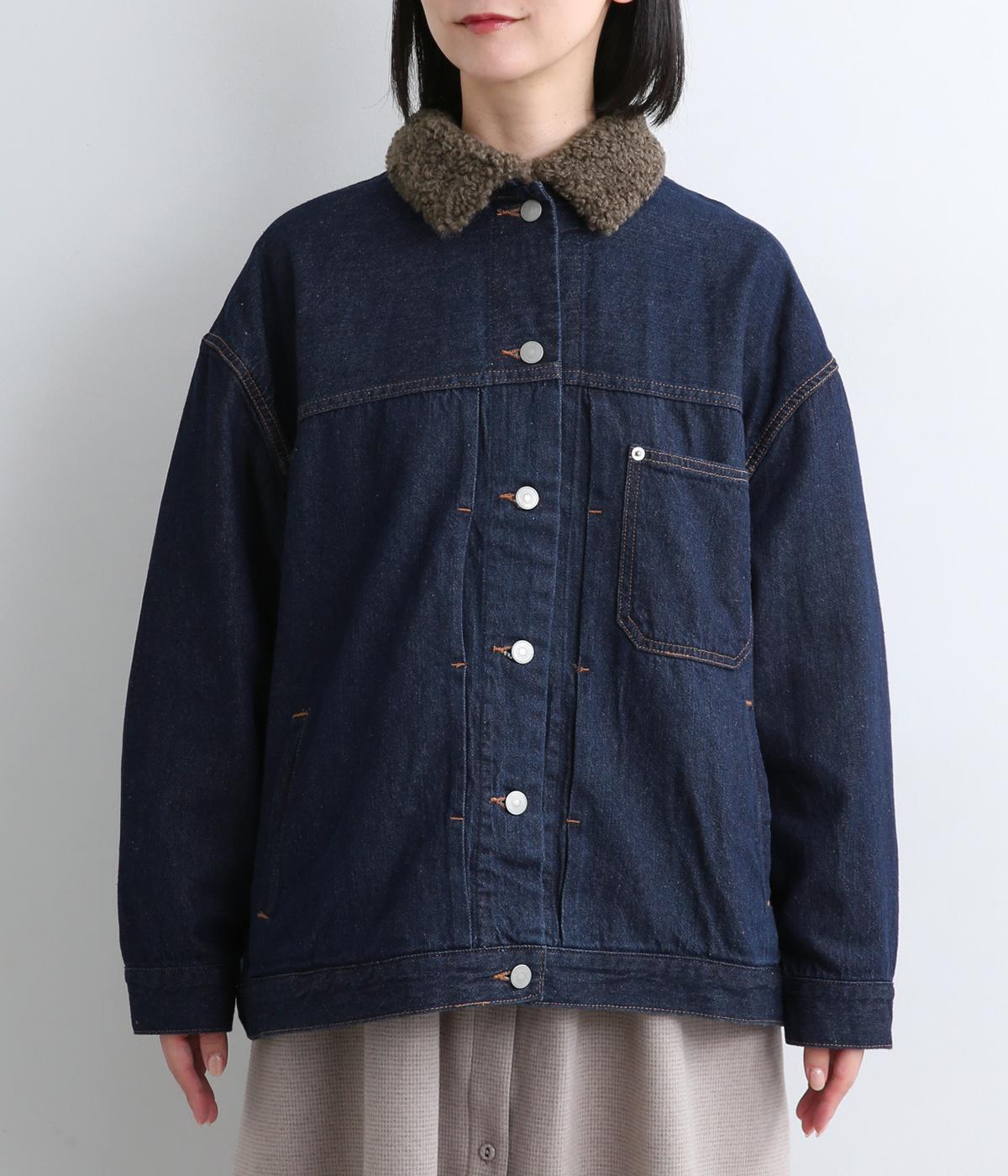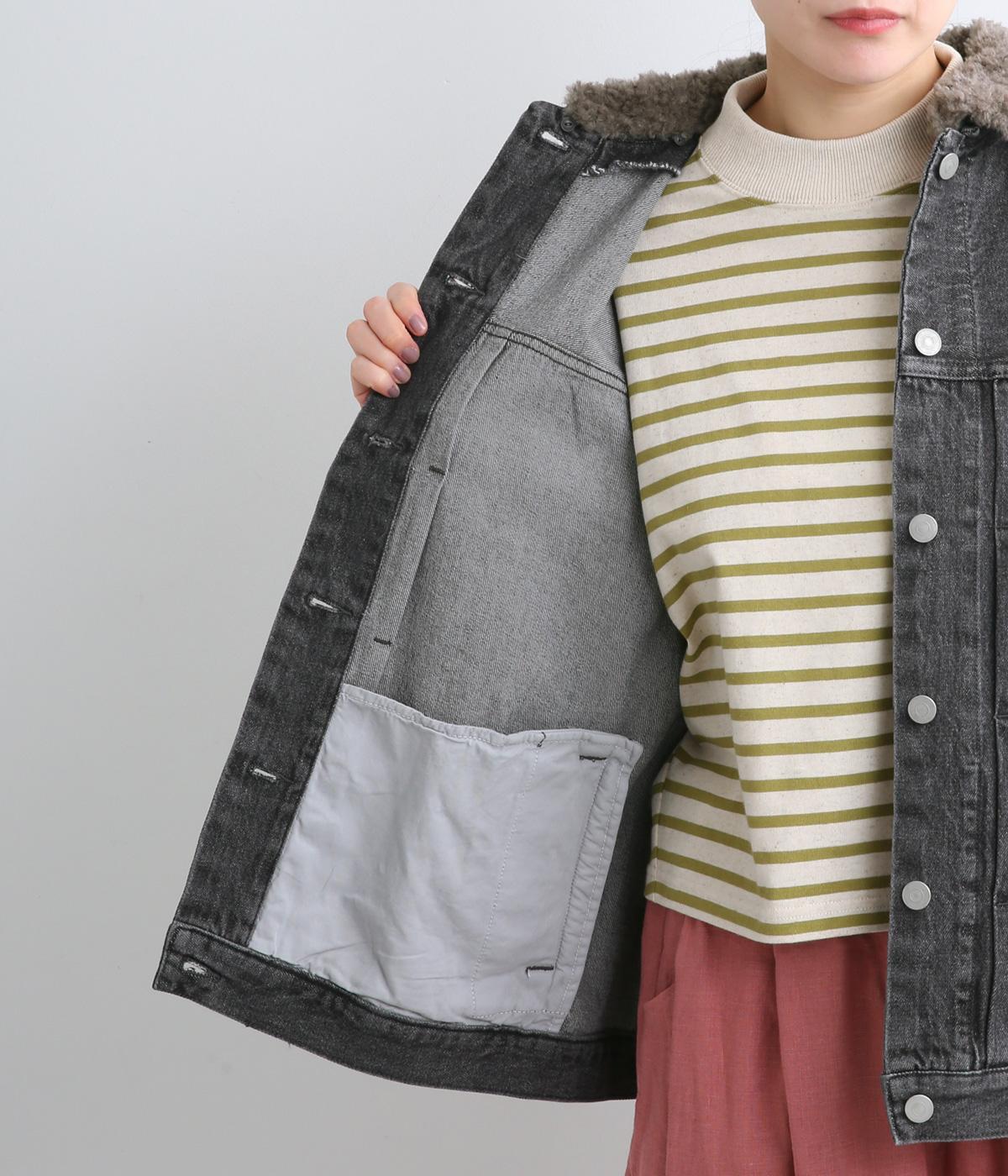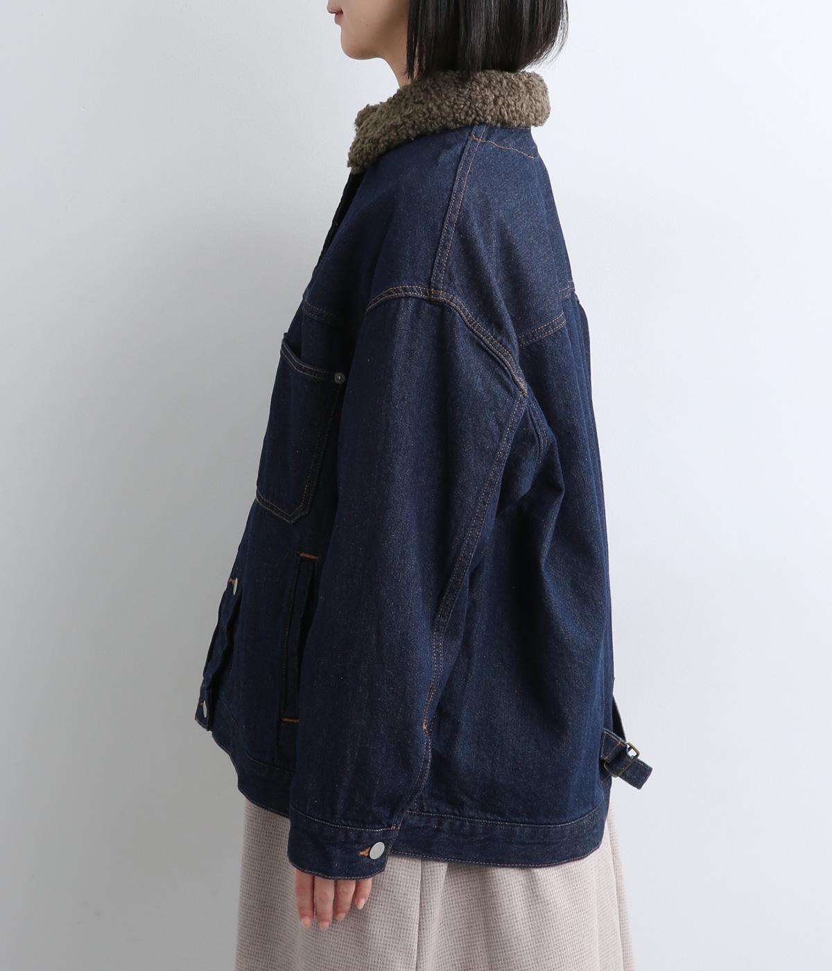 硬さの少ないコットンリネンデニム生地を使用しています。ほどよいハリでシルエットをきれいに保ちます。襟には取り外し可能なふわふわのボアを合わせました。