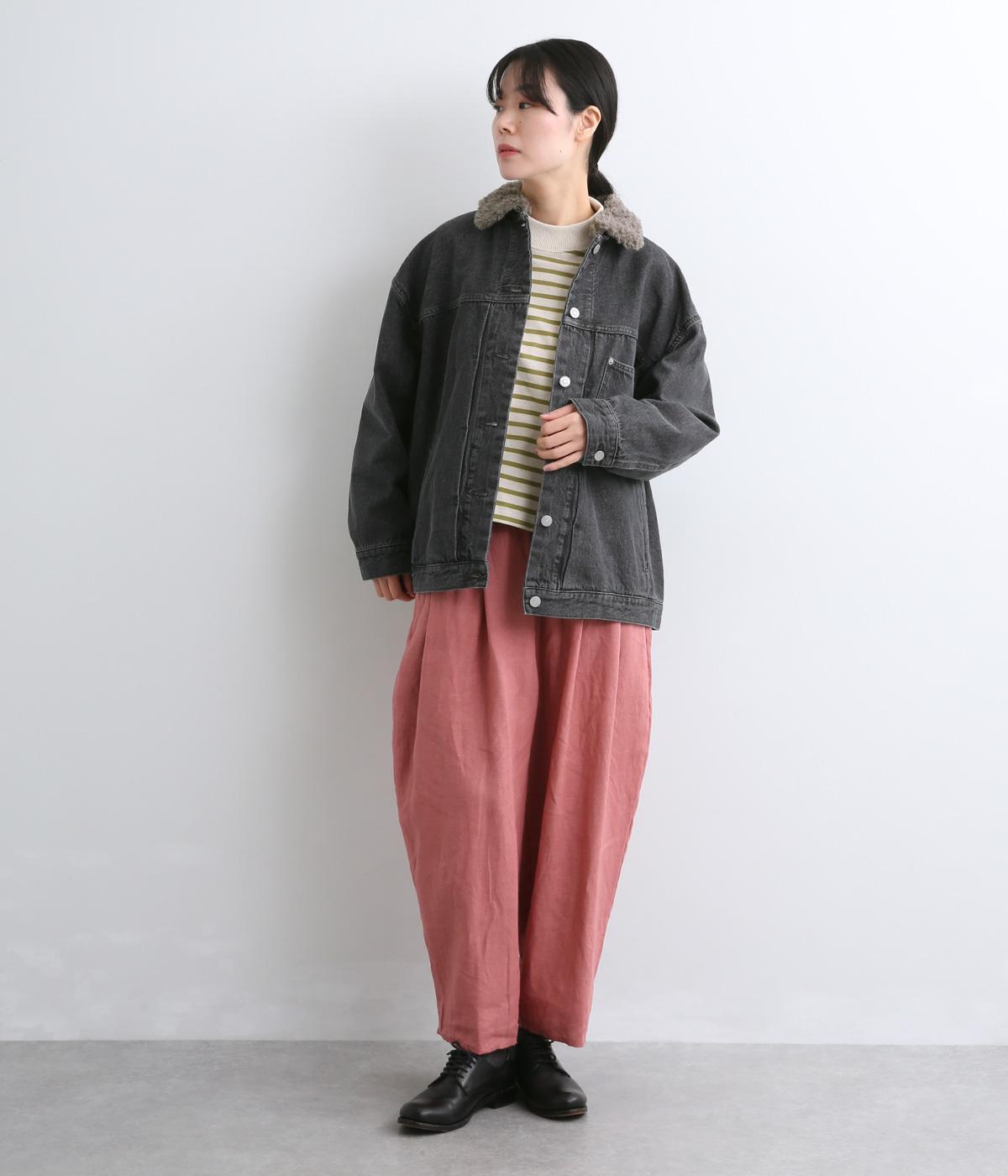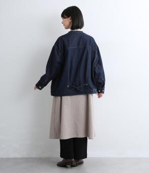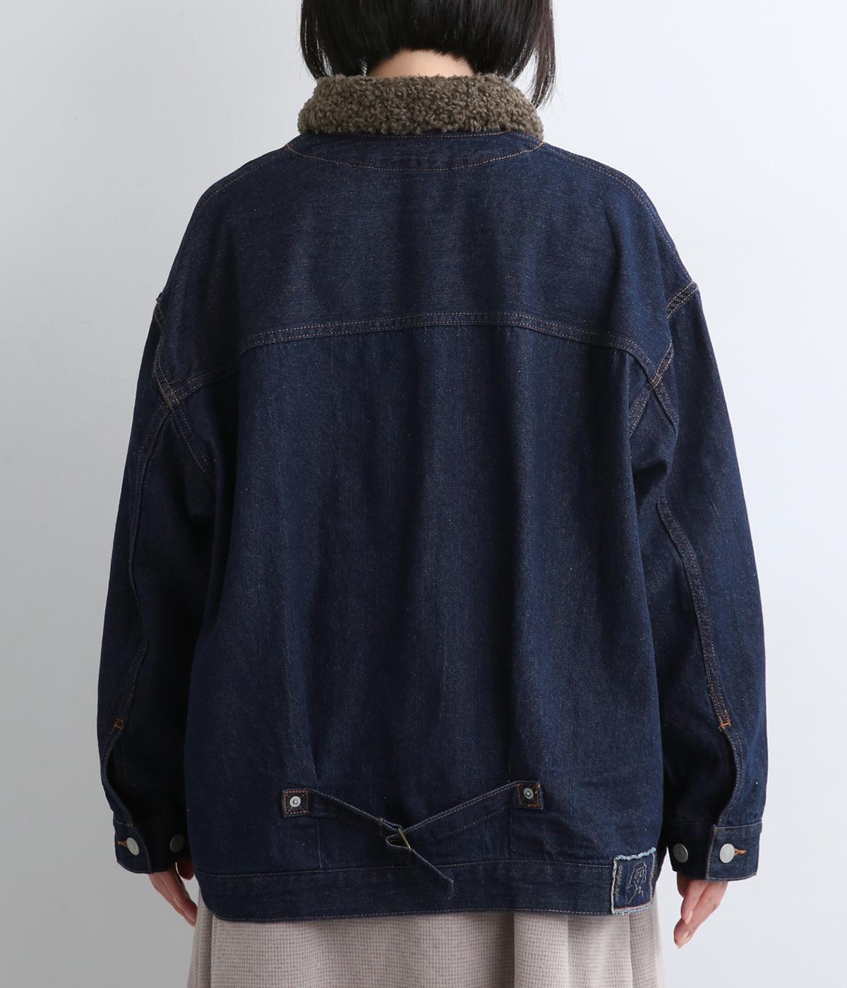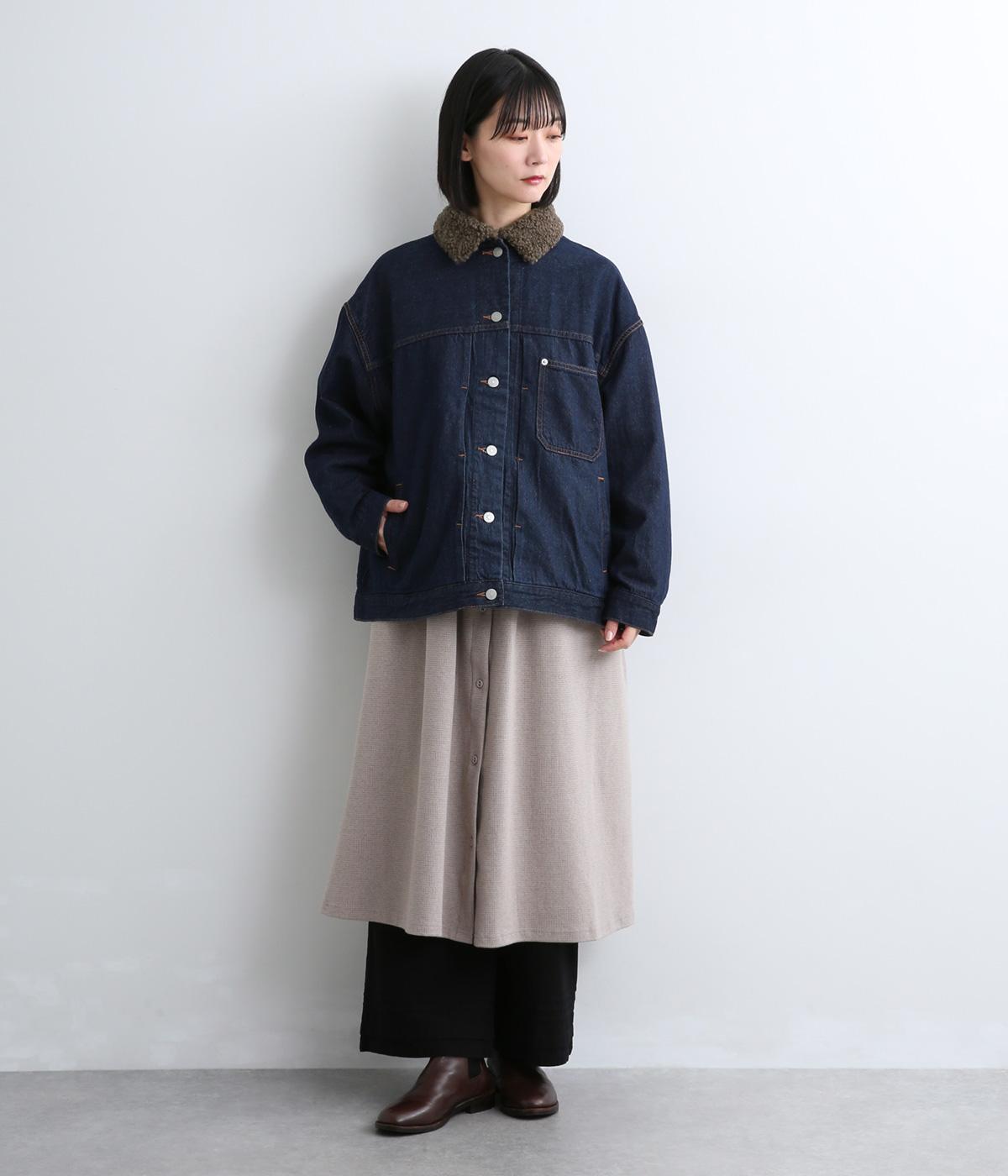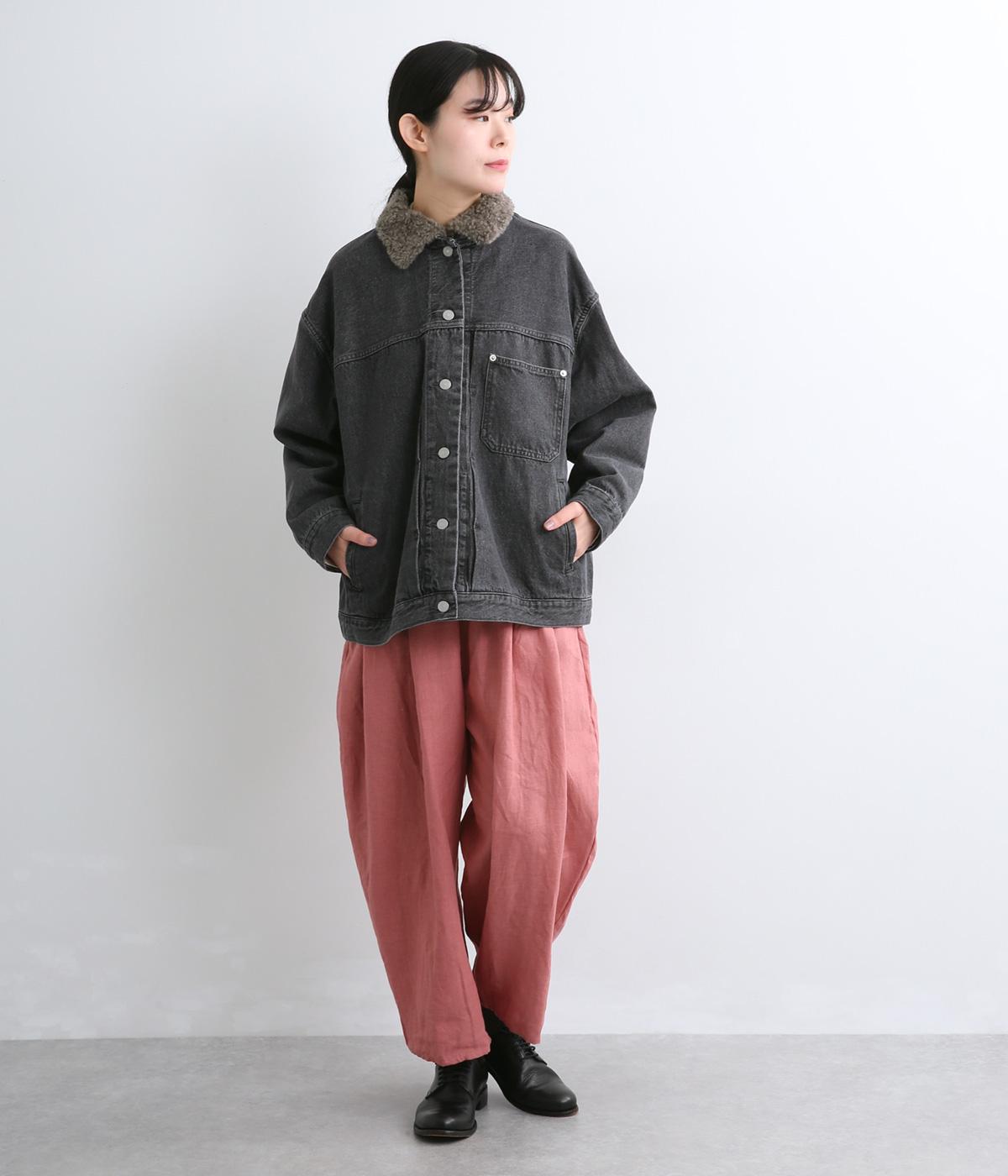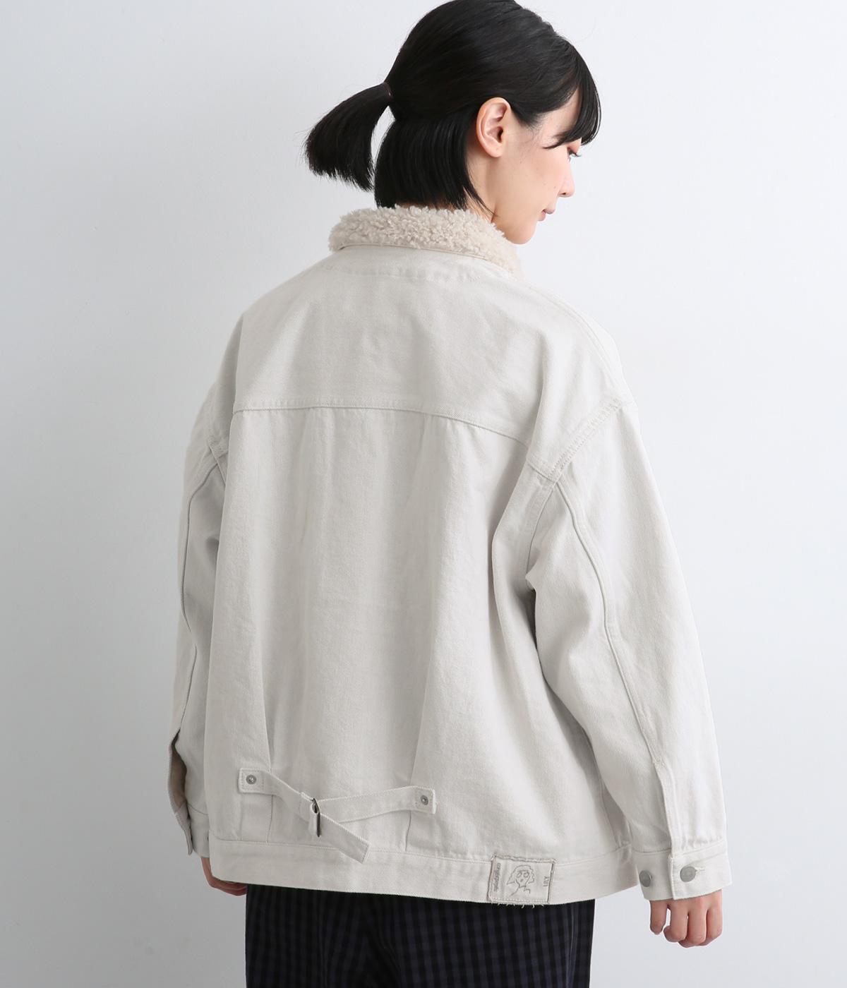 硬さの少ないコットンリネンデニム生地を使用しています。ほどよいハリでシルエットをきれいに保ちます。襟には取り外し可能なふわふわのボアを合わせました。