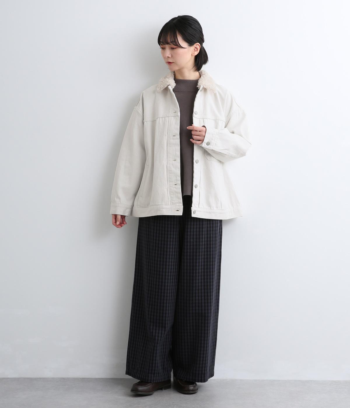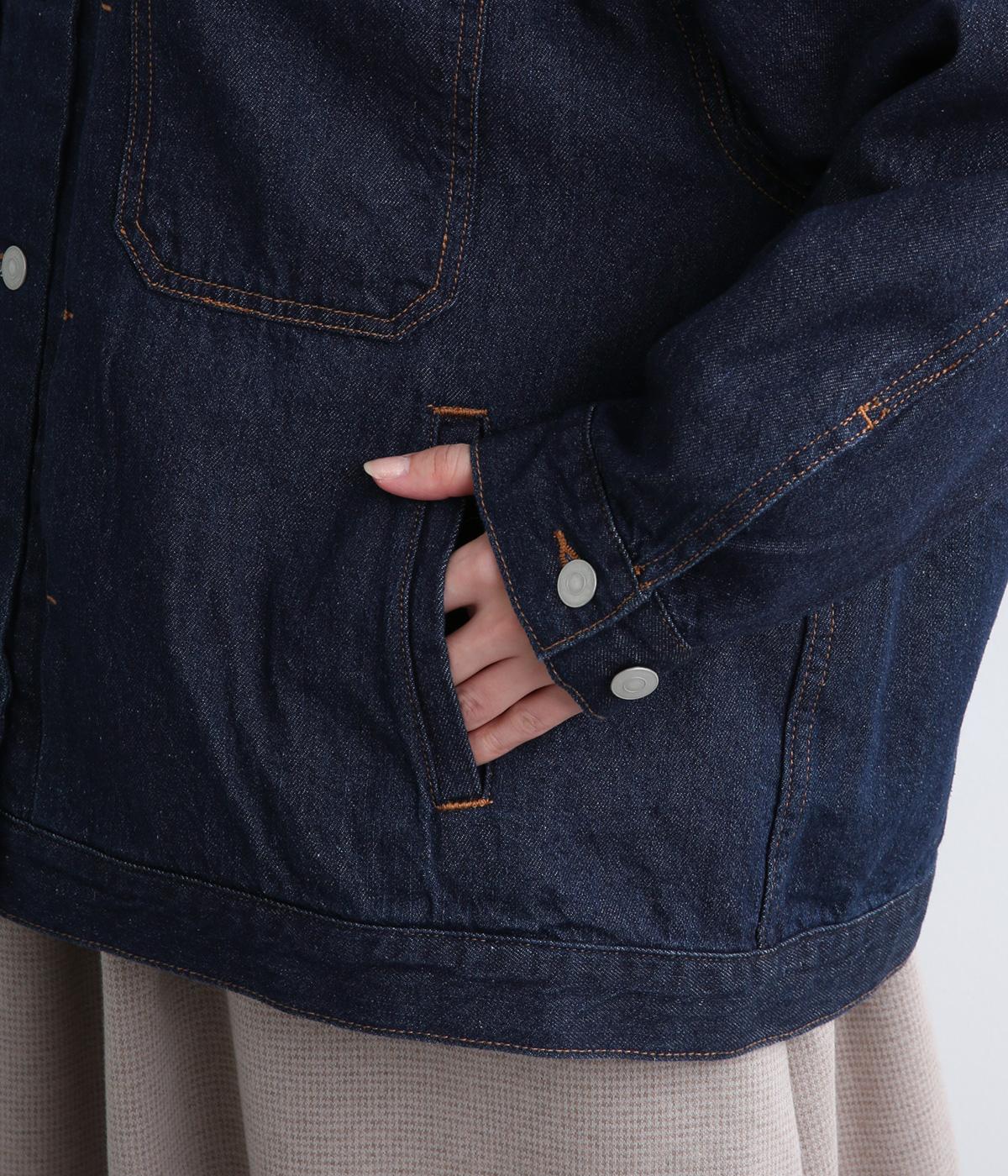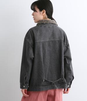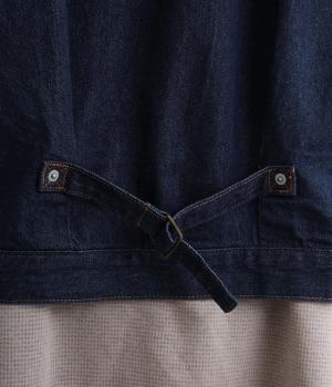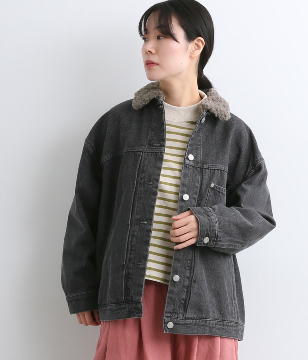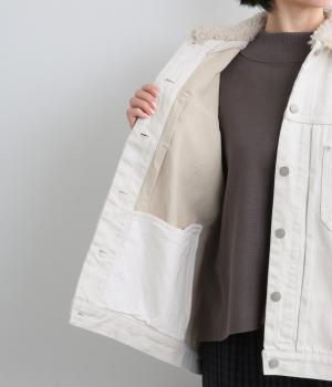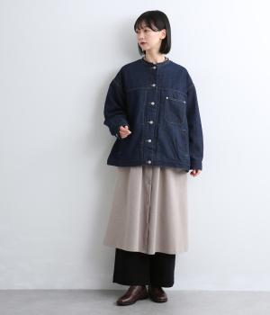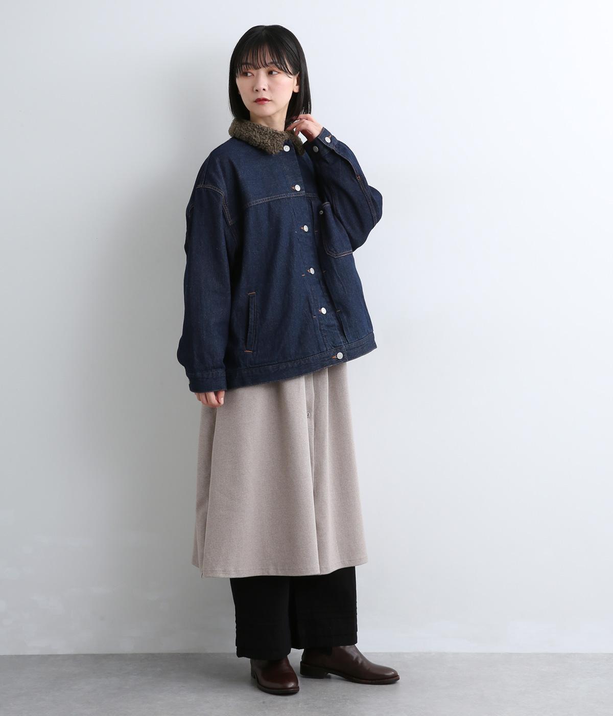 硬さの少ないコットンリネンデニム生地を使用しています。ほどよいハリでシルエットをきれいに保ちます。襟には取り外し可能なふわふわのボアを合わせました。
