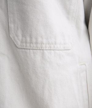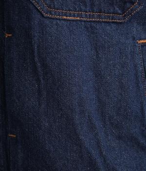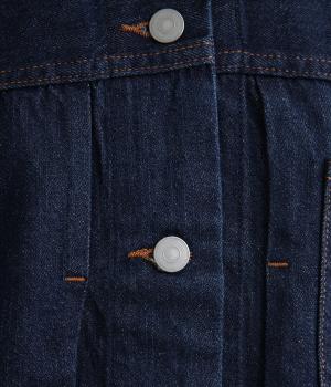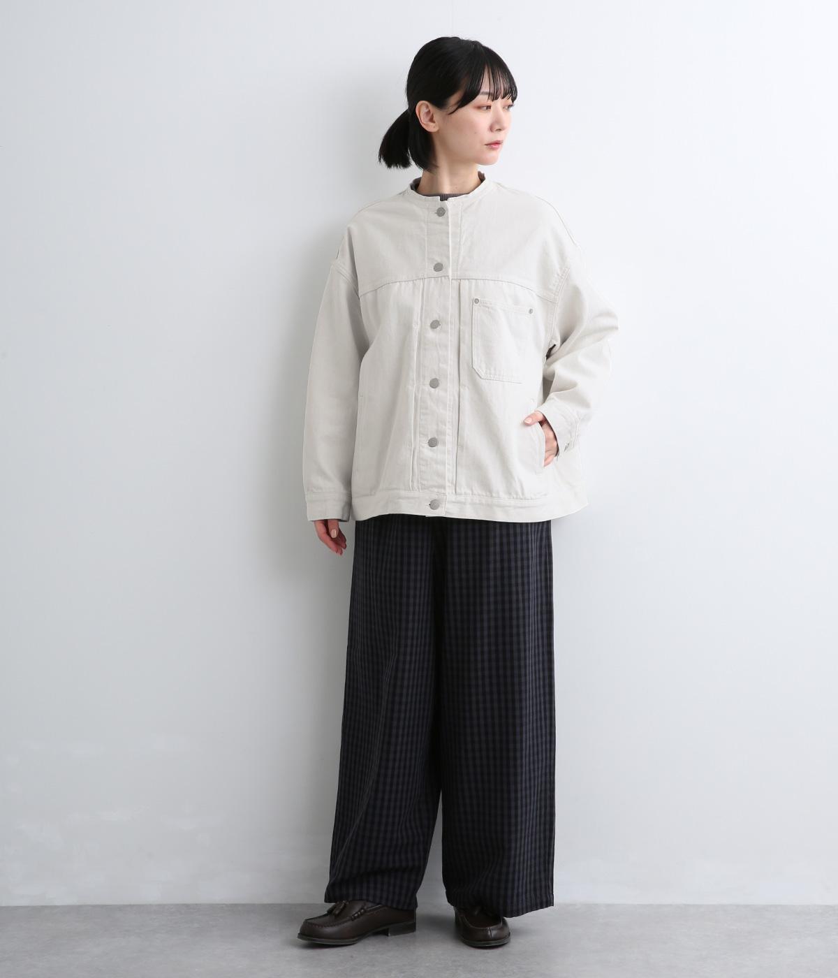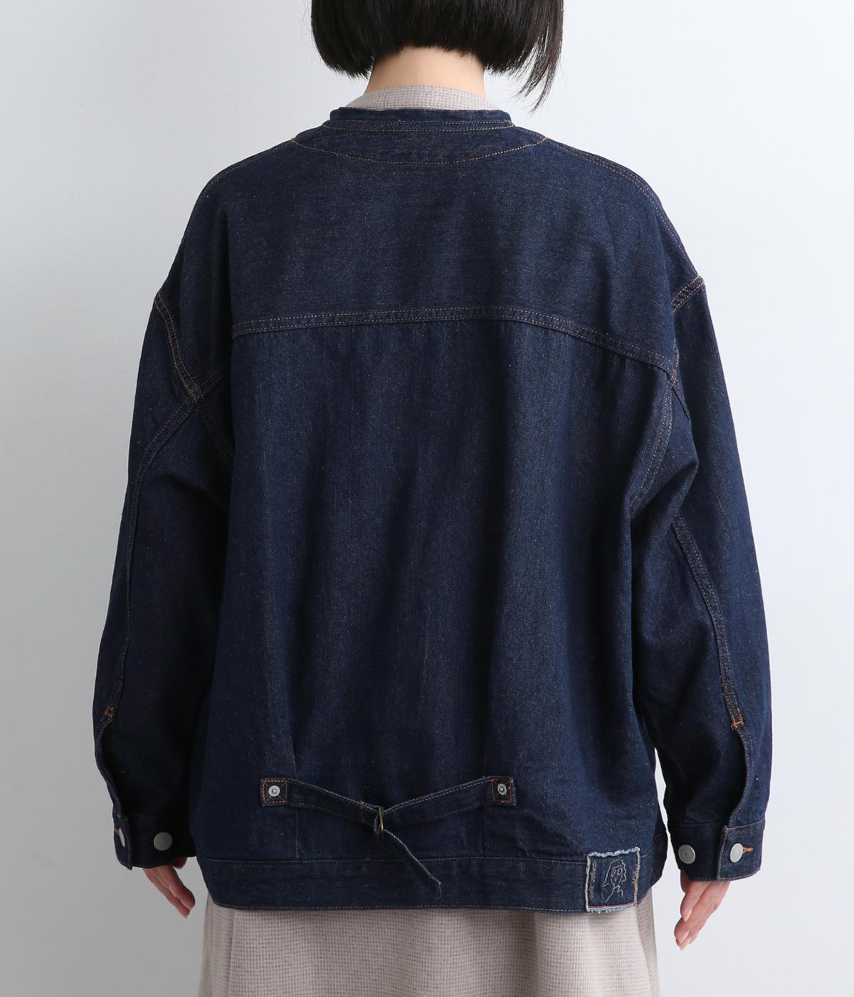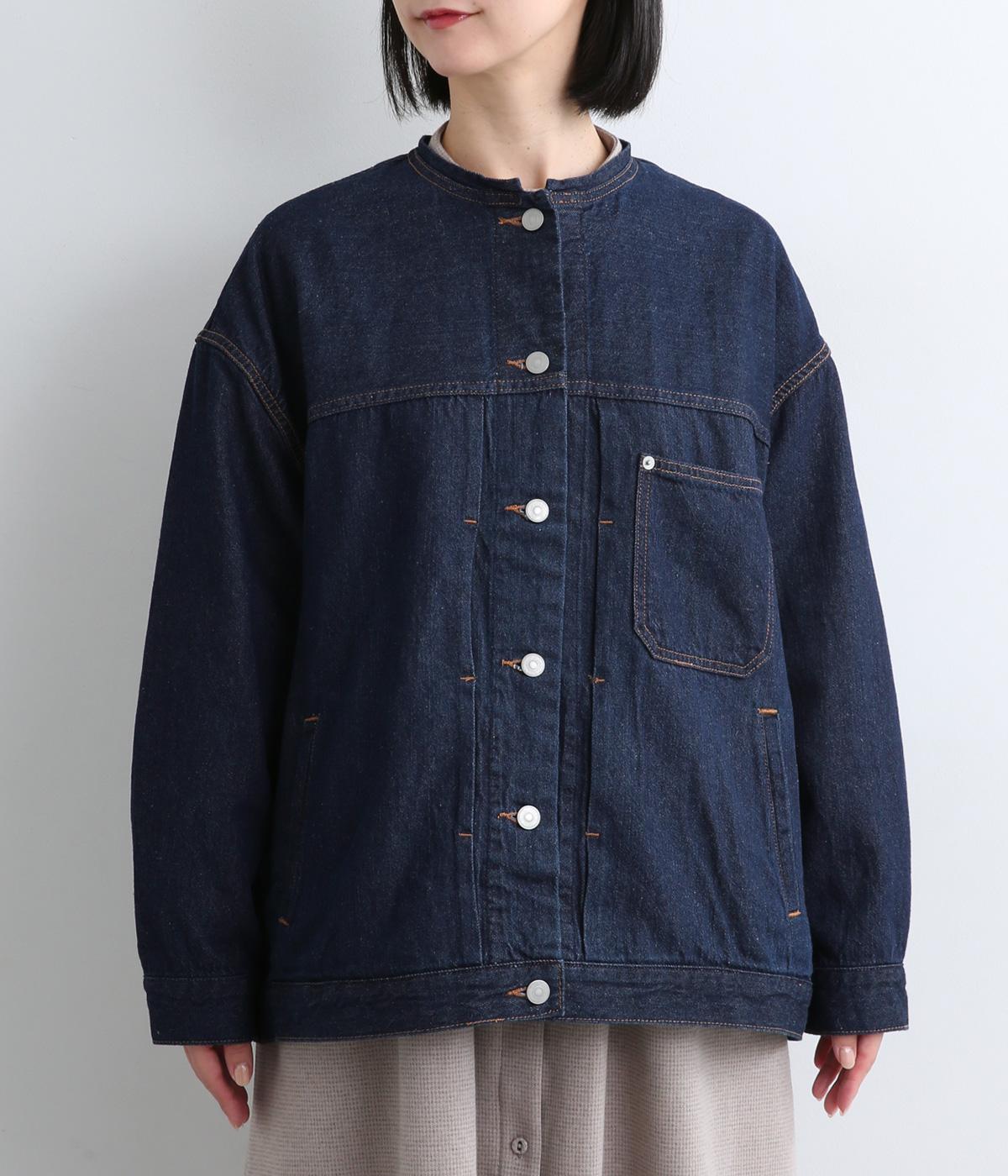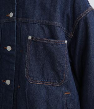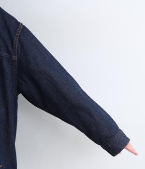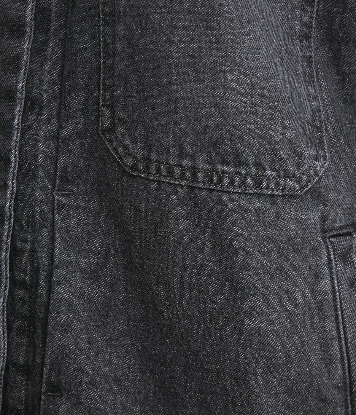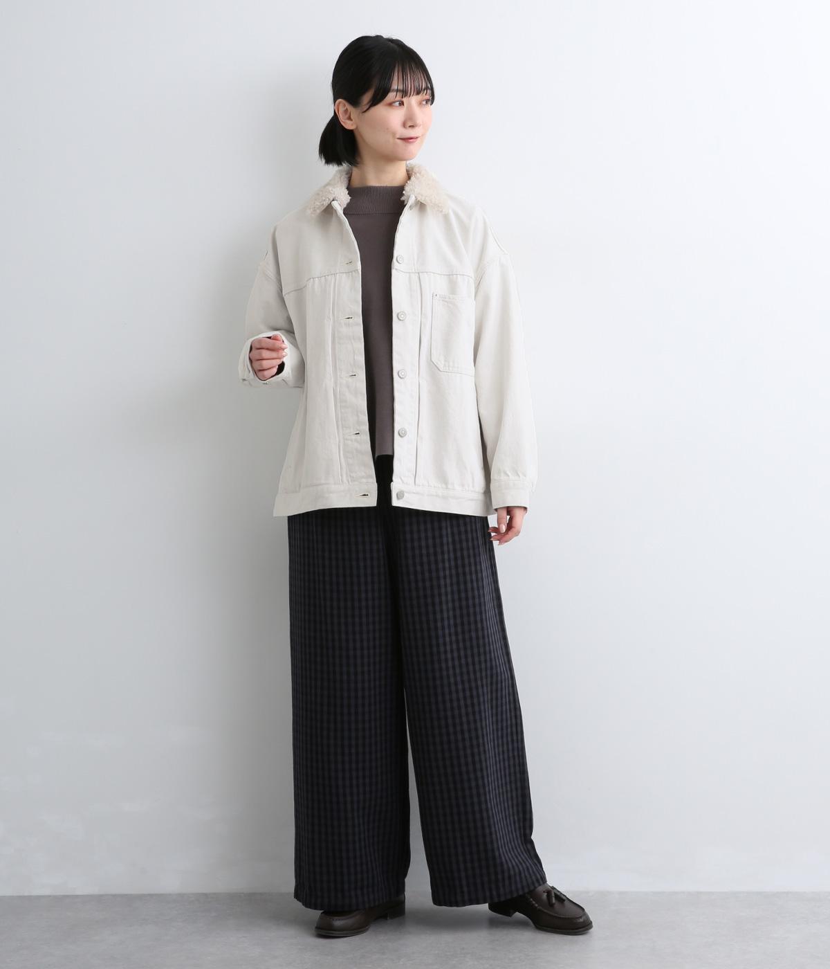 硬さの少ないコットンリネンデニム生地を使用しています。ほどよいハリでシルエットをきれいに保ちます。襟には取り外し可能なふわふわのボアを合わせました。