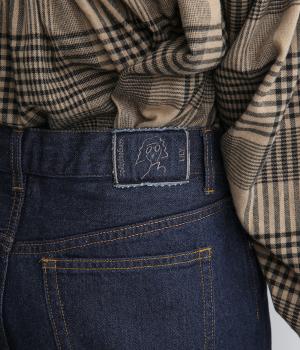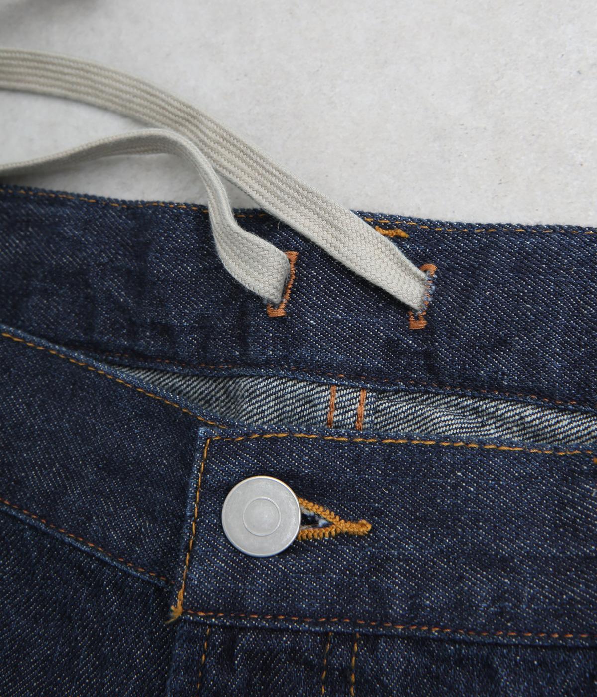 汎用性の高いシンプルなストレートシルエット。ウエストはボタンとファスナー仕様で、サイズ調節用の紐はうしろで結ぶためお腹まわりがもたつきにくいのも◎。腰にあしらったイラストロゴの刺しゅうがさりげないアクセントです。