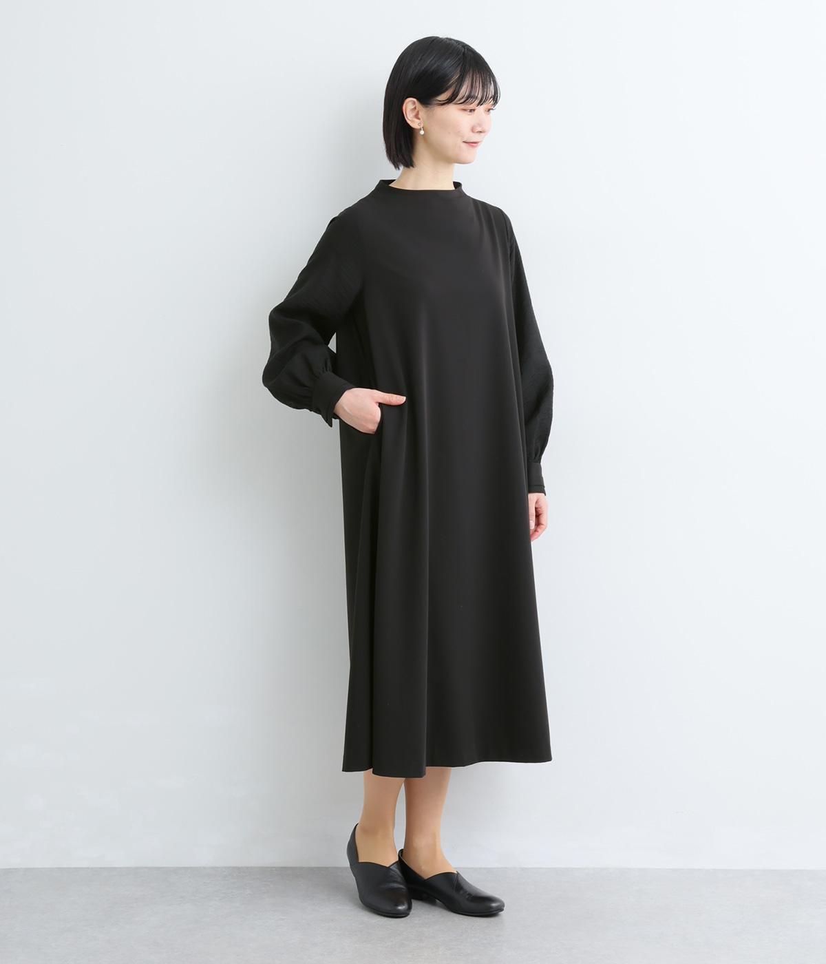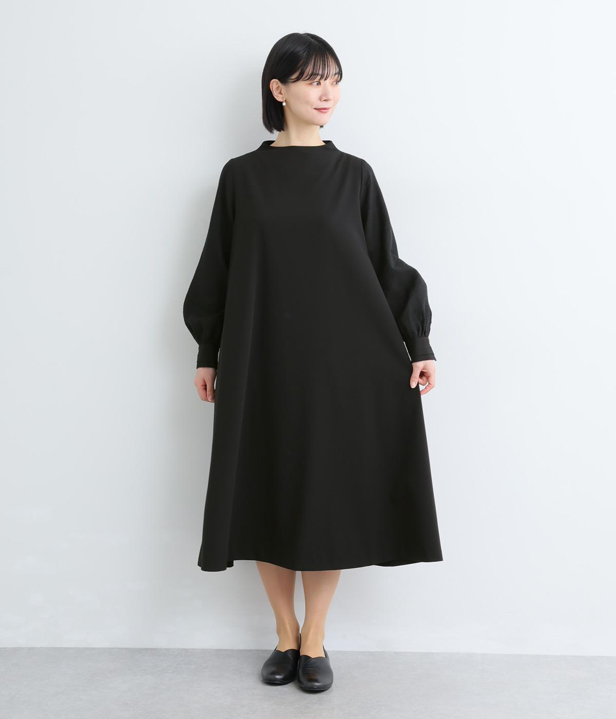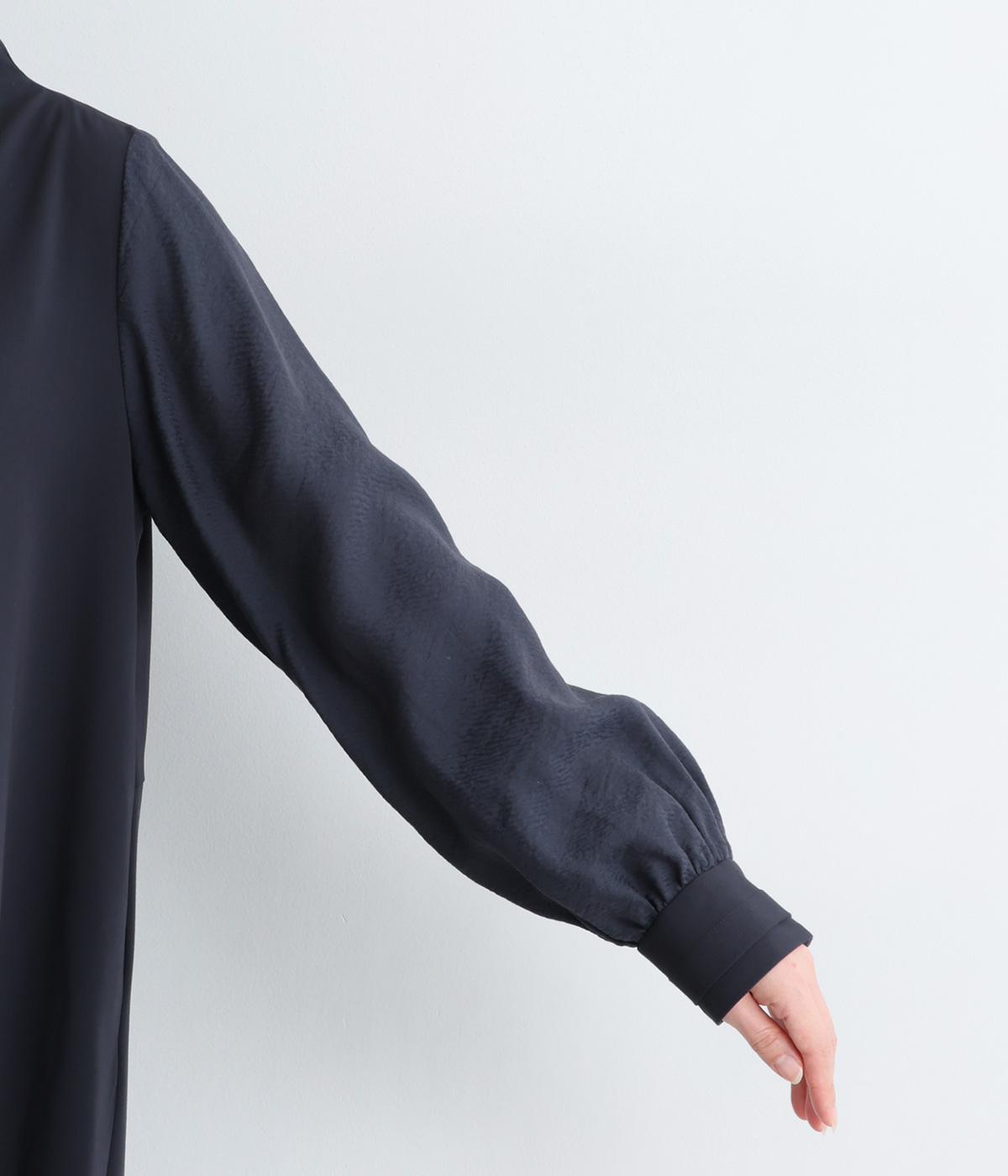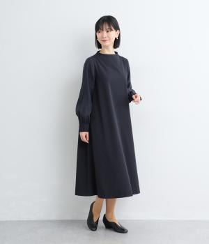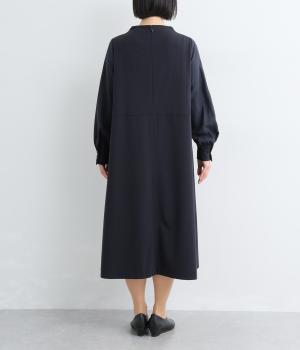 身頃部分と袖の生地の使い分けで、シンプルながらもデザイン性のあるワンピースです。身頃はすとんとシンプルなストレートシルエットに。袖には太めのタックを入れてボリュームを出すことで、バランスの良いシルエットを演出しています。