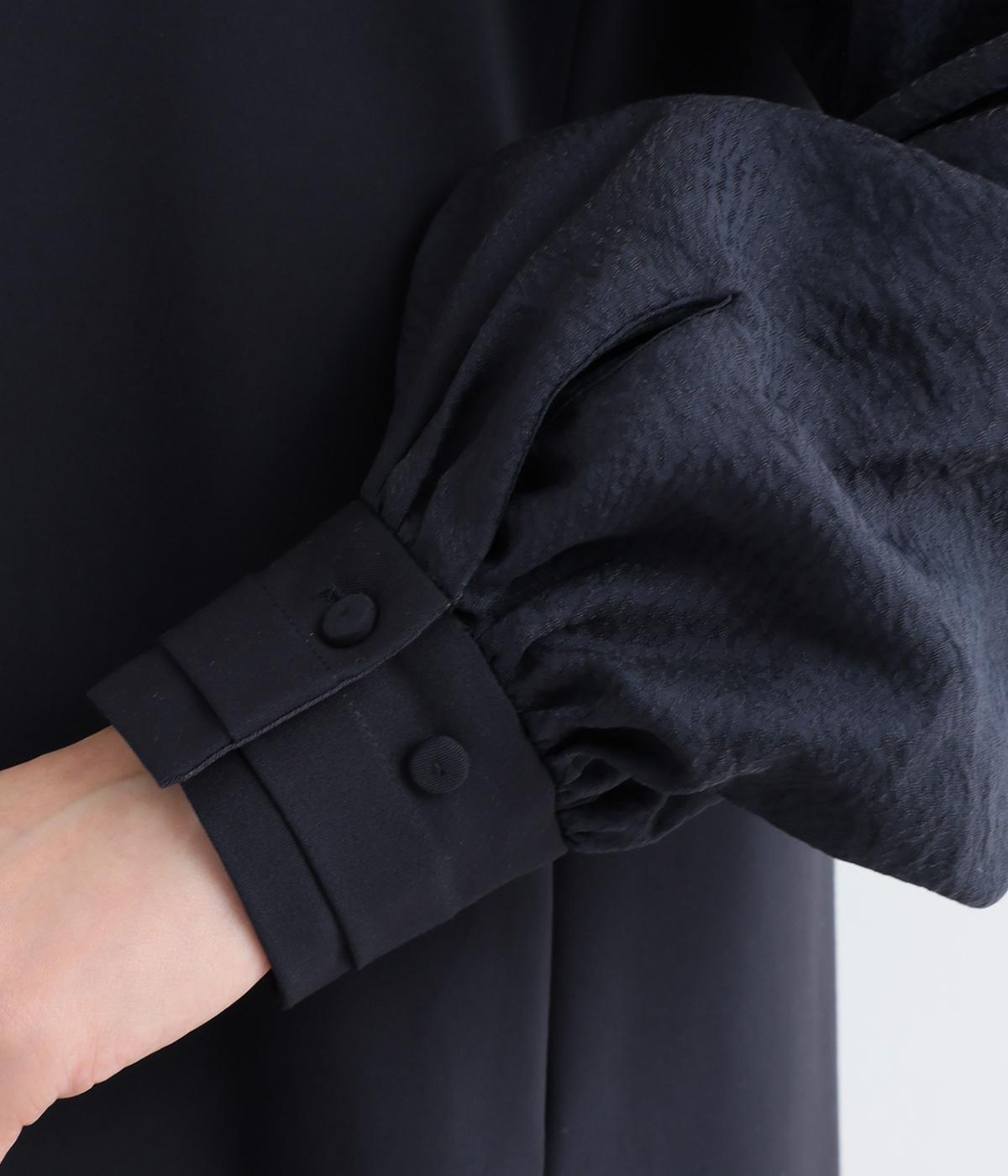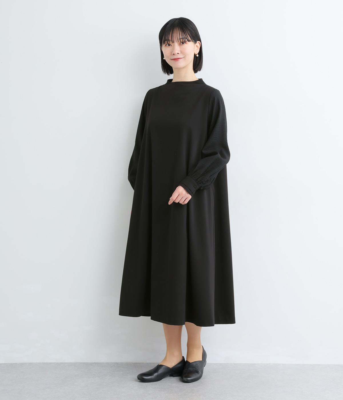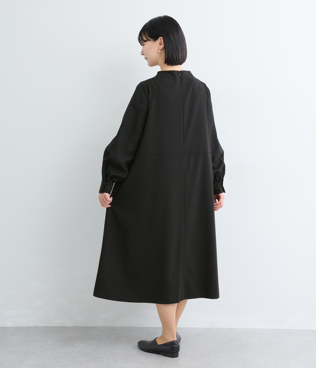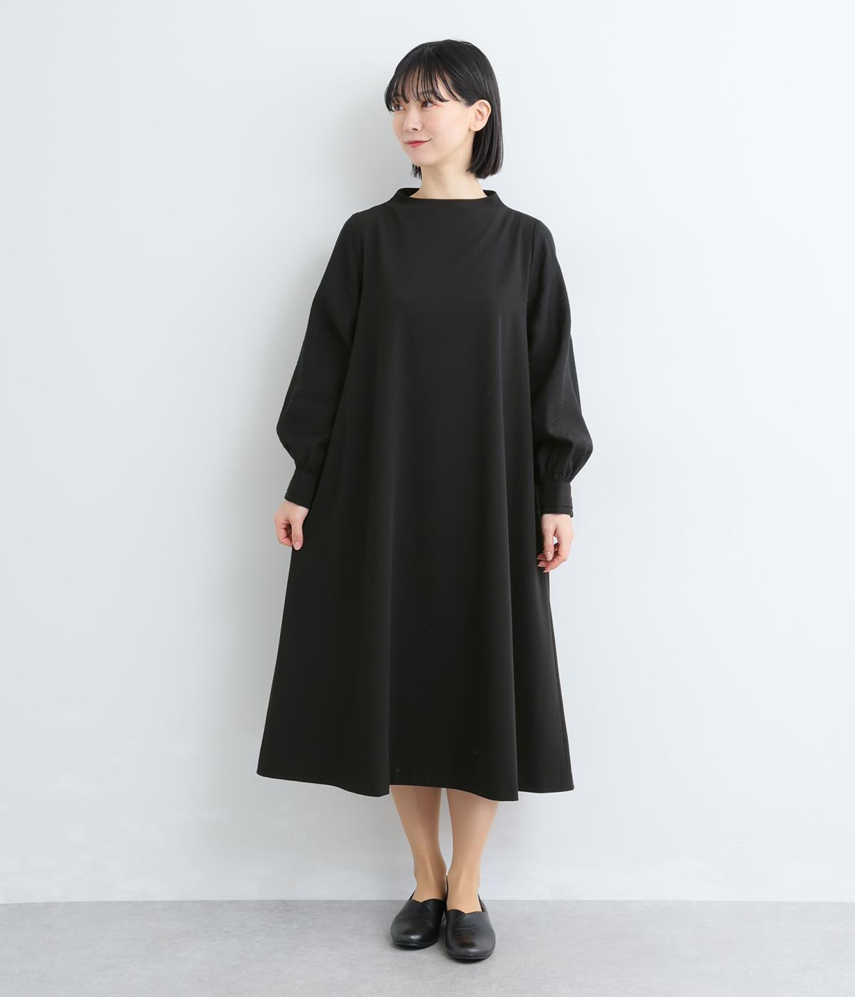 身頃部分と袖の生地の使い分けで、シンプルながらもデザイン性のあるワンピースです。身頃はすとんとシンプルなストレートシルエットに。袖には太めのタックを入れてボリュームを出すことで、バランスの良いシルエットを演出しています。