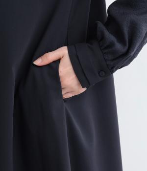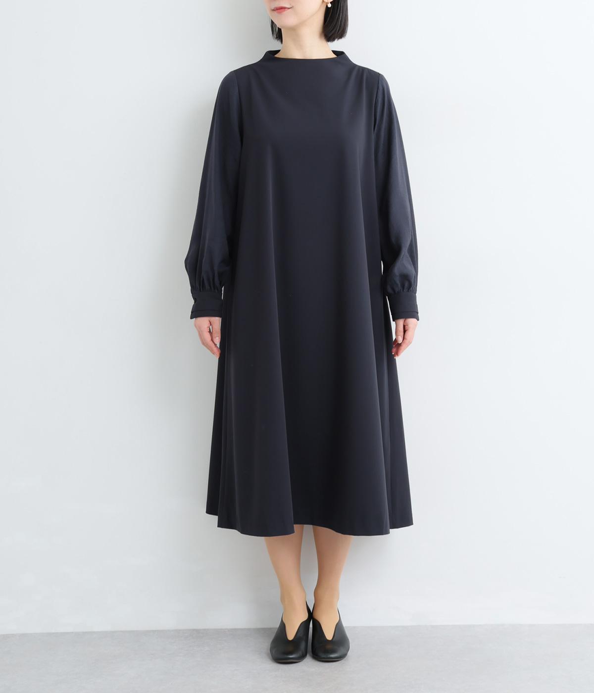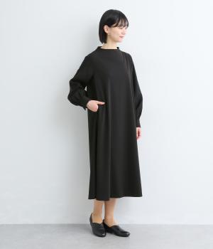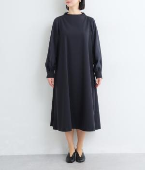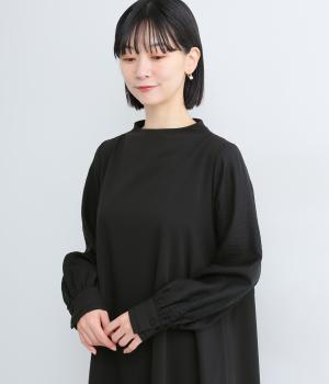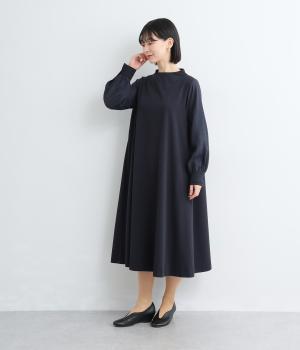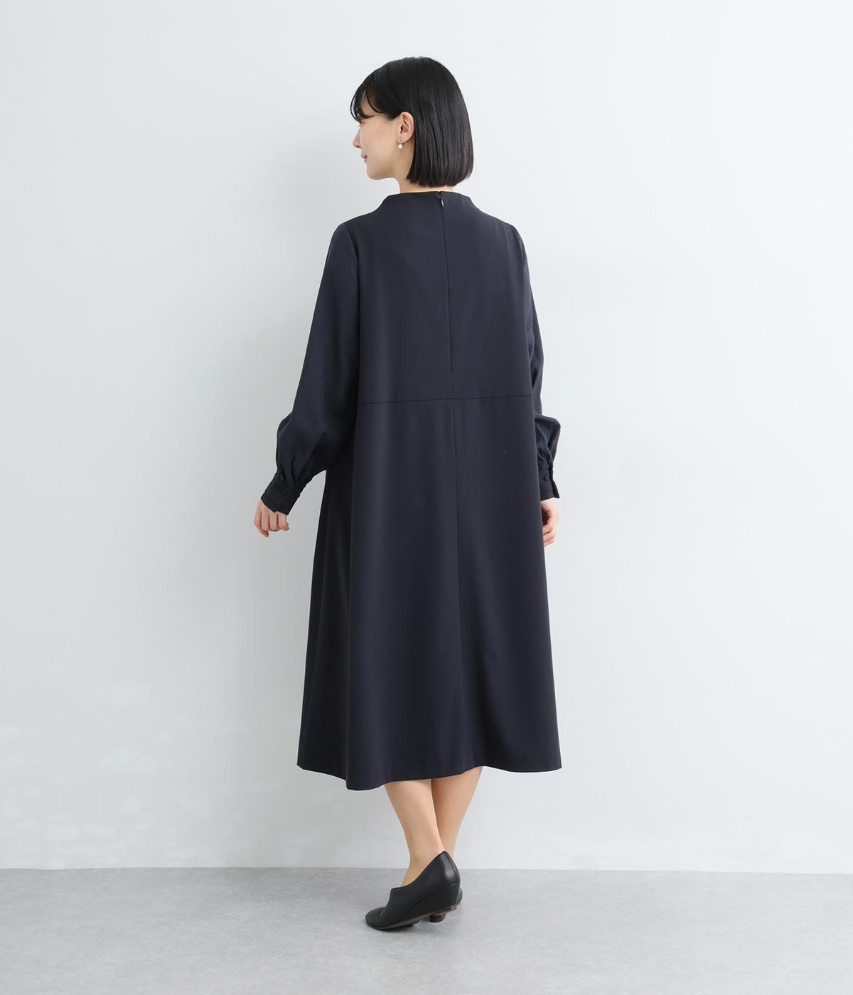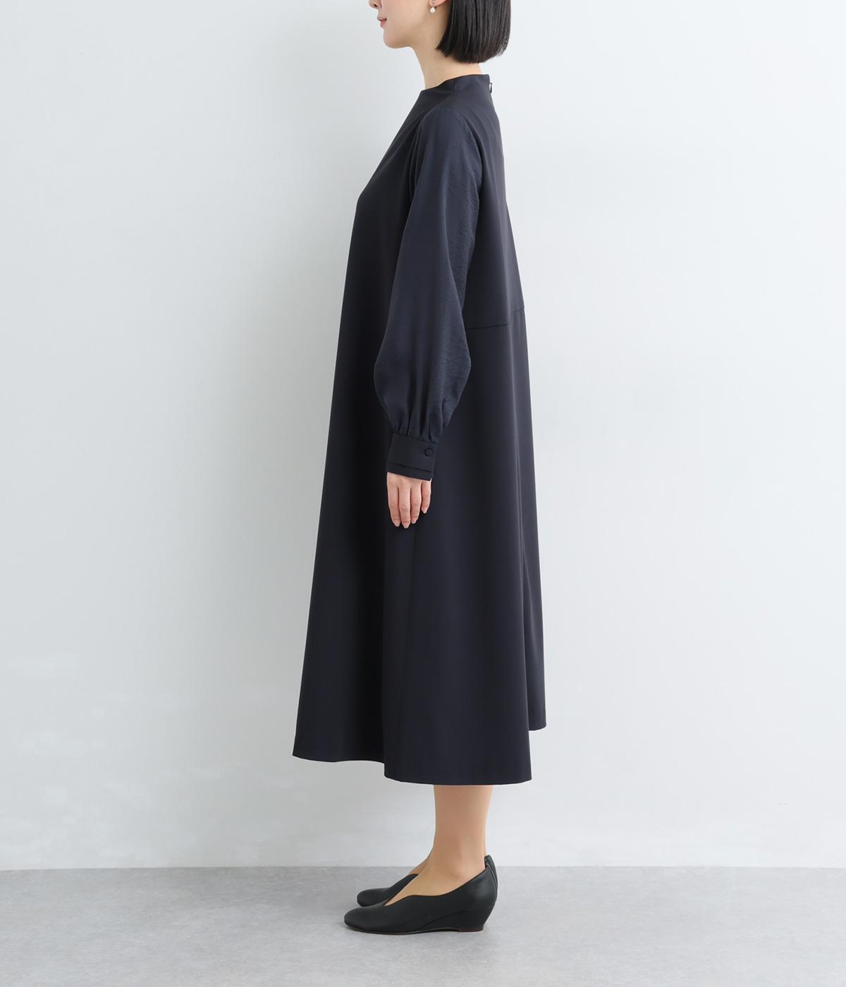 身頃部分と袖の生地の使い分けで、シンプルながらもデザイン性のあるワンピースです。身頃はすとんとシンプルなストレートシルエットに。袖には太めのタックを入れてボリュームを出すことで、バランスの良いシルエットを演出しています。