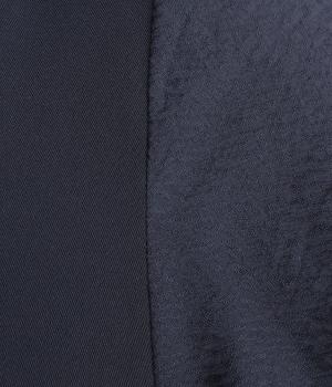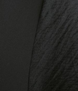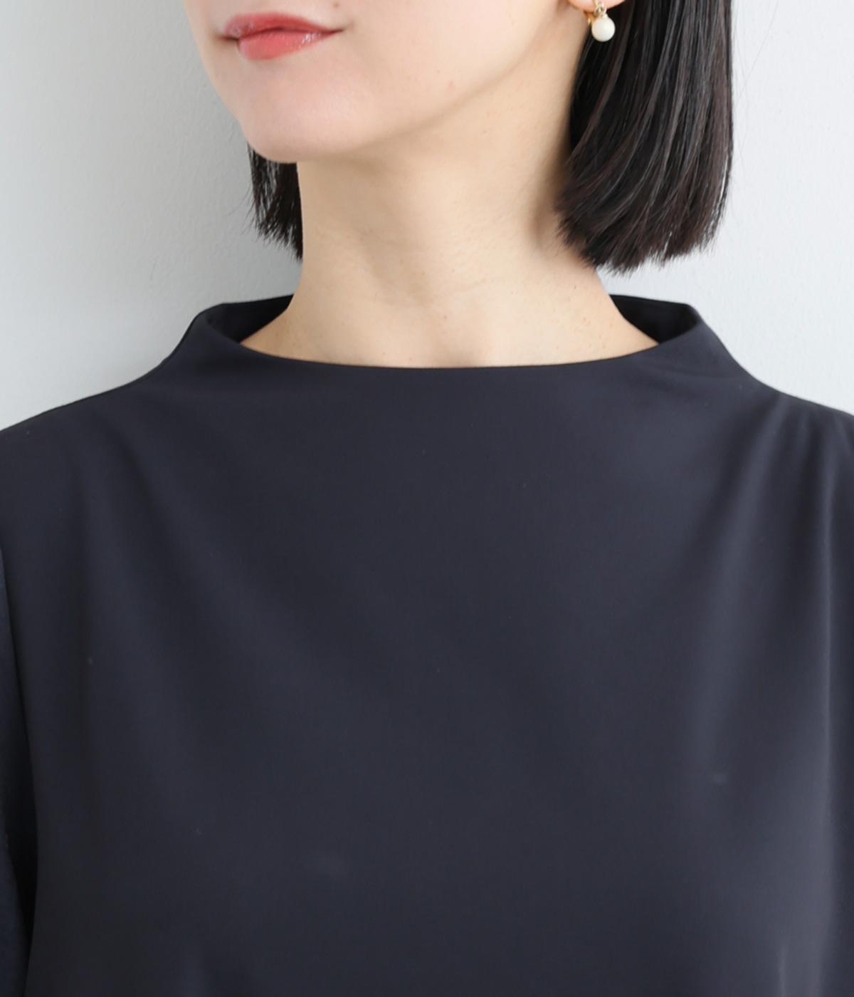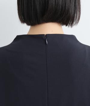 身頃部分はほどよく光沢のある上品なレーヨン混素材を使用しています。なめらかでしわになりにくく、ストレッチ性もあるので動きやすい素材です。袖はほどよく透け感のあるジャカード織りで、ほのかな光沢感が特徴です。