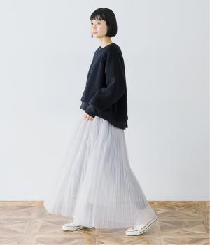 フェミニンなチュールスカートを合わせ、可憐な装いに仕上げました。シックなネイビーが印象を引き締め、ふんわりとした女性らしいシルエット引き立てます。