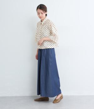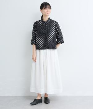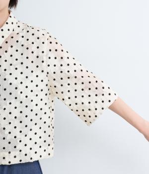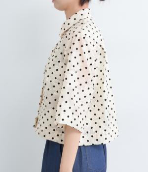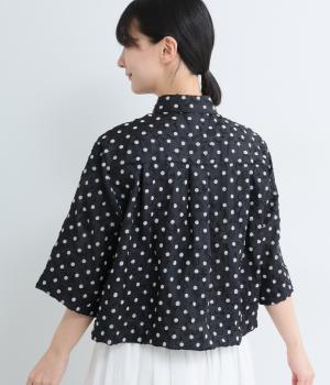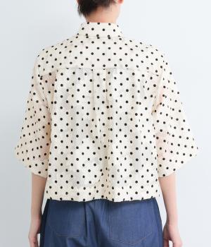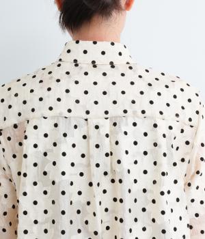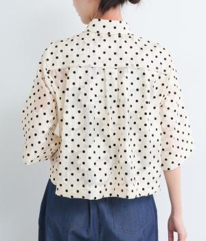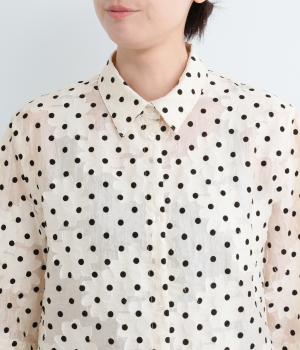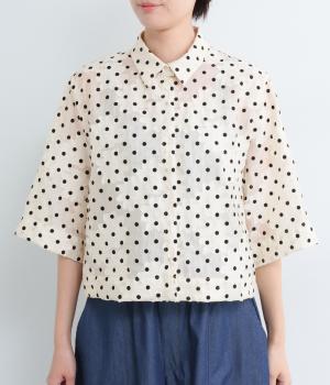 ドット×フラワーの華やかな模様をシアー素材で軽やかにまとめました。ベーシックなボックスシルエットで着こなしやすく、襟つきで適度なきちんと感も◎。ひじにかかる五分袖はメインで着たり長袖を重ねたりとロングシーズン着まわせます。