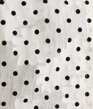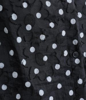 ほんのりとした光沢感とシアーな質感が特徴的で繊細な薄手素材にフロッキー加工をほどこしました。ドットと花柄が奥行きのある表情をつけています。