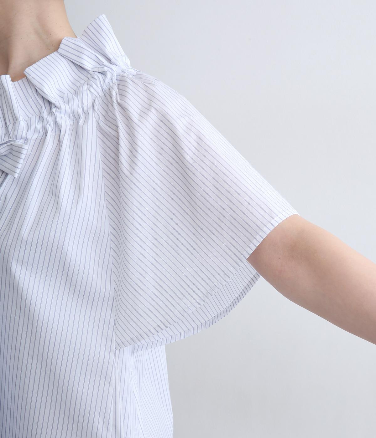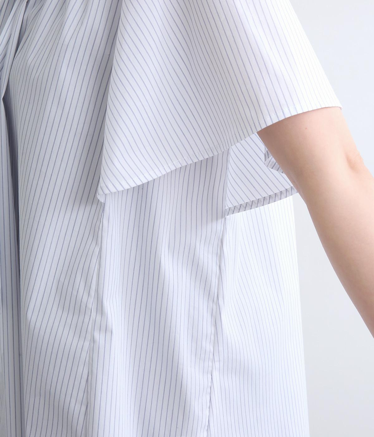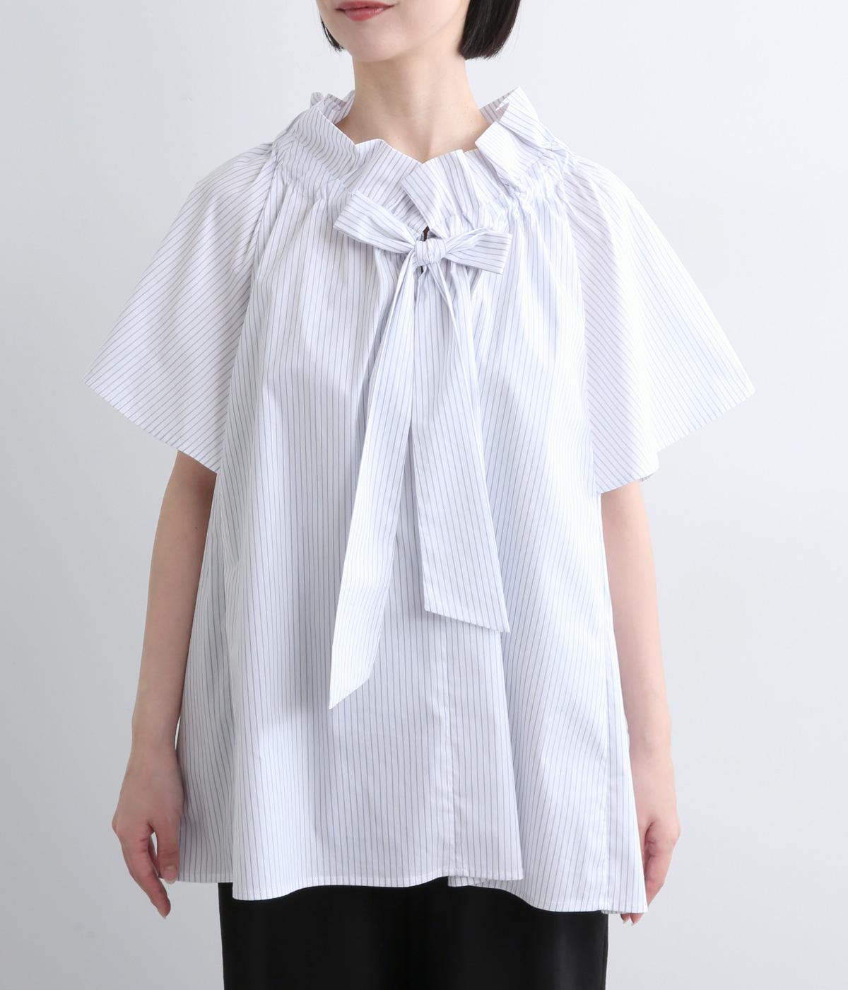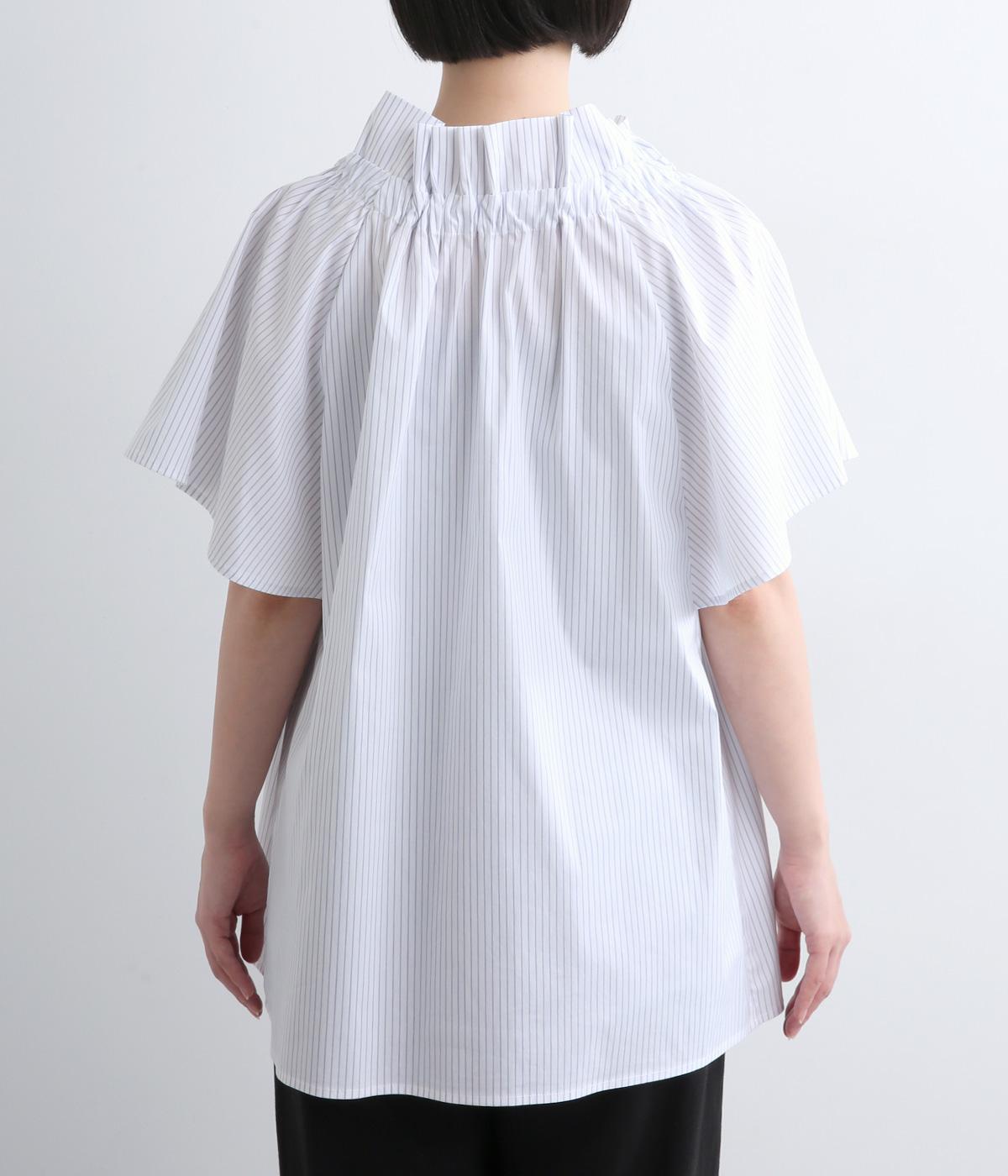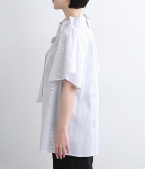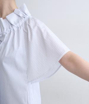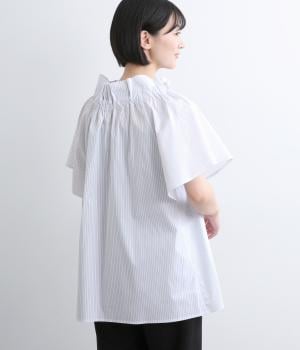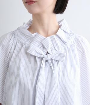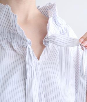 コットンドビーストライプ フリルネック刺繍入りチュニック
