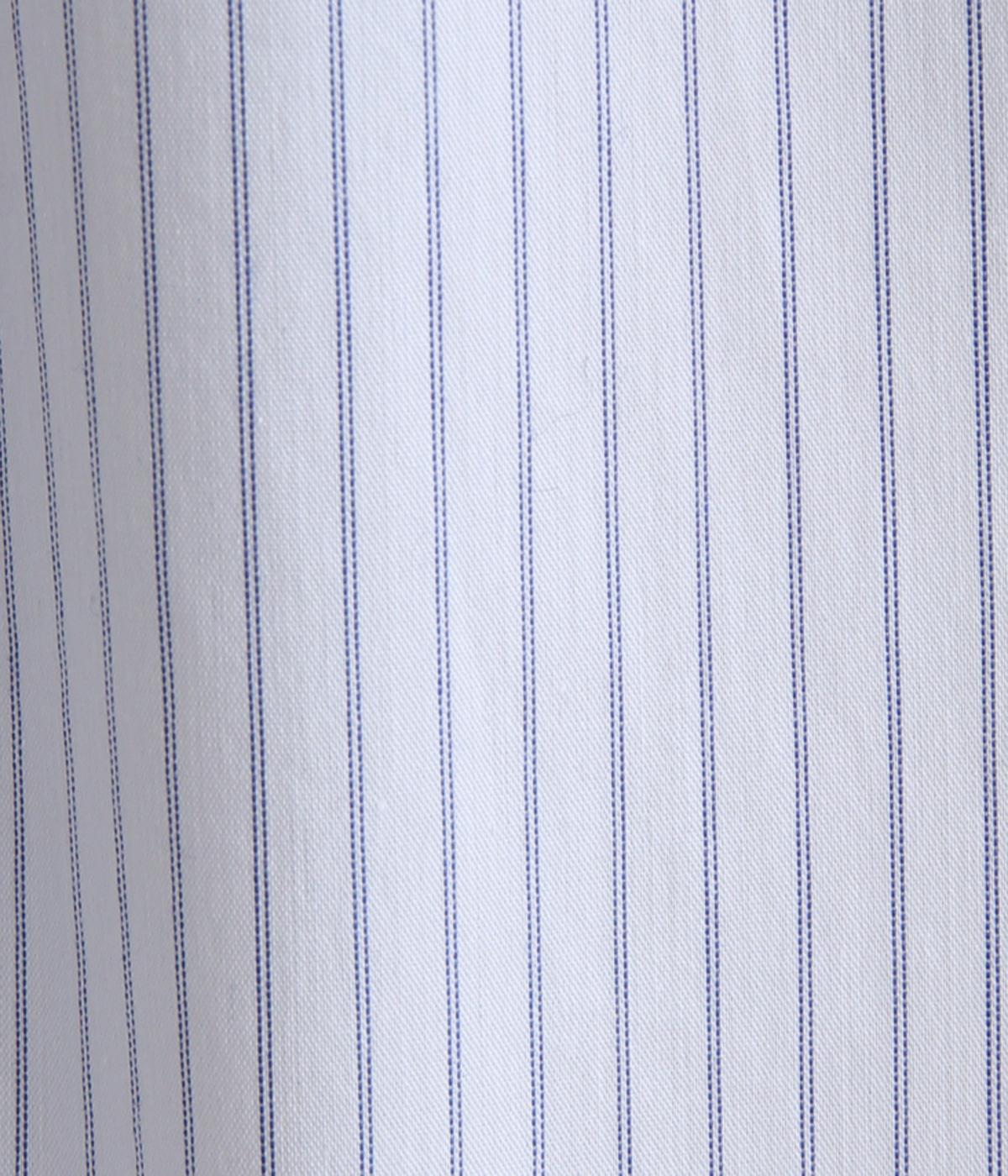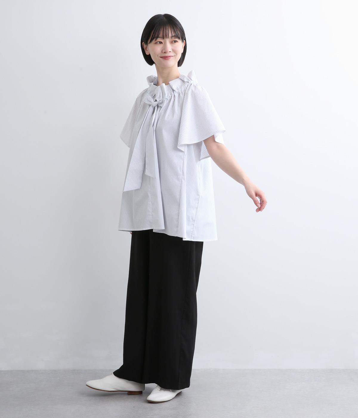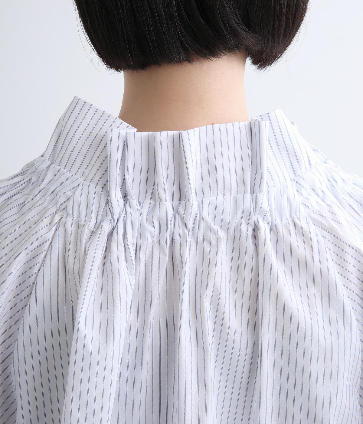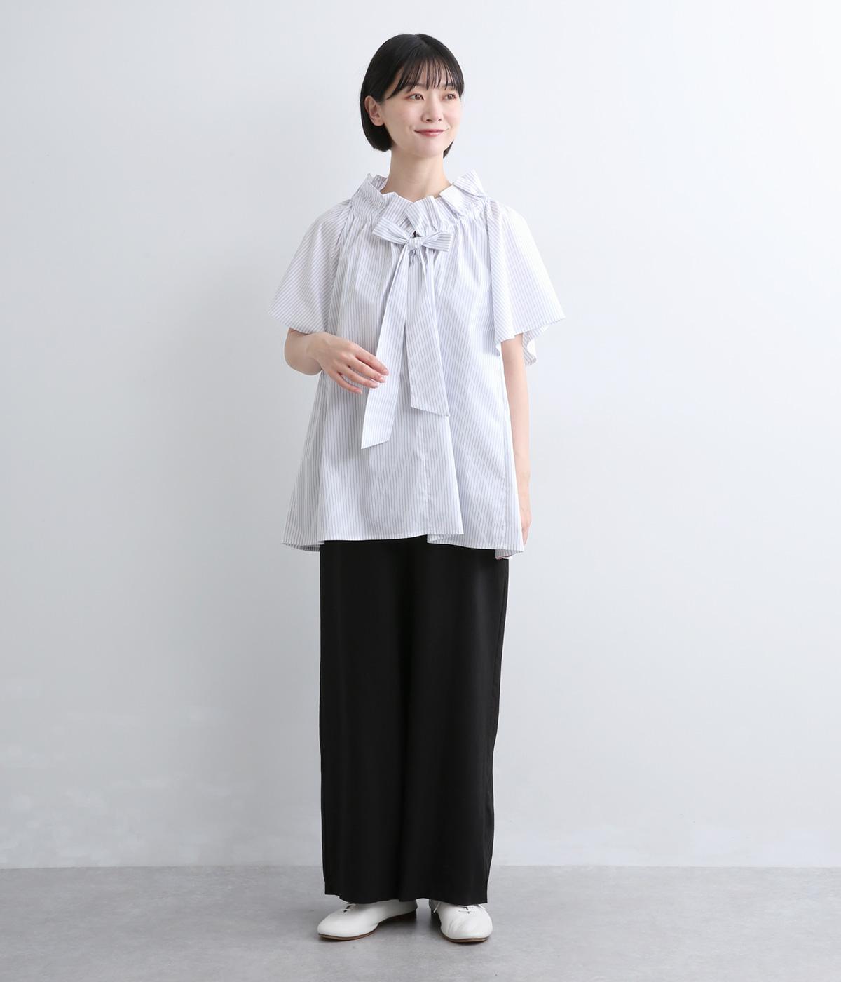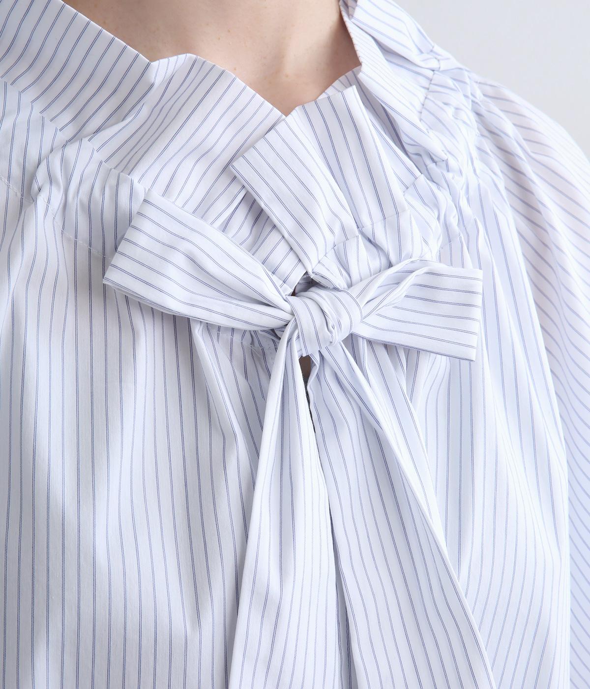 コットンドビーストライプ フリルネック刺繍入りチュニック