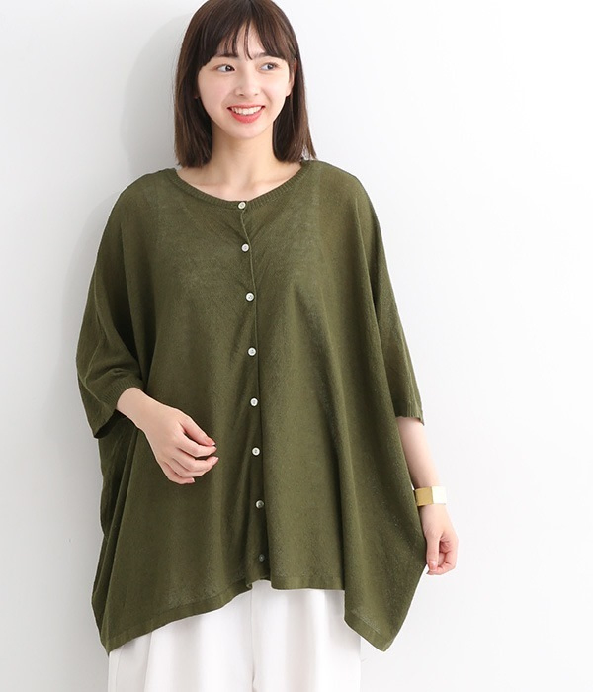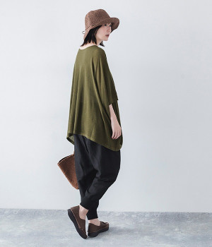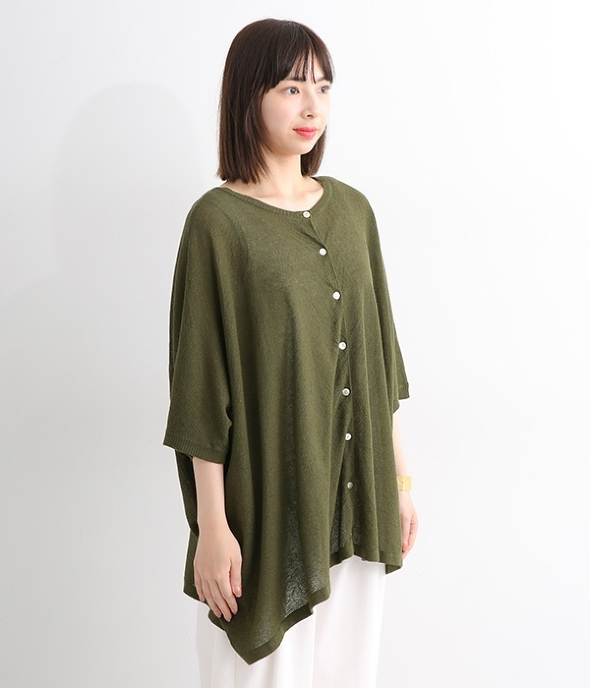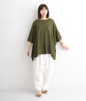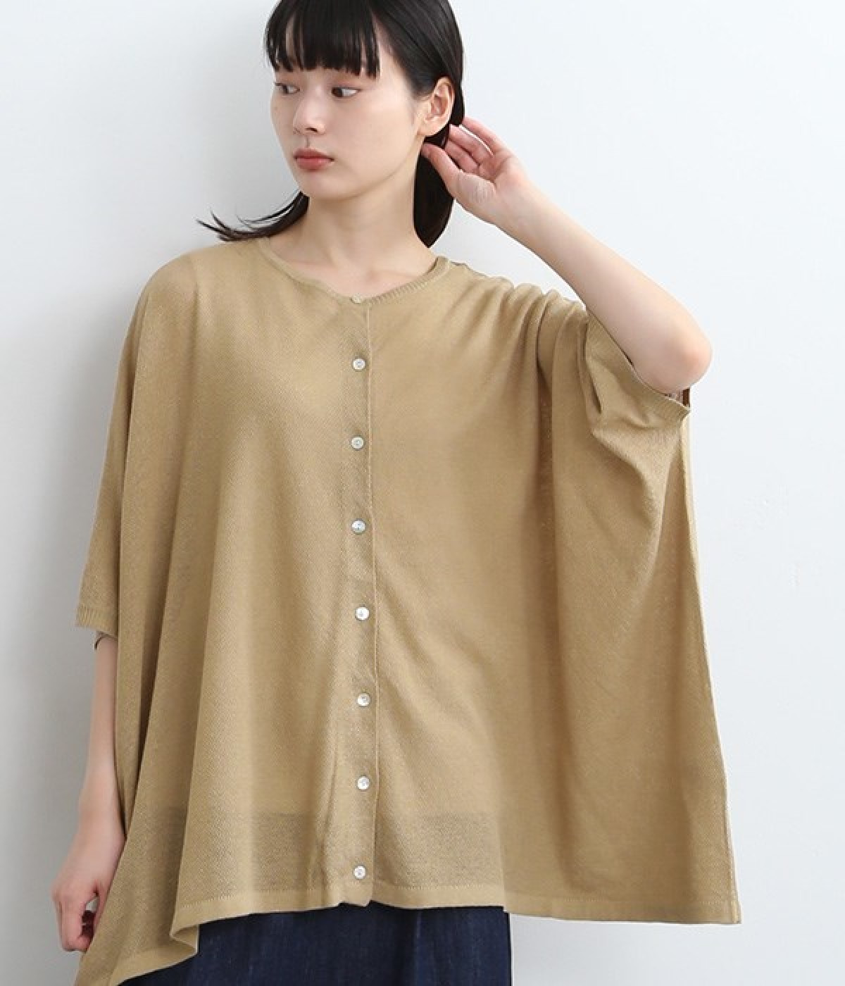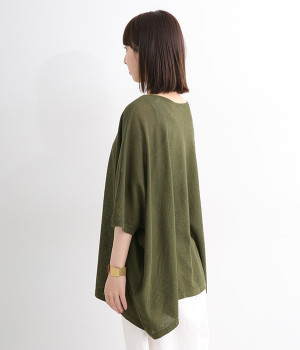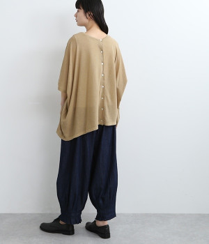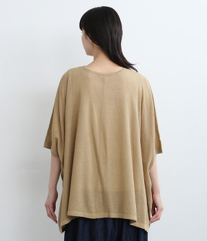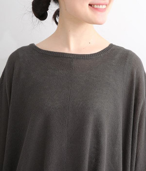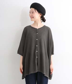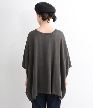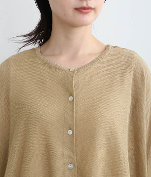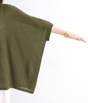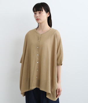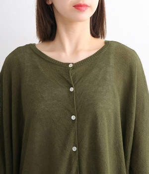ざっくりと仕立てたカノコ編みで風通しに優れ、涼しく着こなせるニットカーディガン。ひじが隠れる長さの袖丈で、贅沢にゆとりを持たせたポンチョ型シルエットです。サイドがゆったり落ちる豊かなドレープの表情が大人らしい装いを盛り上げます。前後をお好みで変えることができる2WAY仕様なので、カットソーなどに軽く羽織るのはもちろん、ボタンを後ろにしてプルオーバーとしても活躍。首まわりにも余裕があるため襟付きのトップスにも好バランスです。