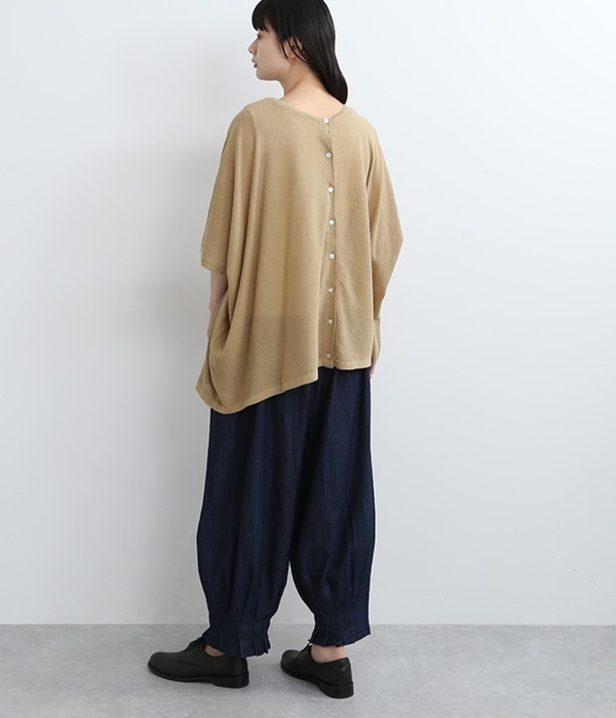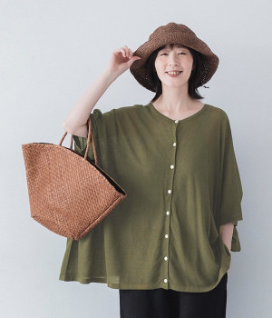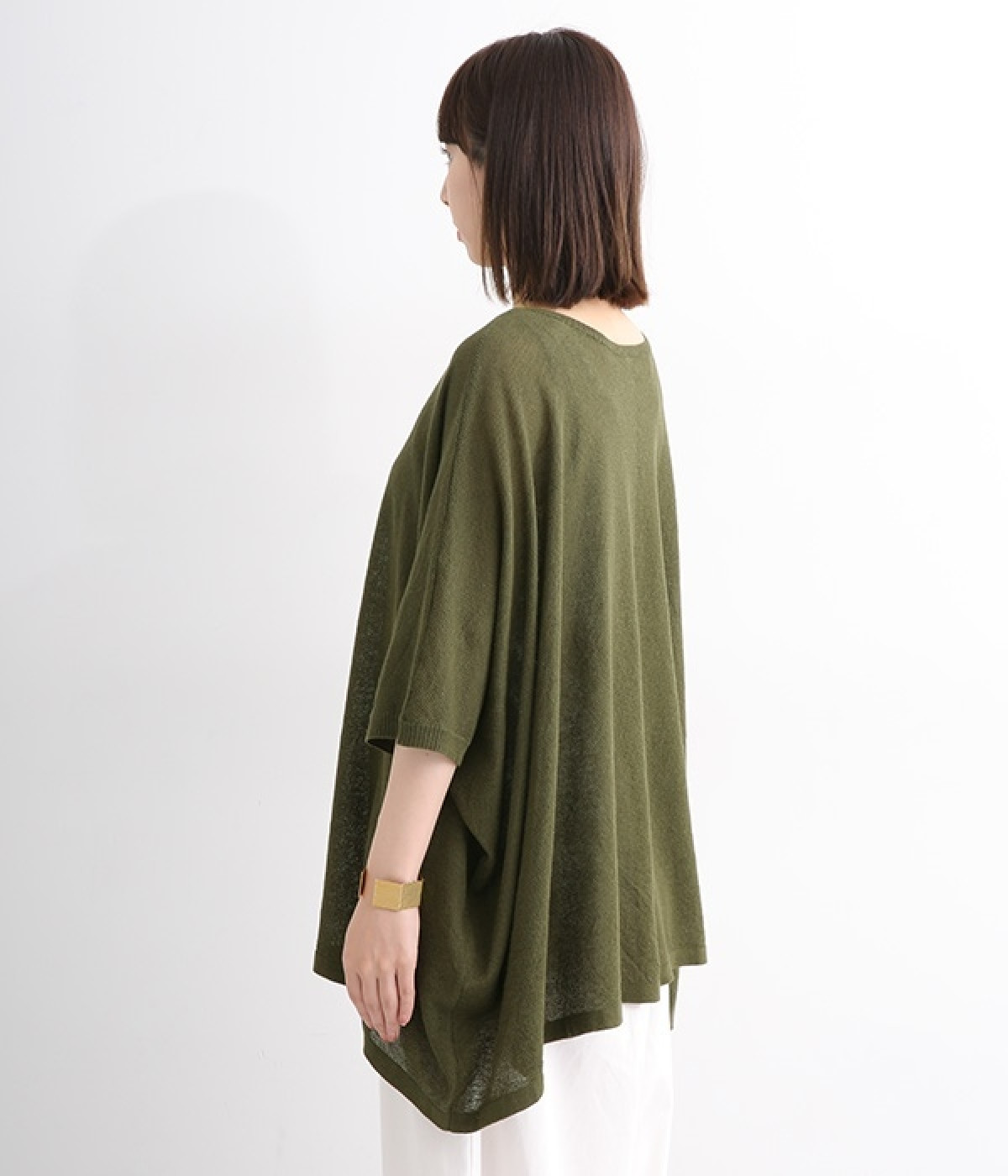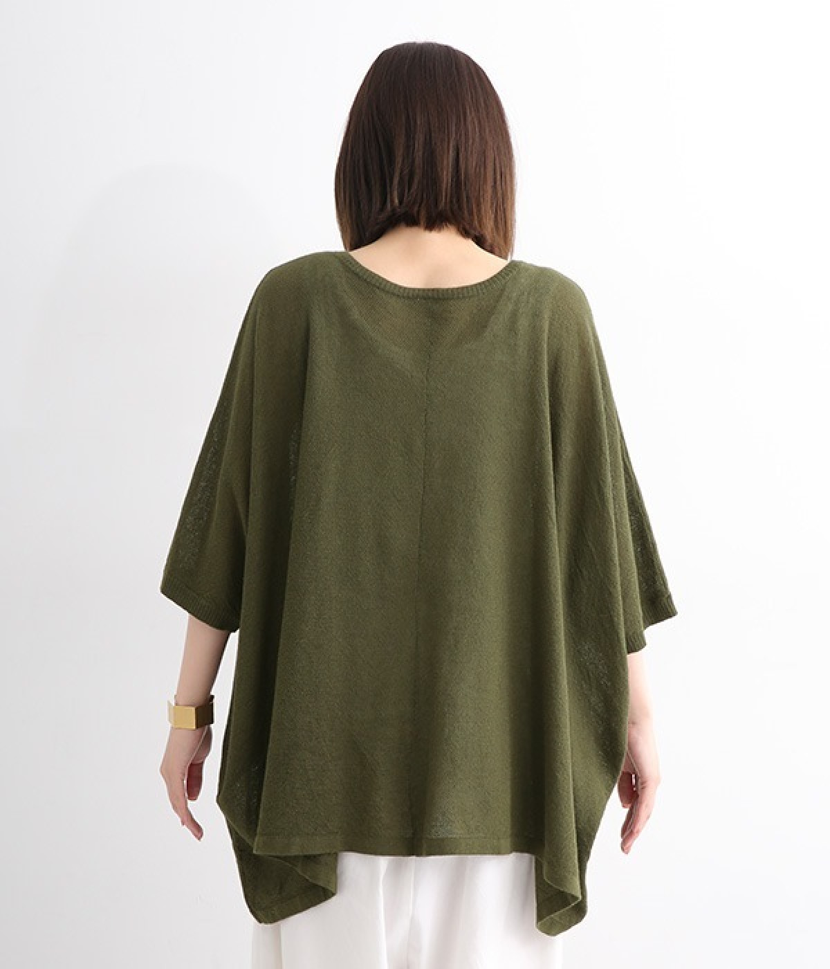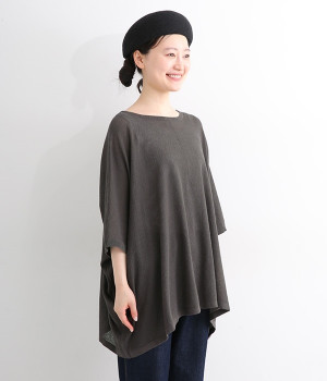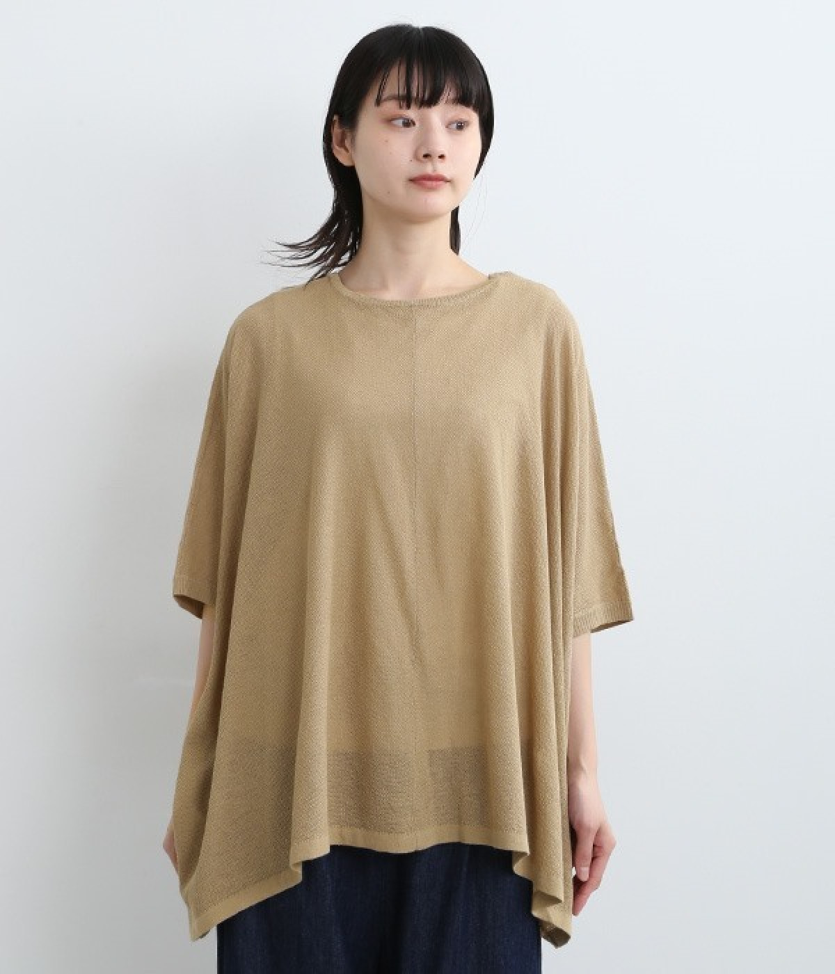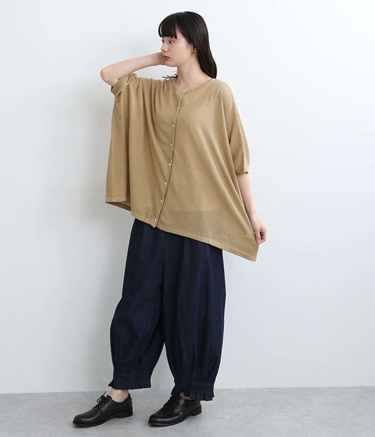 ざっくりと仕立てたカノコ編みで風通しに優れ、涼しく着こなせるニットカーディガン。ひじが隠れる長さの袖丈で、贅沢にゆとりを持たせたポンチョ型シルエットです。サイドがゆったり落ちる豊かなドレープの表情が大人らしい装いを盛り上げます。前後をお好みで変えることができる2WAY仕様なので、カットソーなどに軽く羽織るのはもちろん、ボタンを後ろにしてプルオーバーとしても活躍。首まわりにも余裕があるため襟付きのトップスにも好バランスです。