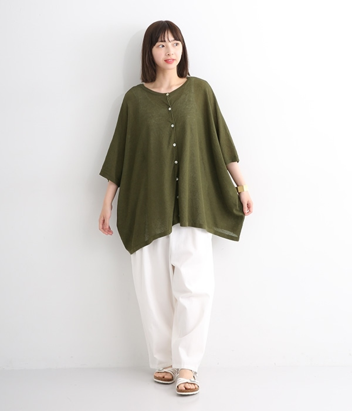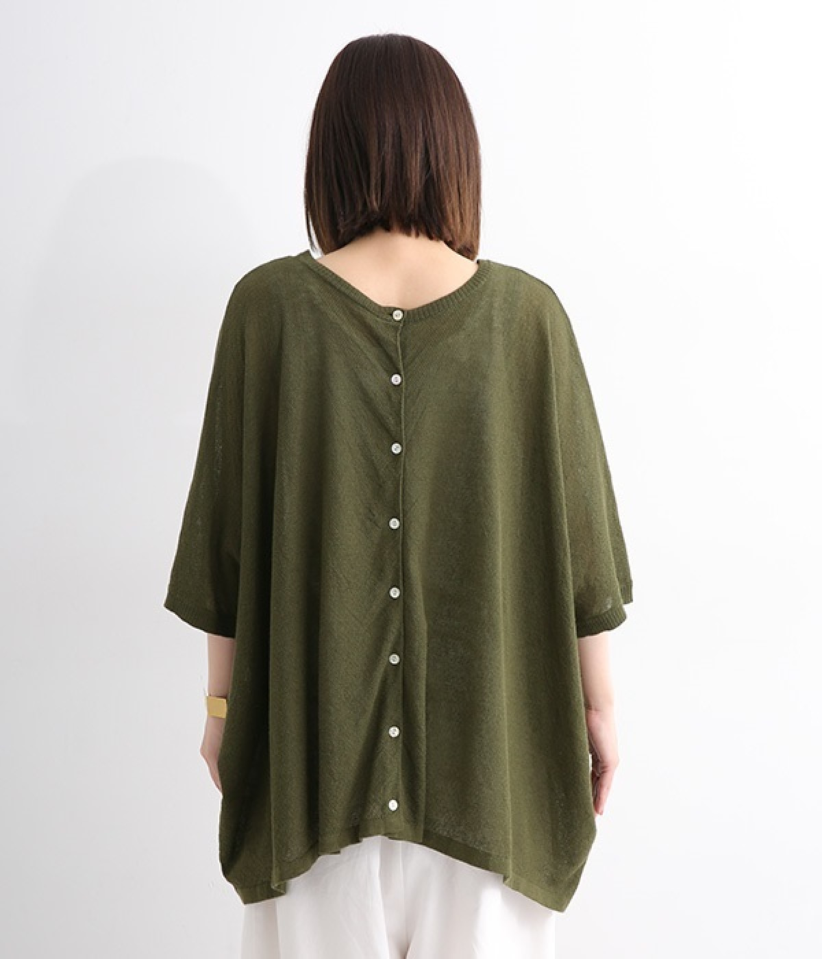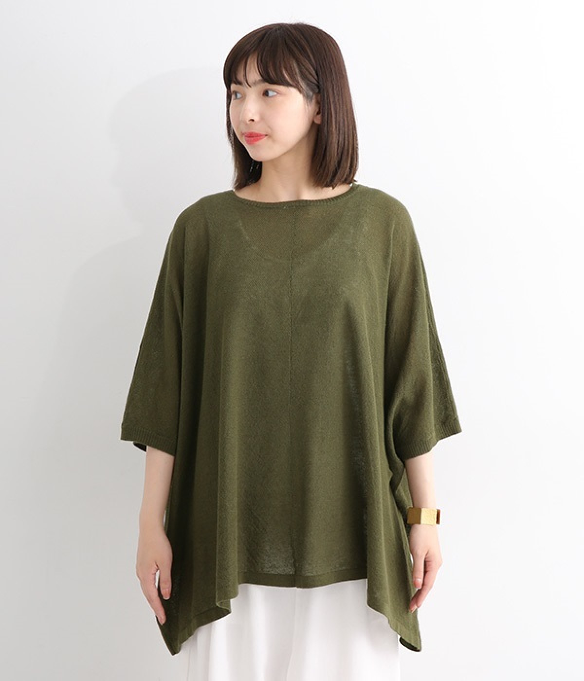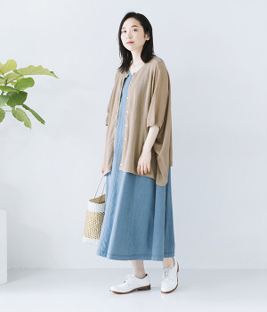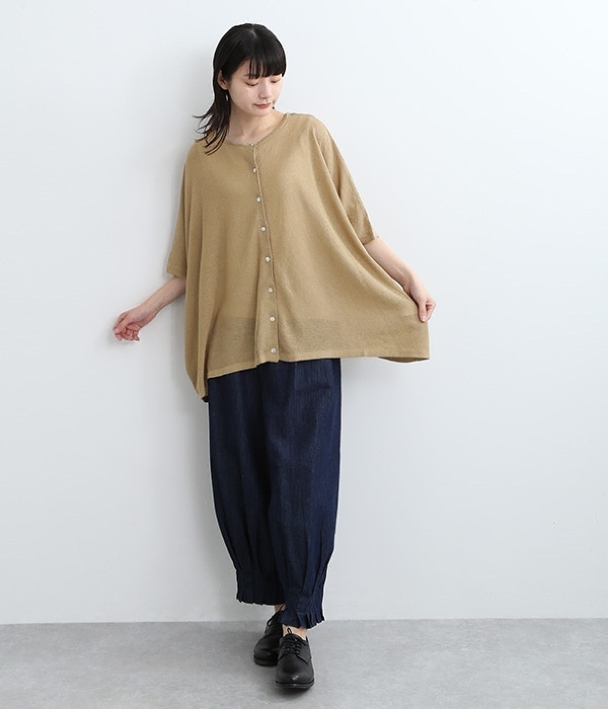 ざっくりと仕立てたカノコ編みで風通しに優れ、涼しく着こなせるニットカーディガン。ひじが隠れる長さの袖丈で、贅沢にゆとりを持たせたポンチョ型シルエットです。サイドがゆったり落ちる豊かなドレープの表情が大人らしい装いを盛り上げます。前後をお好みで変えることができる2WAY仕様なので、カットソーなどに軽く羽織るのはもちろん、ボタンを後ろにしてプルオーバーとしても活躍。首まわりにも余裕があるため襟付きのトップスにも好バランスです。