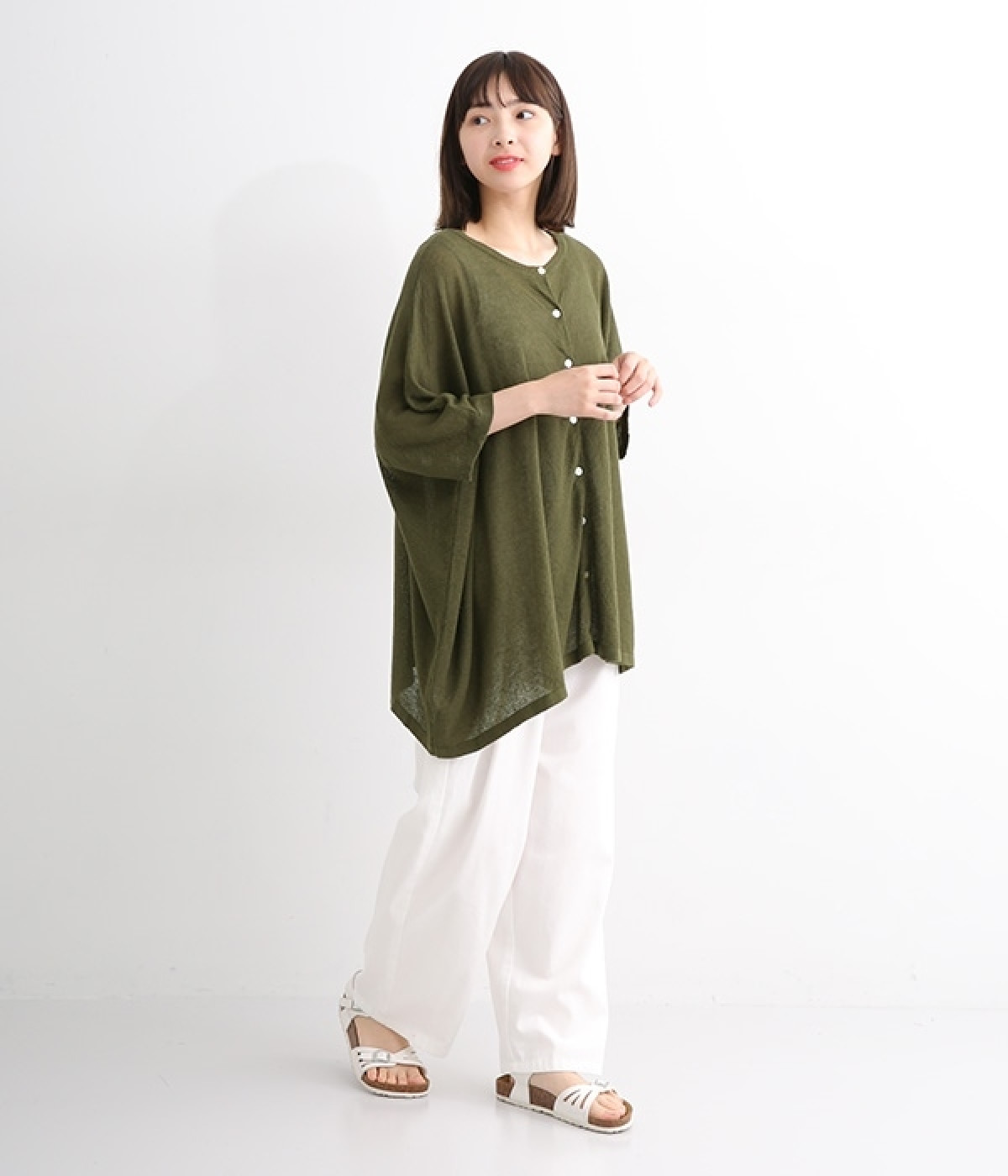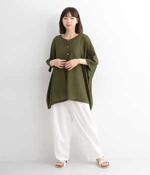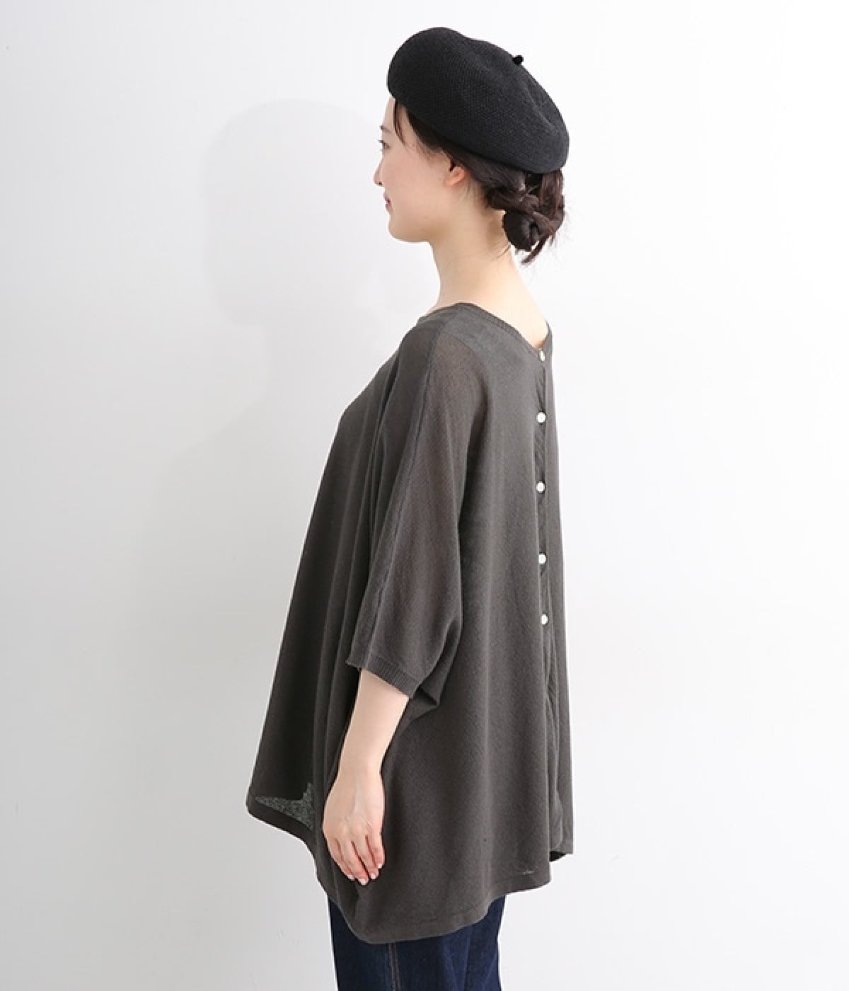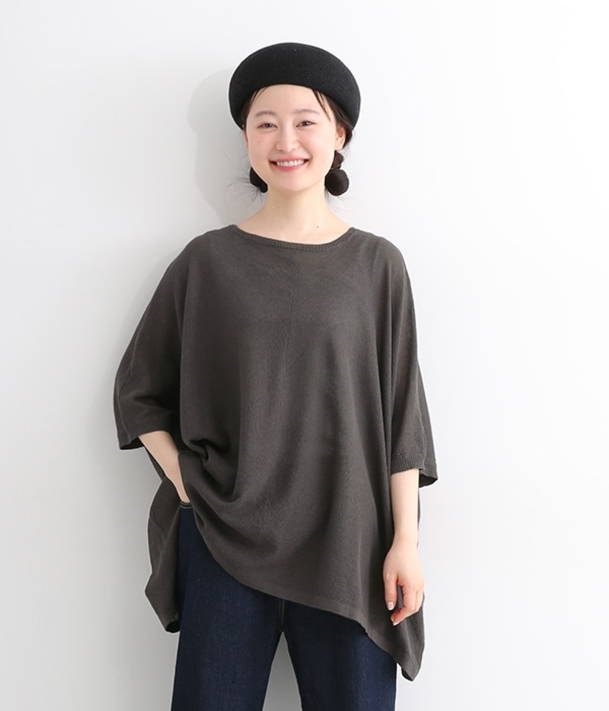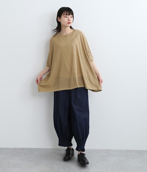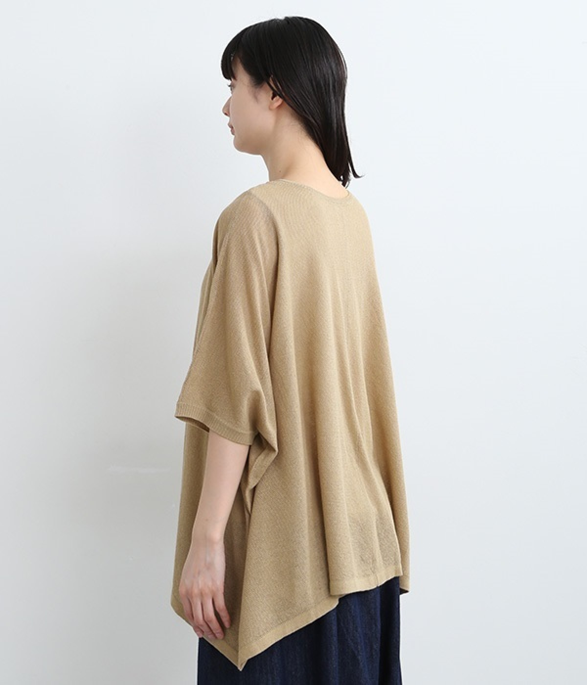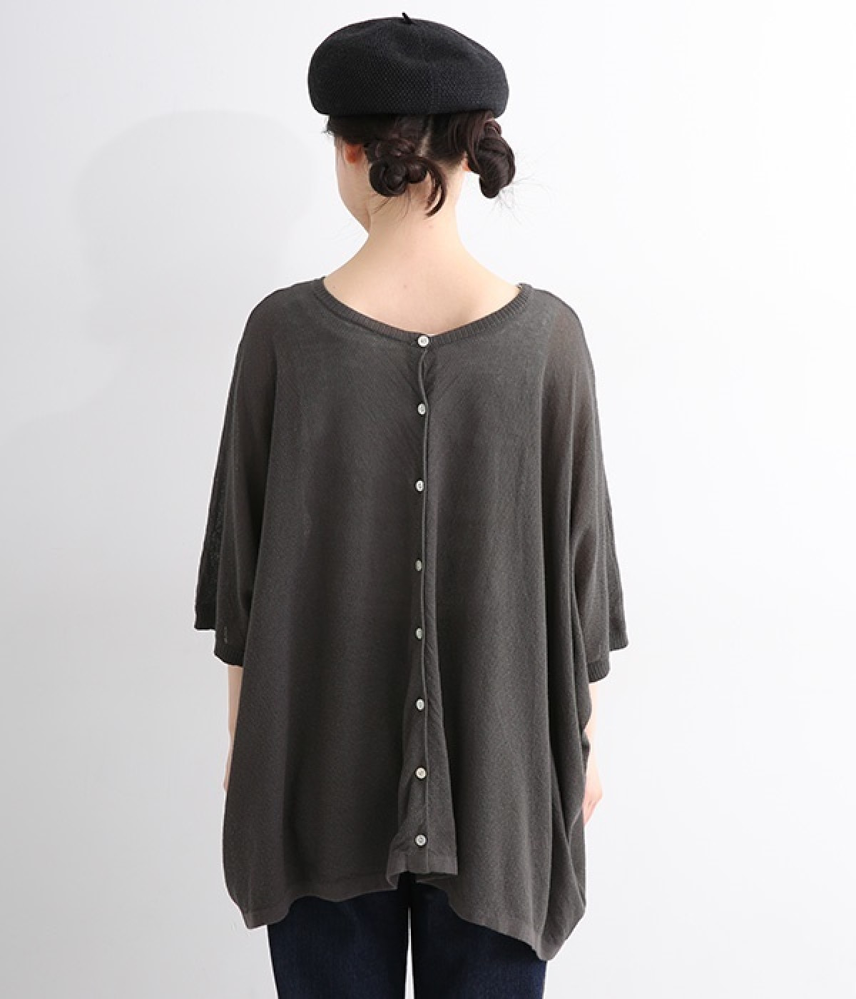 ざっくりと仕立てたカノコ編みで風通しに優れ、涼しく着こなせるニットカーディガン。ひじが隠れる長さの袖丈で、贅沢にゆとりを持たせたポンチョ型シルエットです。サイドがゆったり落ちる豊かなドレープの表情が大人らしい装いを盛り上げます。前後をお好みで変えることができる2WAY仕様なので、カットソーなどに軽く羽織るのはもちろん、ボタンを後ろにしてプルオーバーとしても活躍。首まわりにも余裕があるため襟付きのトップスにも好バランスです。