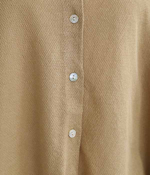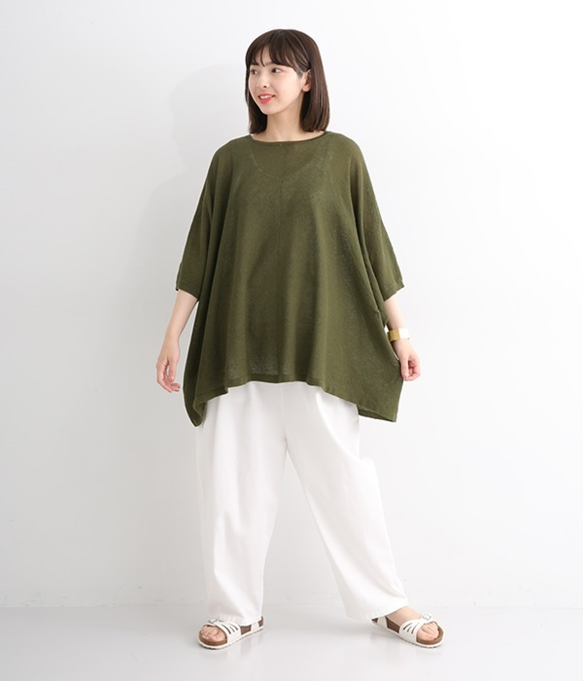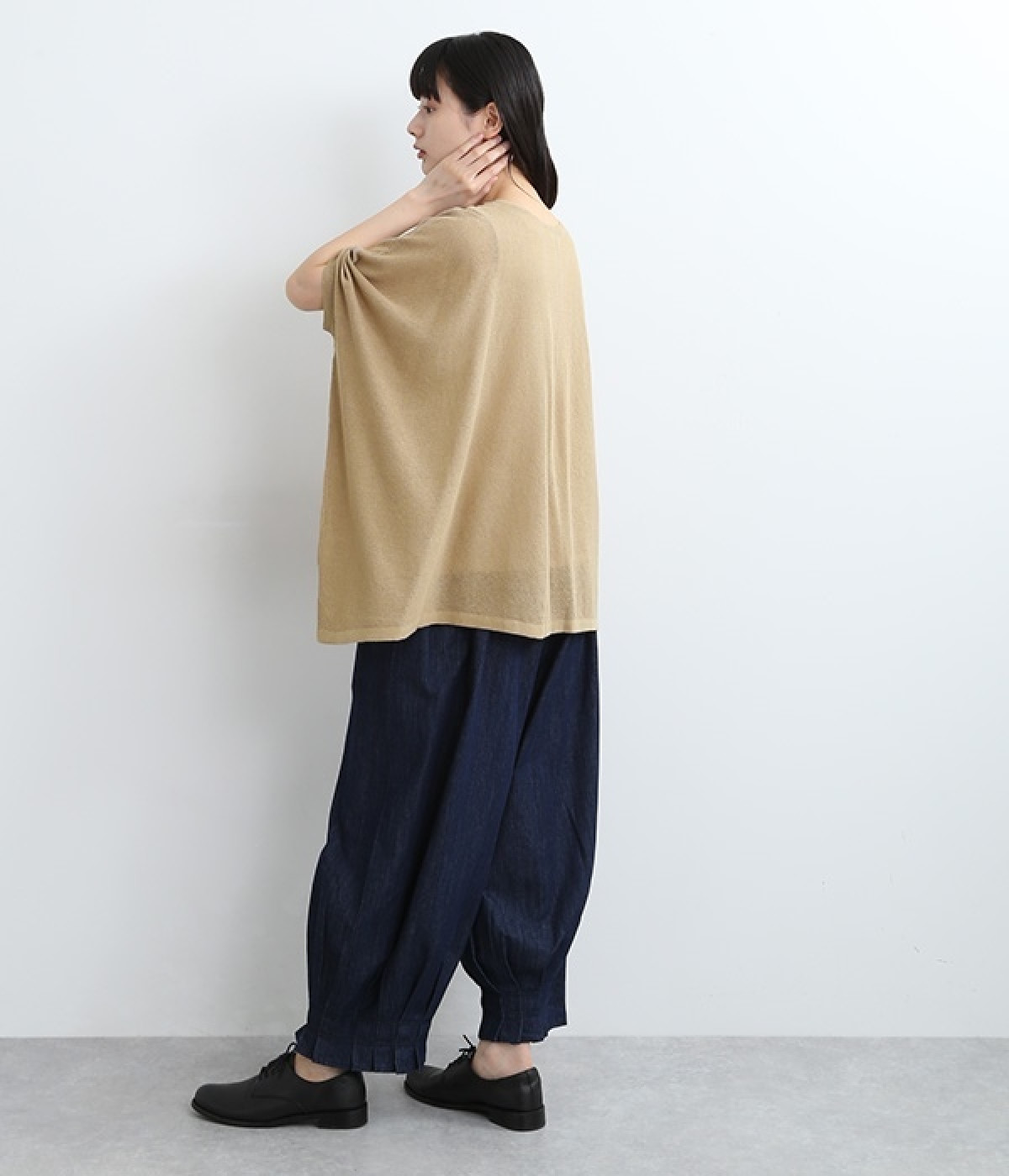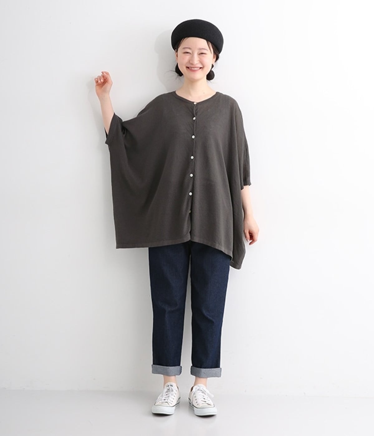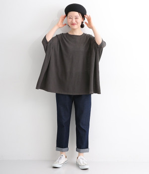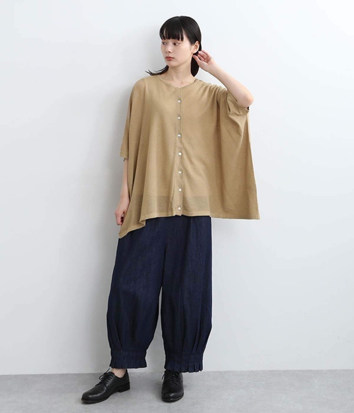 ざっくりと仕立てたカノコ編みで風通しに優れ、涼しく着こなせるニットカーディガン。ひじが隠れる長さの袖丈で、贅沢にゆとりを持たせたポンチョ型シルエットです。サイドがゆったり落ちる豊かなドレープの表情が大人らしい装いを盛り上げます。前後をお好みで変えることができる2WAY仕様なので、カットソーなどに軽く羽織るのはもちろん、ボタンを後ろにしてプルオーバーとしても活躍。首まわりにも余裕があるため襟付きのトップスにも好バランスです。