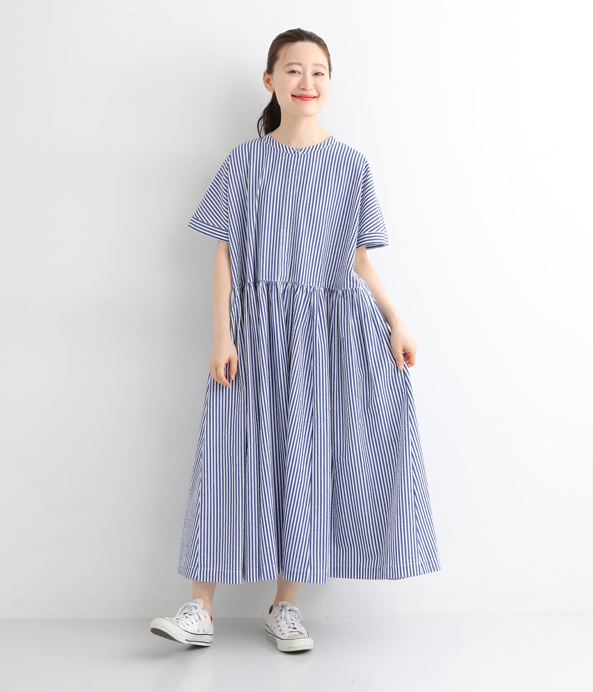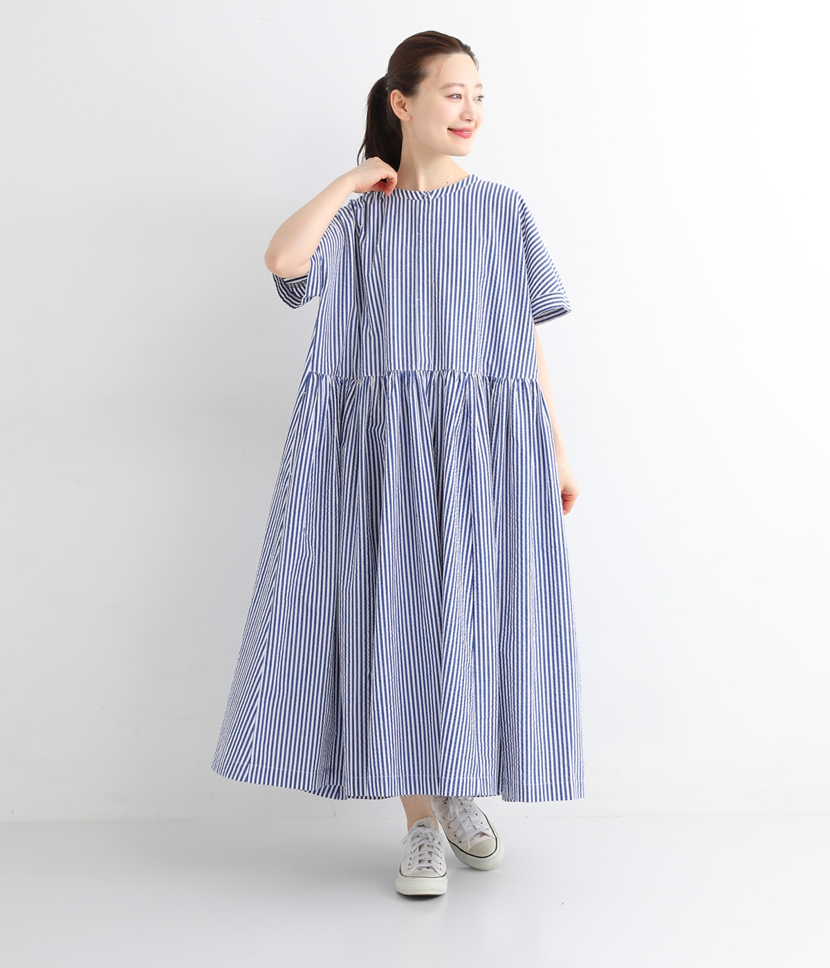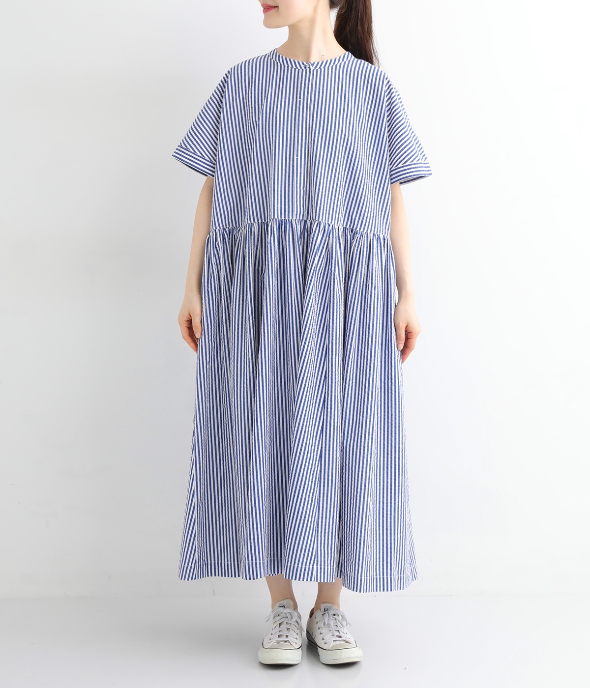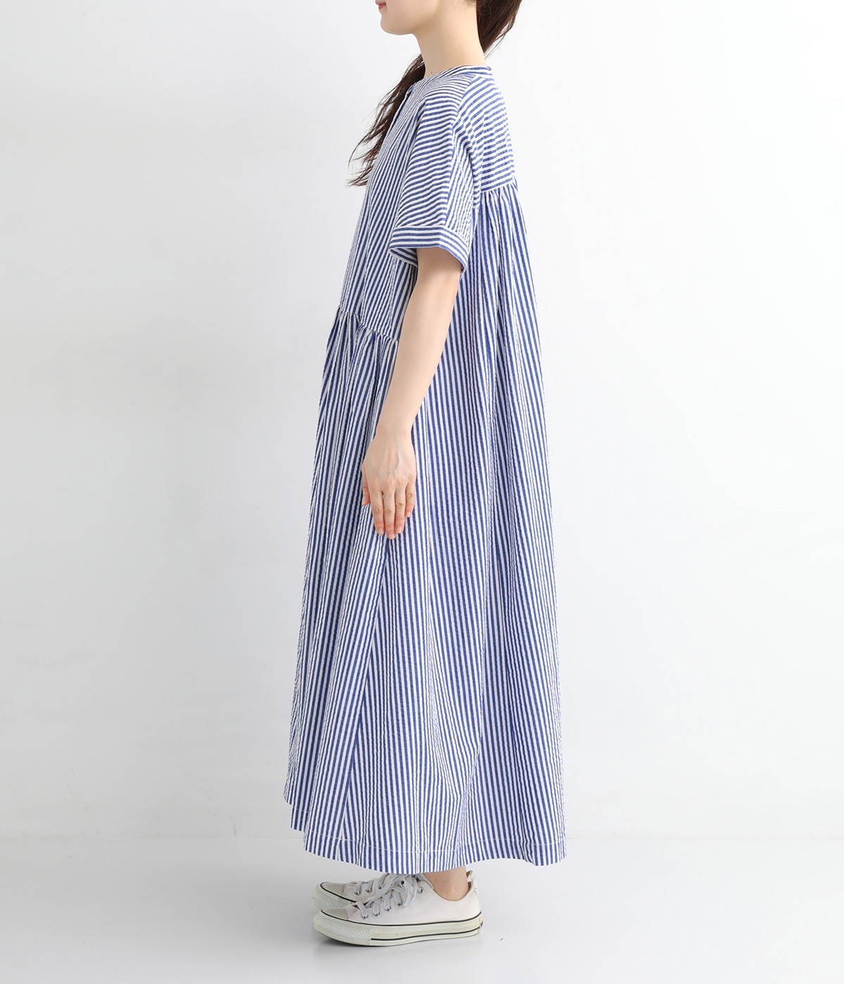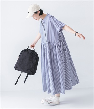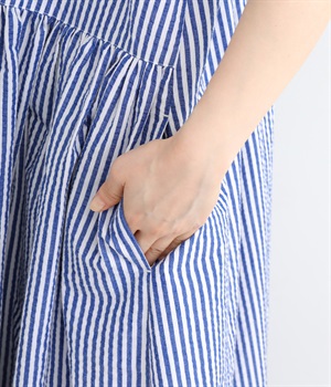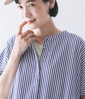 大人の夏コーデにちょうどいい、柔らかなトーンのブルーストライプ。縦のラインが強調されることで、スタイルアップ効果も期待できます。