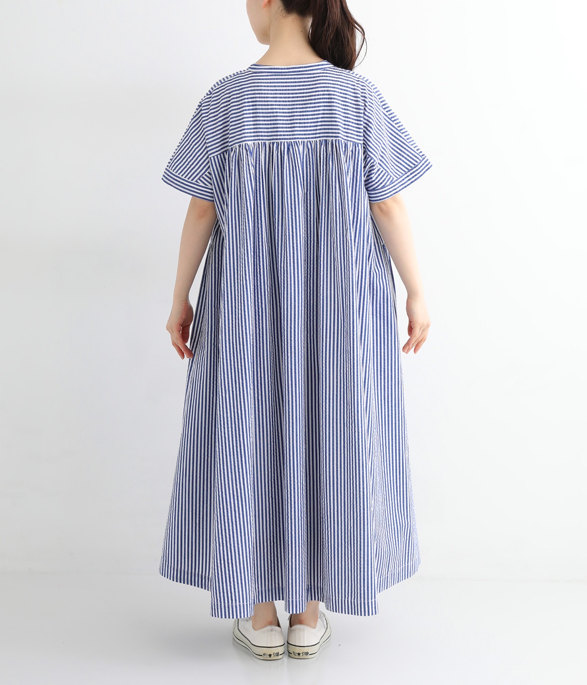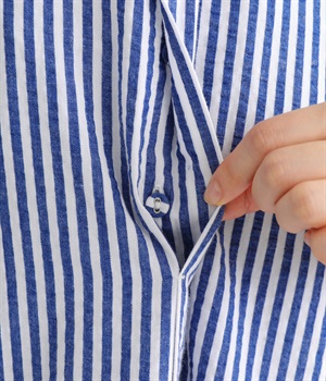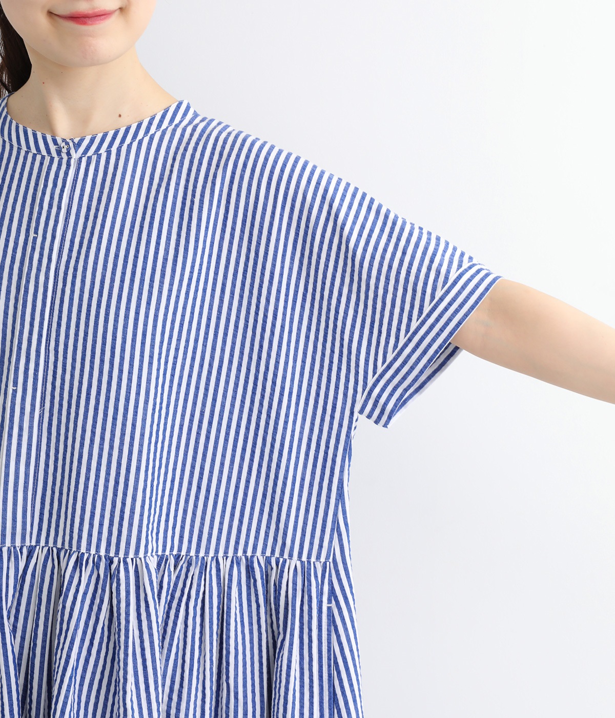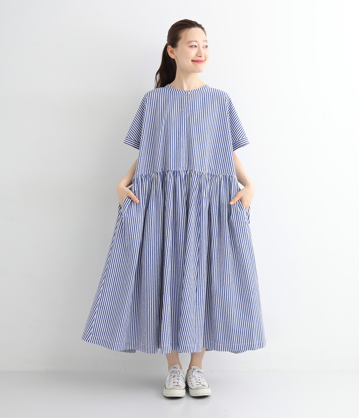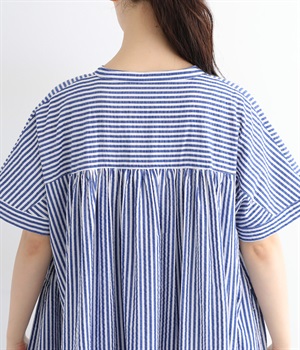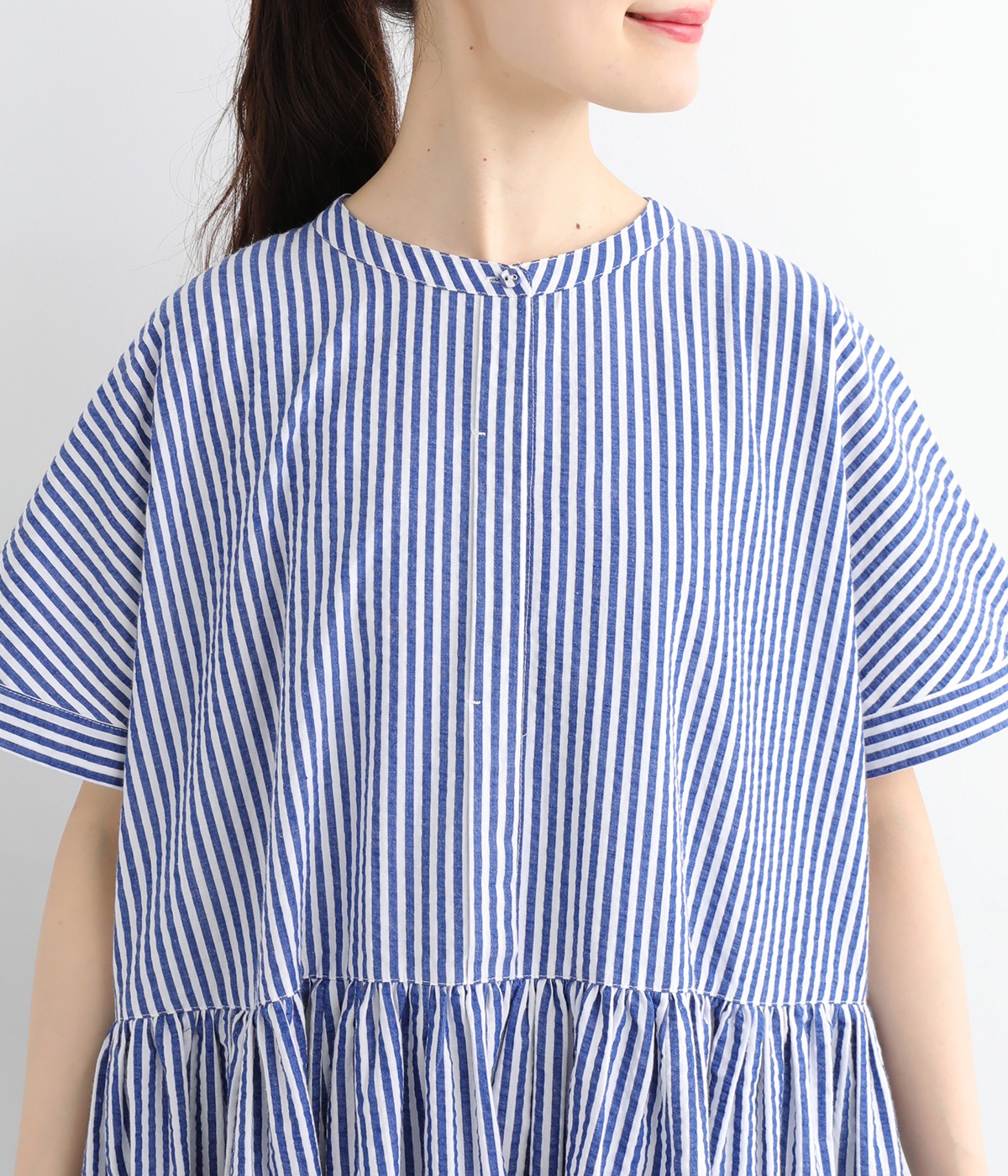 大人の夏コーデにちょうどいい、柔らかなトーンのブルーストライプ。縦のラインが強調されることで、スタイルアップ効果も期待できます。