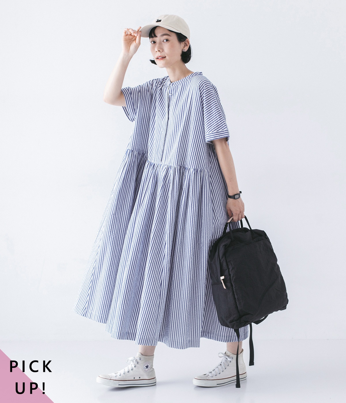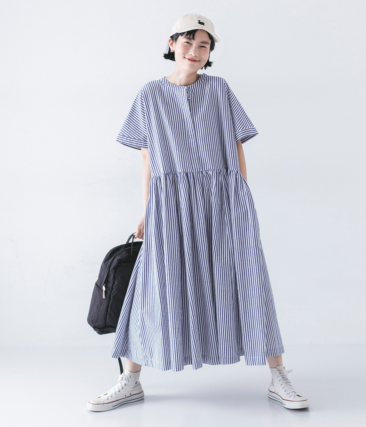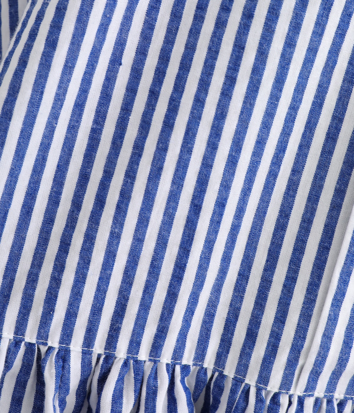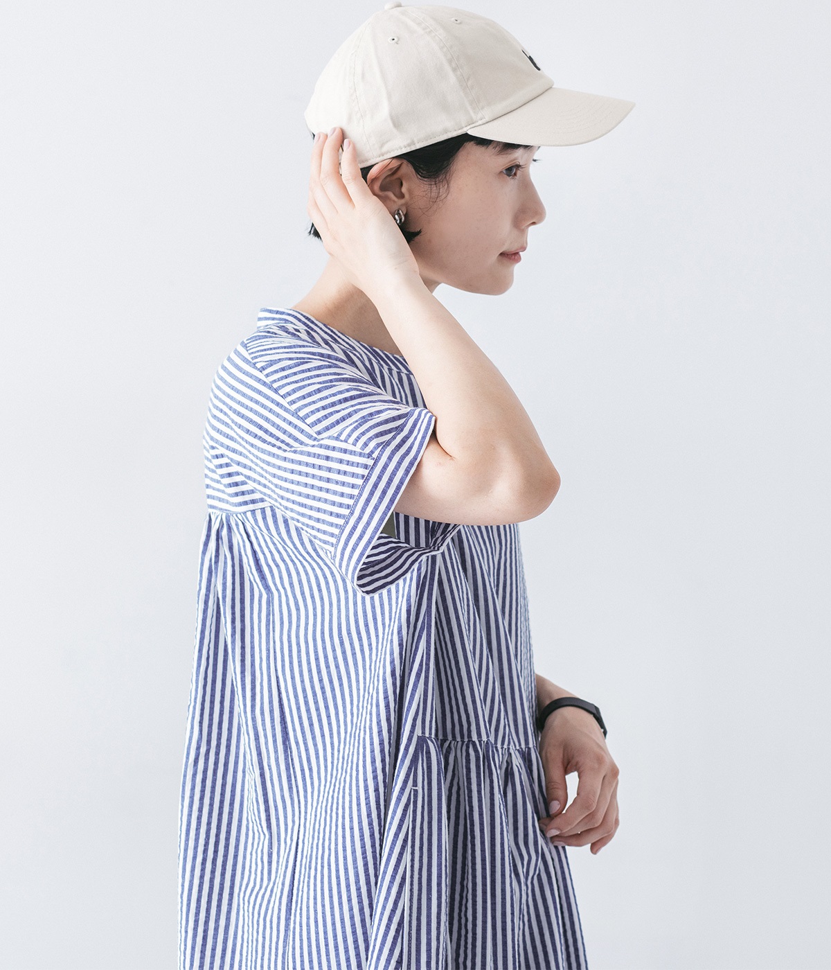 大人の夏コーデにちょうどいい、柔らかなトーンのブルーストライプ。縦のラインが強調されることで、スタイルアップ効果も期待できます。