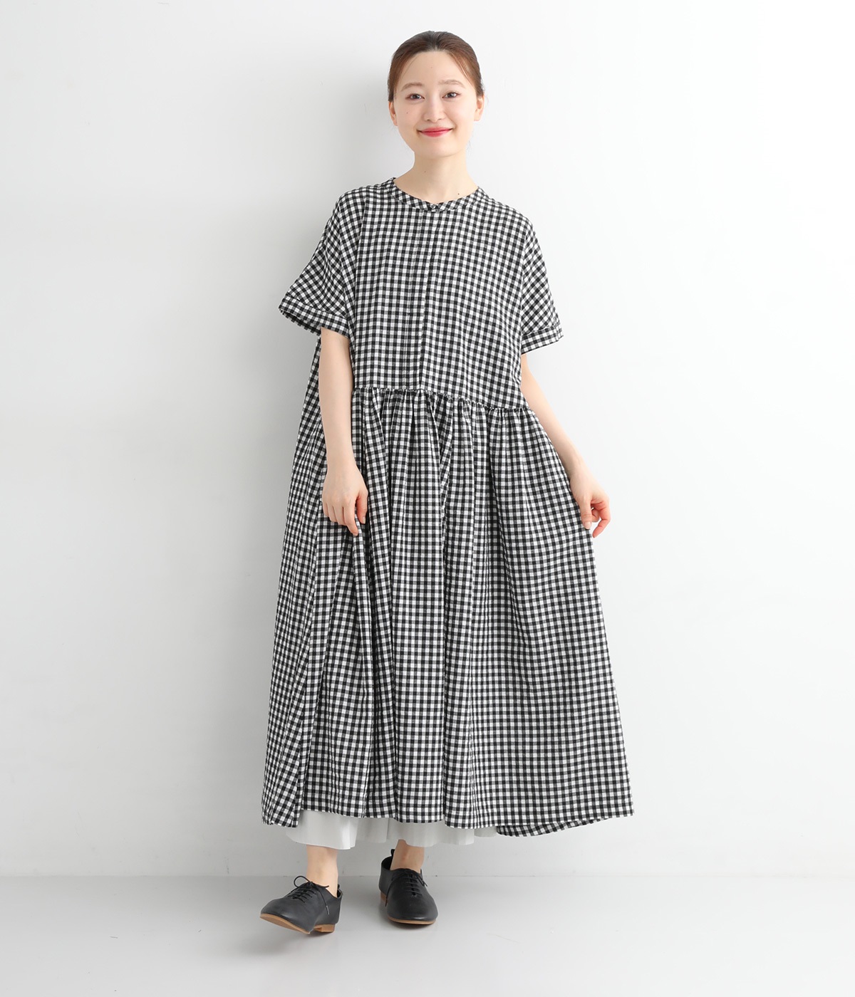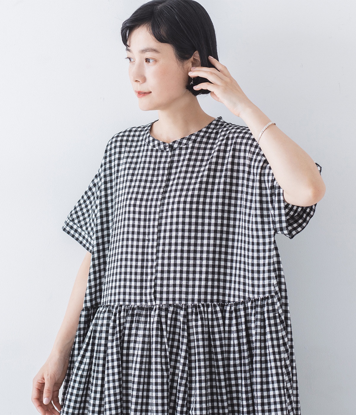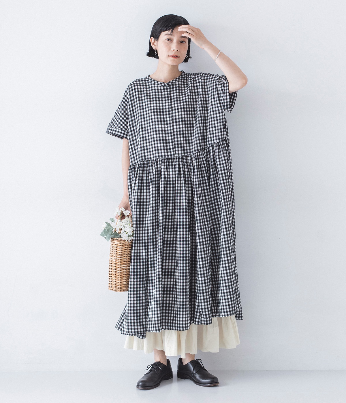 定番のブラック×ホワイトのギンガムチェック。ほどよい柄行きがカジュアル感を抑え、上品な愛らしさを引き立てる一枚です。
