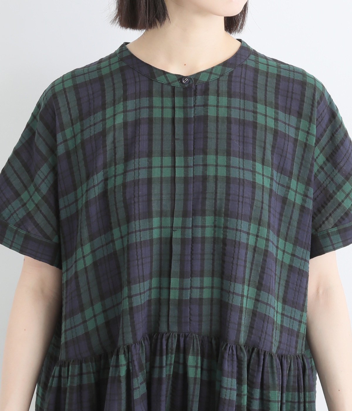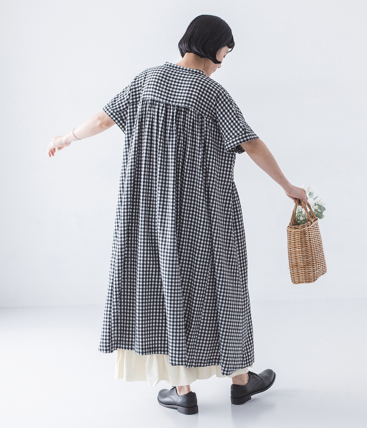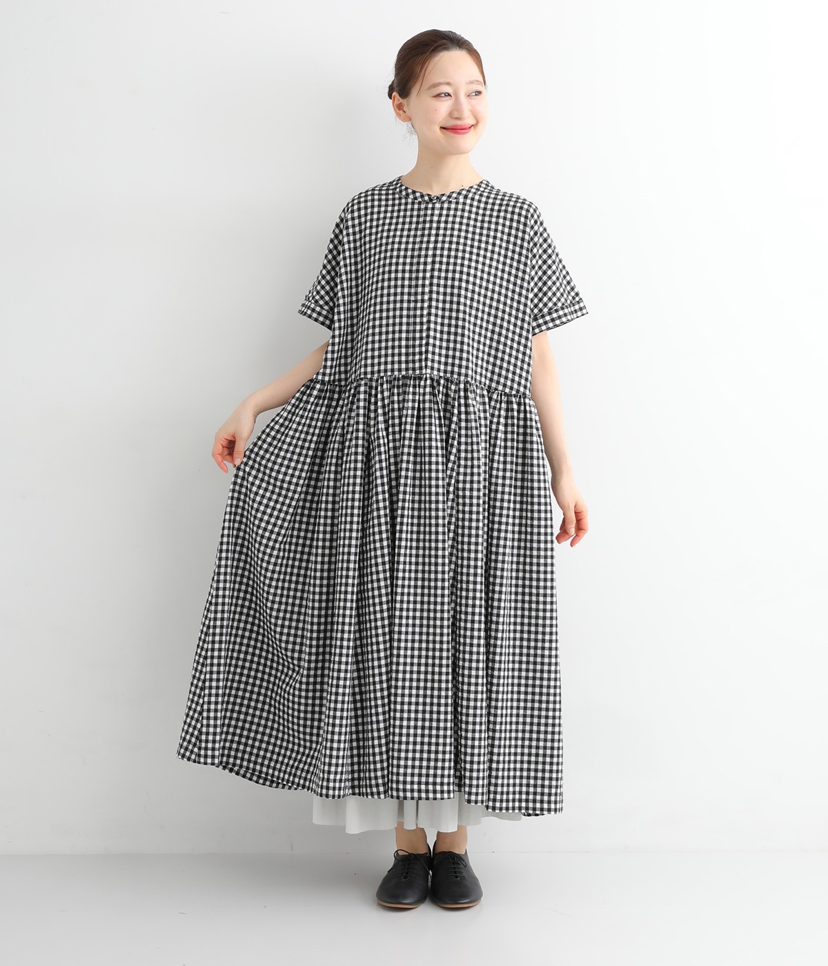 定番のブラック×ホワイトのギンガムチェック。ほどよい柄行きがカジュアル感を抑え、上品な愛らしさを引き立てる一枚です。