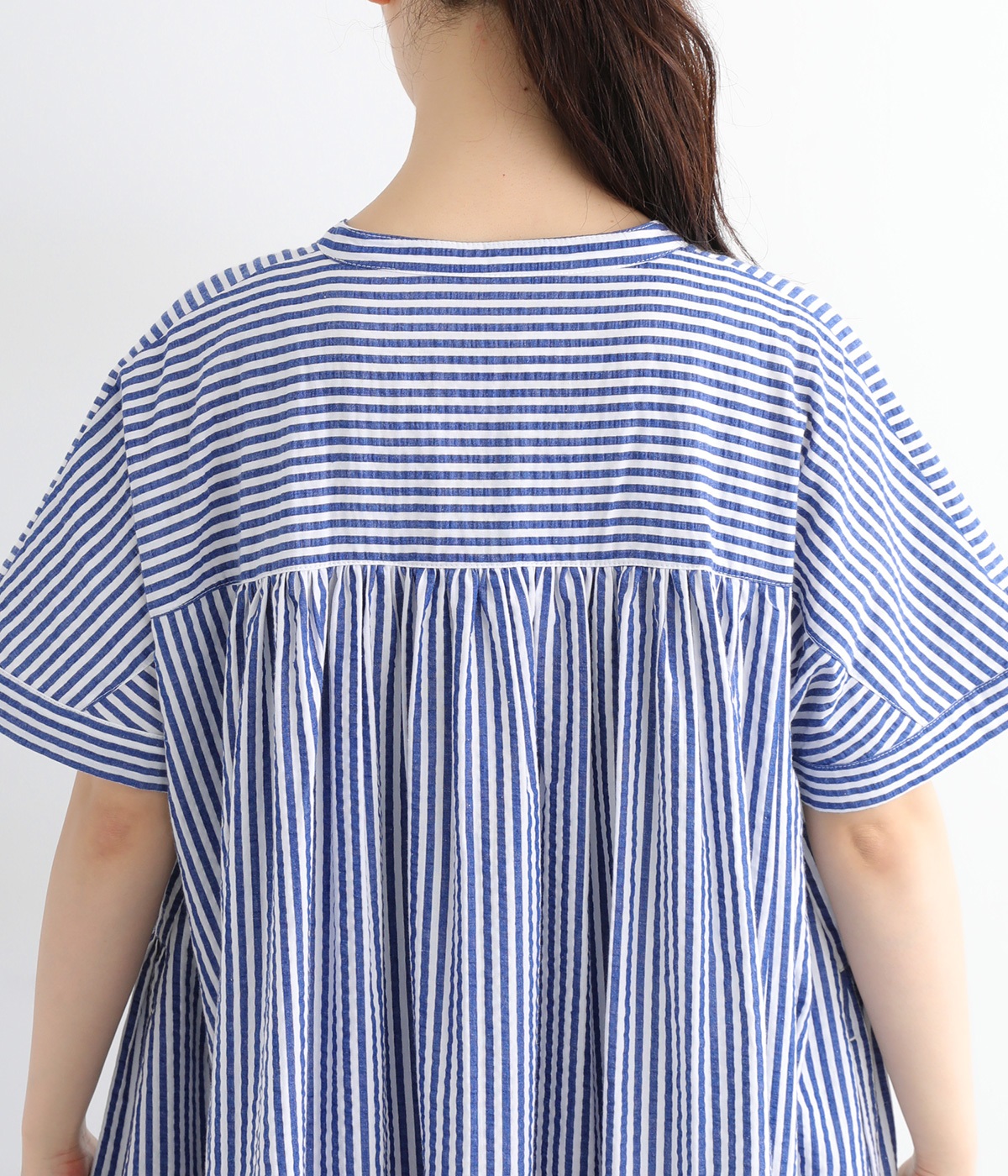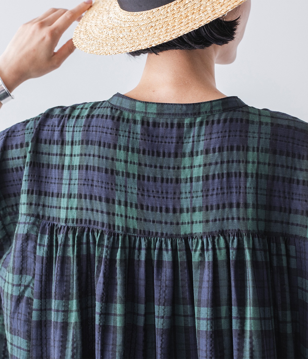 背中のヨークから広がる繊細なギャザー。かわいらしくなりすぎない、さりげなさが大人に嬉しいポイント。