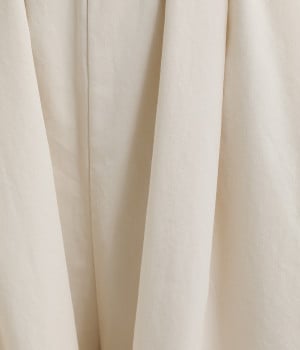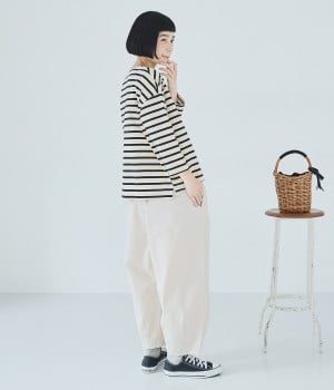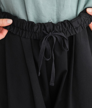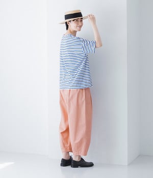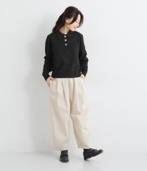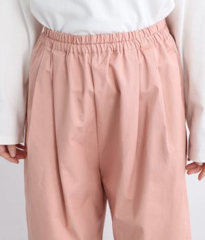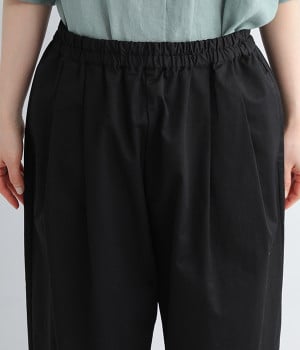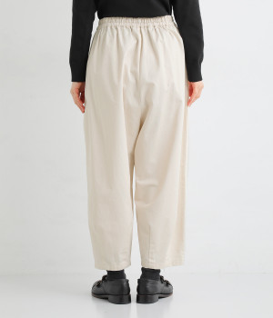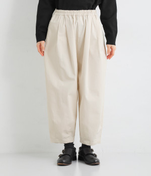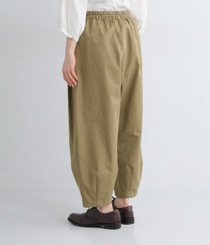 ほどよい光沢とハリがあるコットンチノ素材のバルーンパンツ。「Lintu Laulu」でも大人気の2タックチノパンツを、汗ばむ季節にも使えるようアップデートしました。製品洗いをかけることで、はじめから着古したような、くたっとこなれた風合いを出しています。裾にはダーツを入れて、横から見ると立体的にラウンドさせた大人かわいいバランスのシルエットです。ウエストは一周ゴム仕様、調整用の内ヒモ付き。
