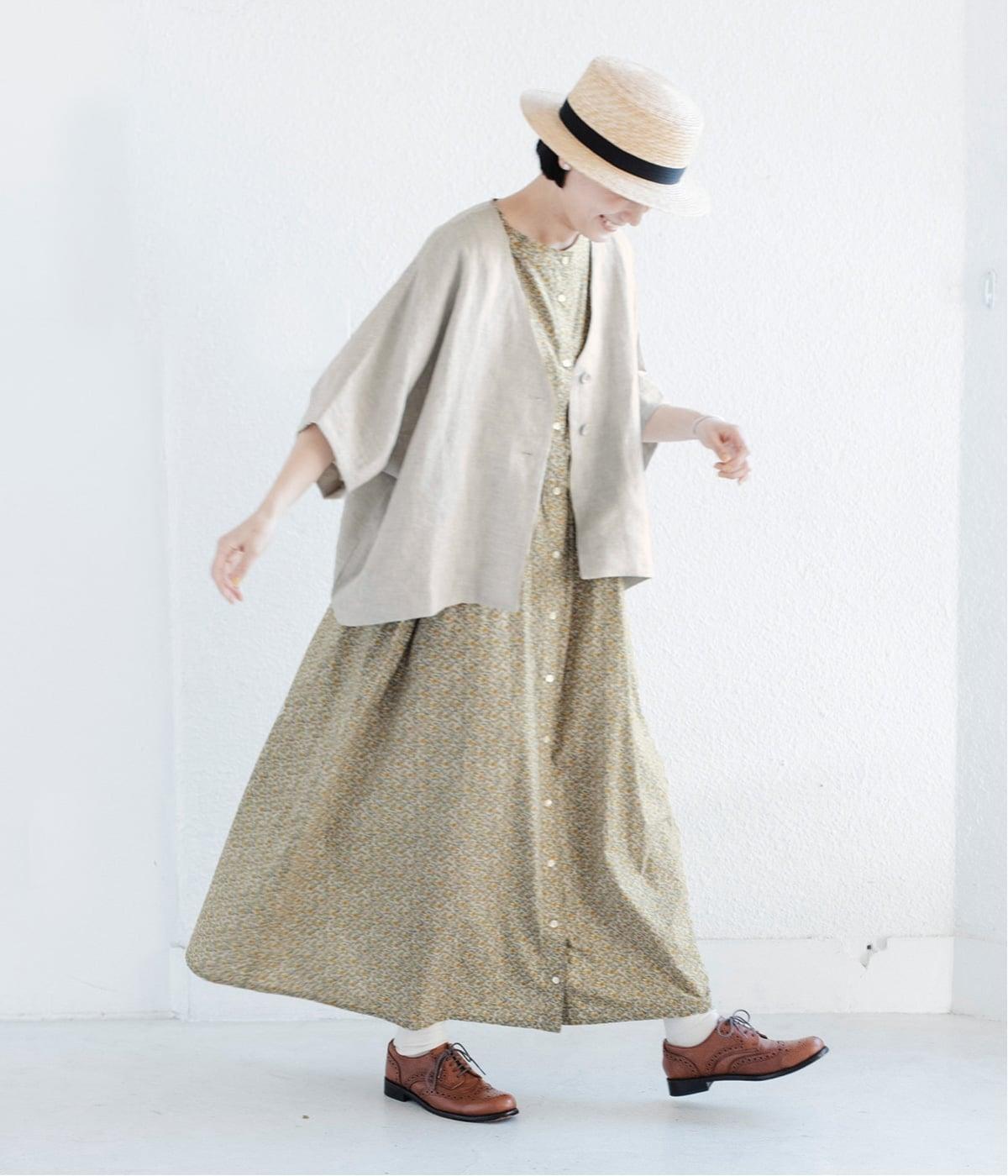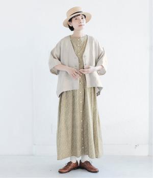 ナチュラルには小花柄のワンピースを合わせて、品よくまとめました。ゆとりのあるシルエットがほどよい抜け感をつくり、ナチュラルながらもきちんと見える大人の装いに。