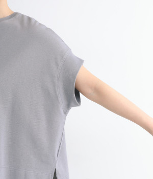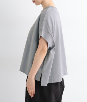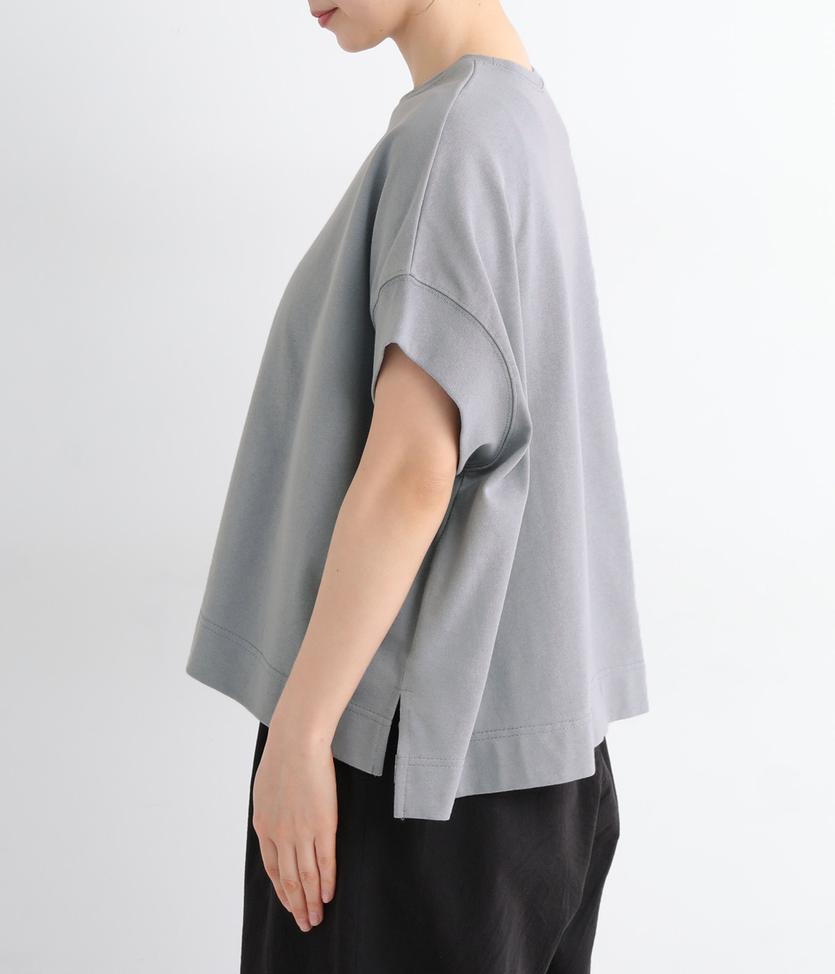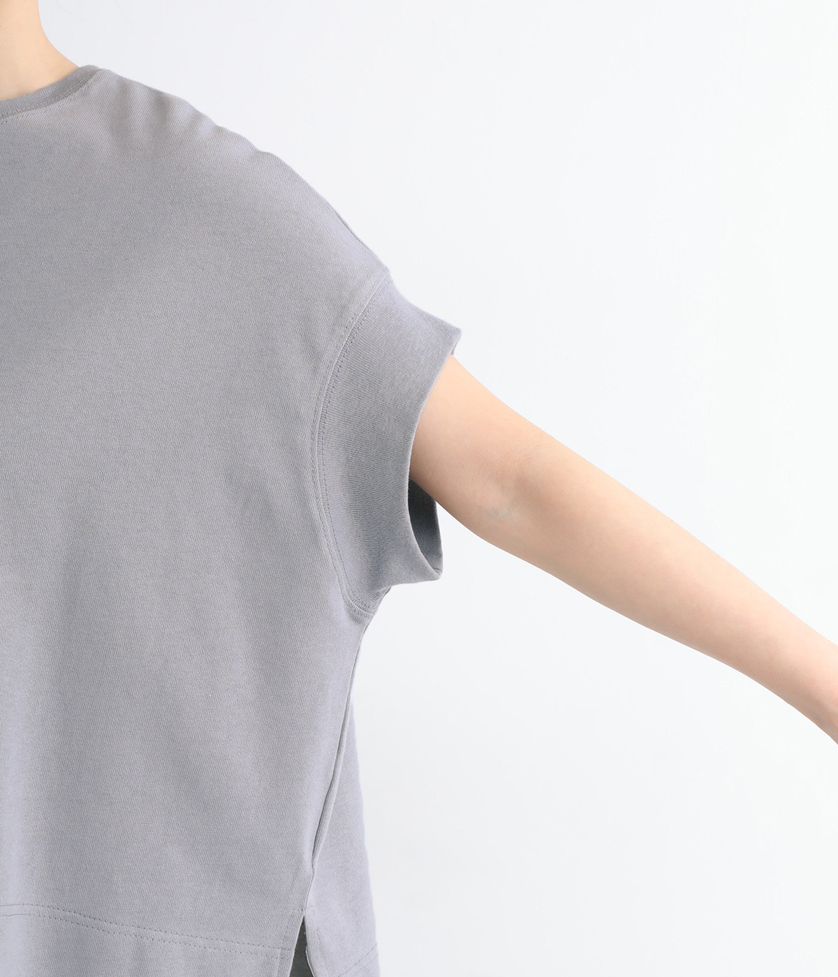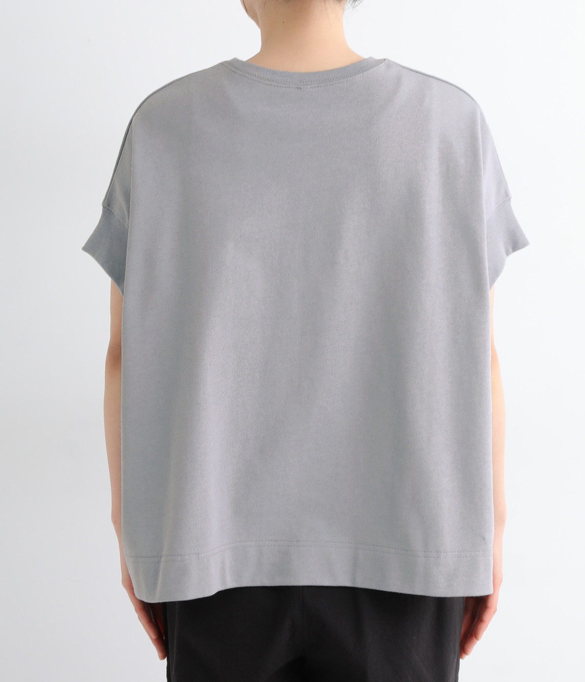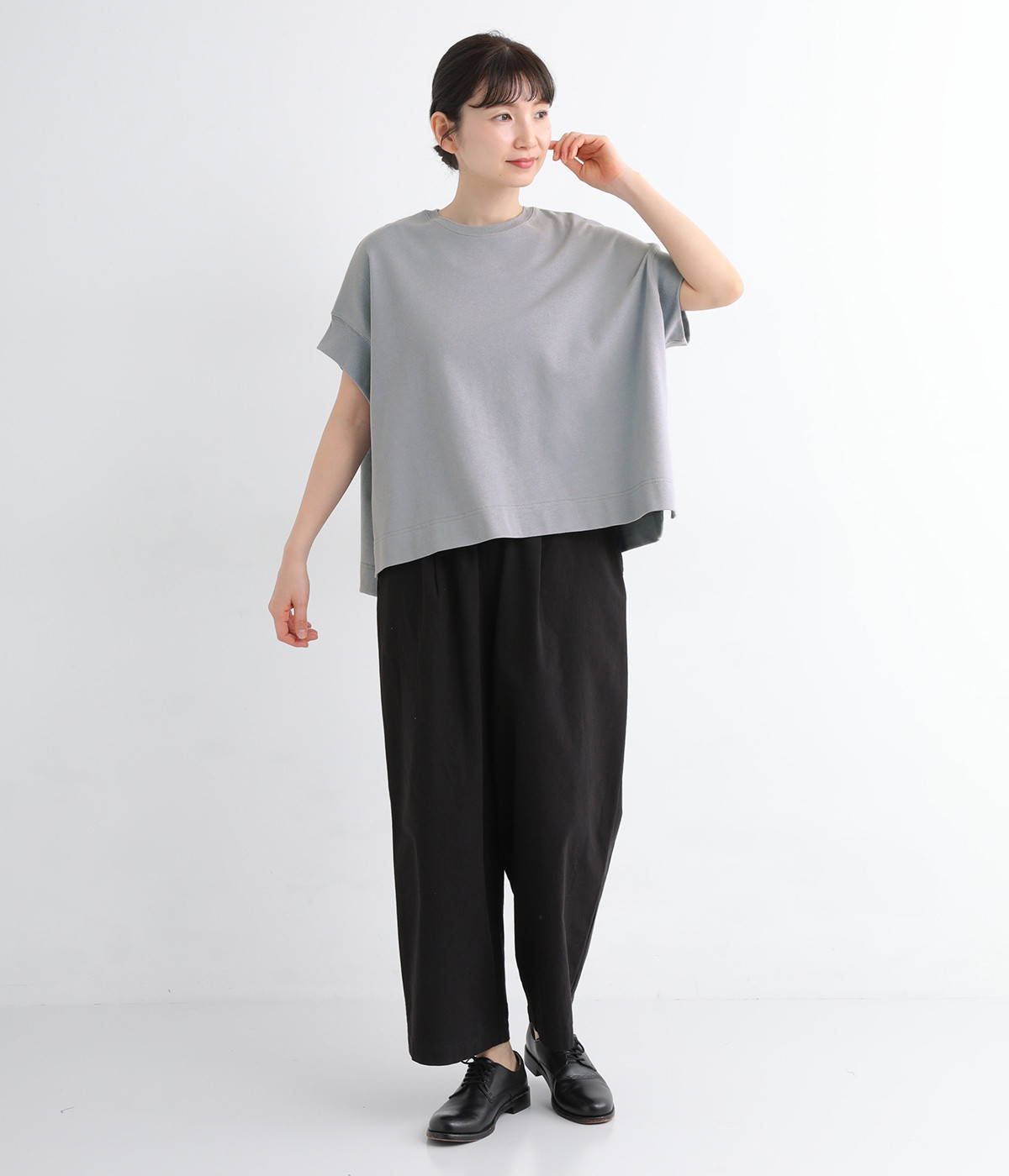 Tシャツとスウェットの間のような、やや厚みを感じるコットン生地を使用しています。UVカット機能がほどこされ、日差しが強い日の紫外線予防をアシスト。ホームケアしやすく、デイリー使いにぴったりです。