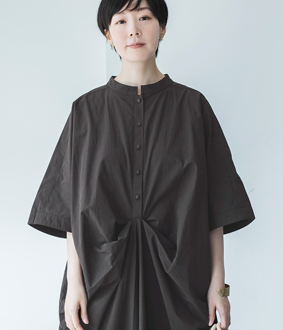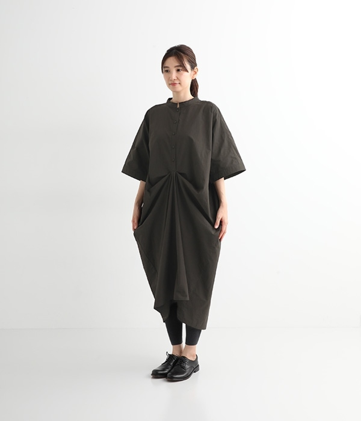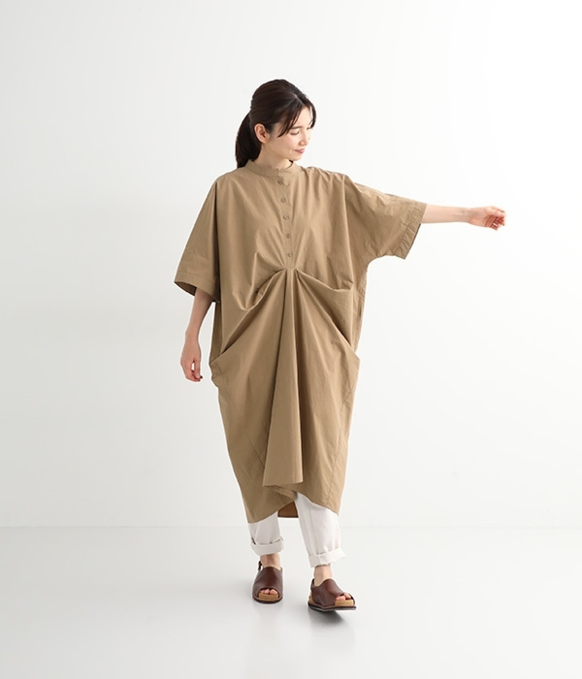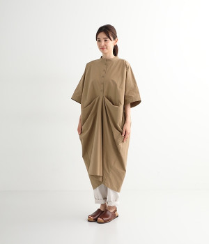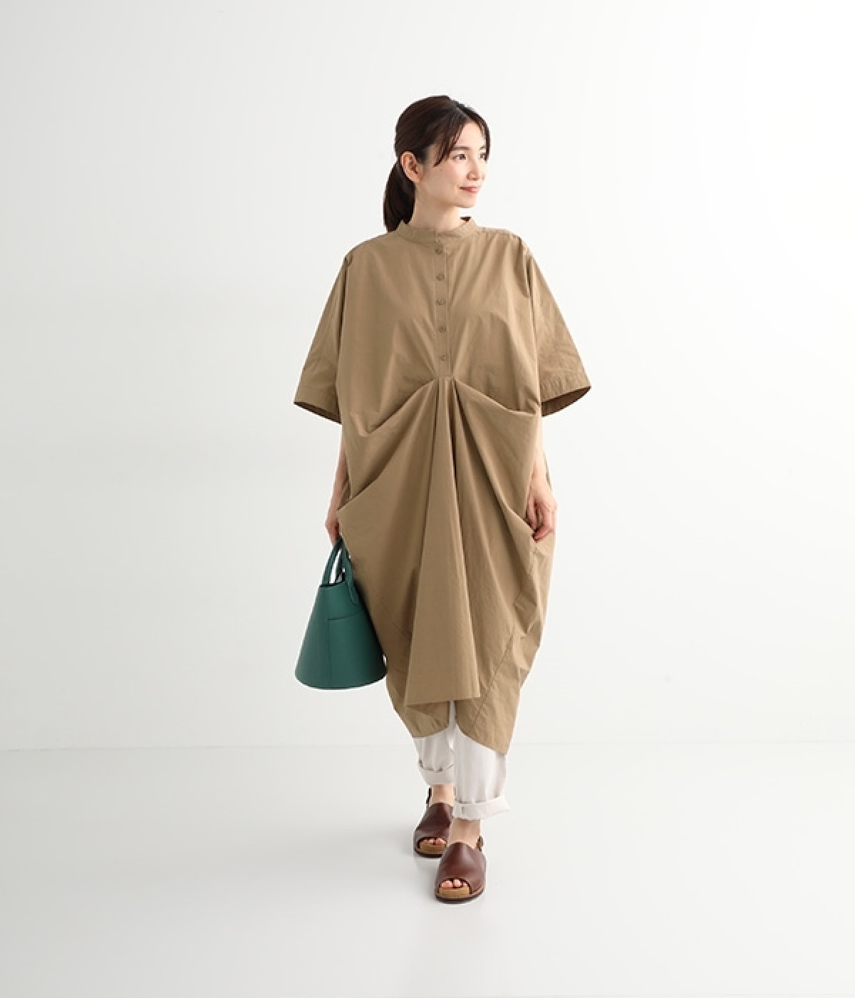 高密度に織り上げた、しなやかでハリのあるコットンを使用。洗いをかけてナチュラルなシワを出し、肌なじみよく仕上げたワンピースです。前身頃の大きなタックがデザインポイントで、動きのあるコクーンシルエットを描きました。カジュアルな着こなしやすさと、モードな雰囲気とのバランスが絶妙。ゆとりのあるスタンドネックが凛々しさを添える一枚です。
