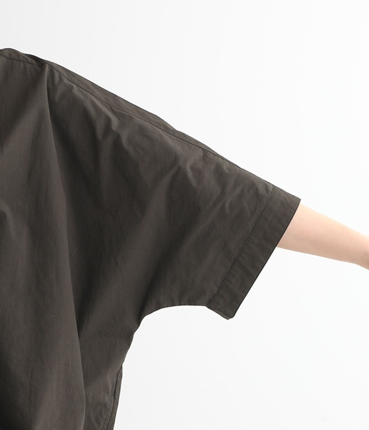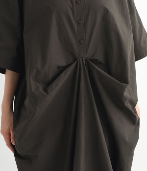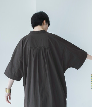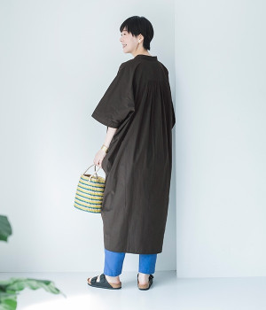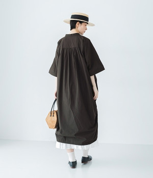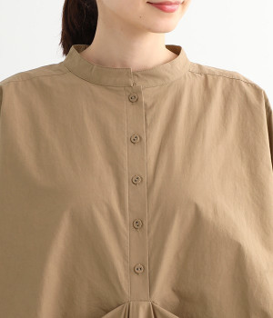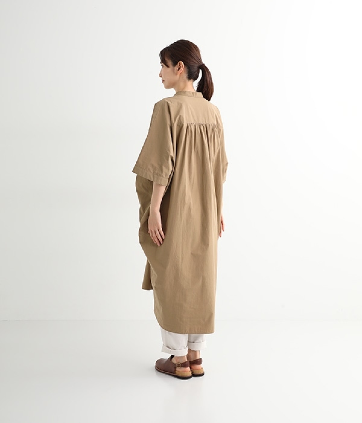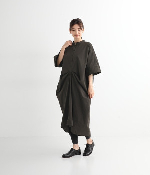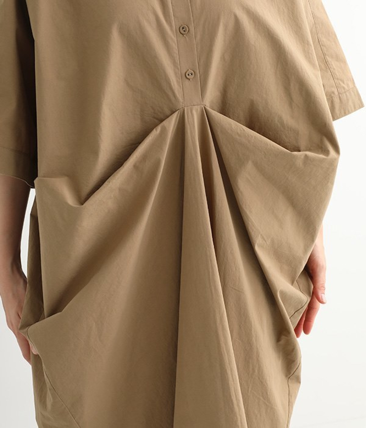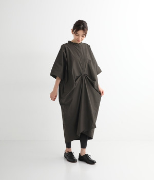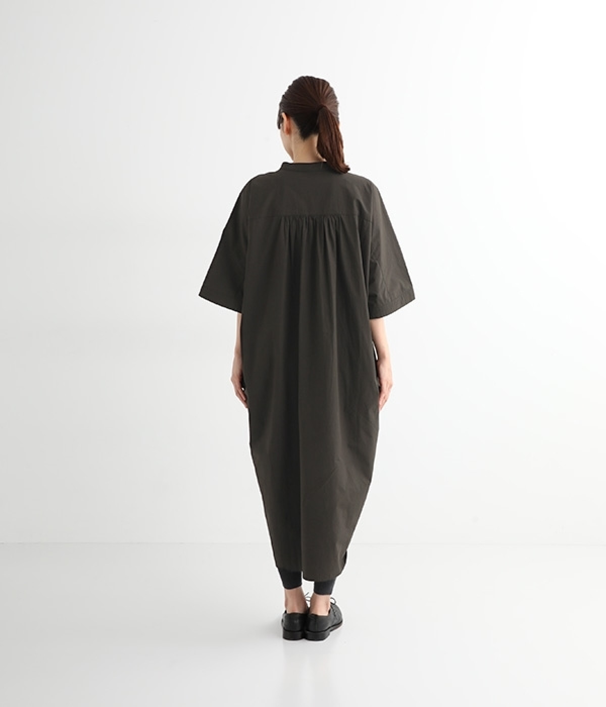 高密度に織り上げた、しなやかでハリのあるコットンを使用。洗いをかけてナチュラルなシワを出し、肌なじみよく仕上げたワンピースです。前身頃の大きなタックがデザインポイントで、動きのあるコクーンシルエットを描きました。カジュアルな着こなしやすさと、モードな雰囲気とのバランスが絶妙。ゆとりのあるスタンドネックが凛々しさを添える一枚です。