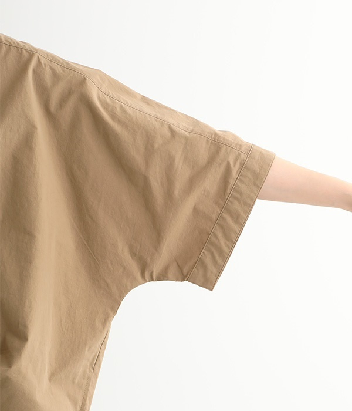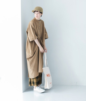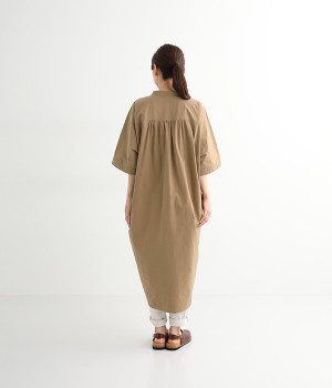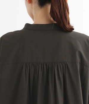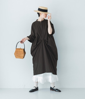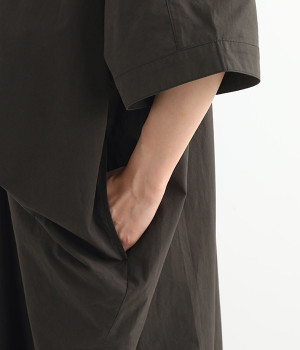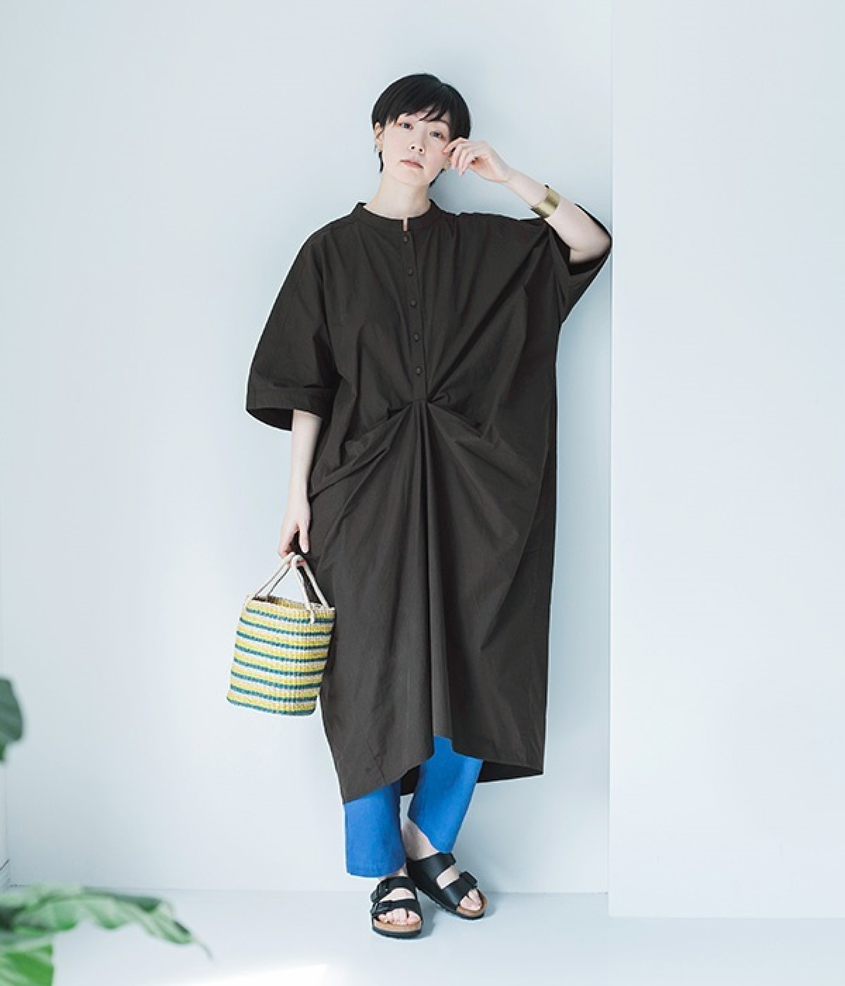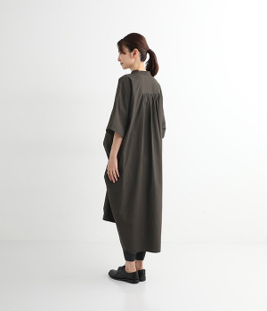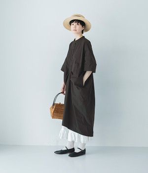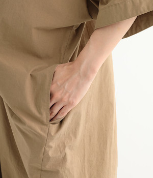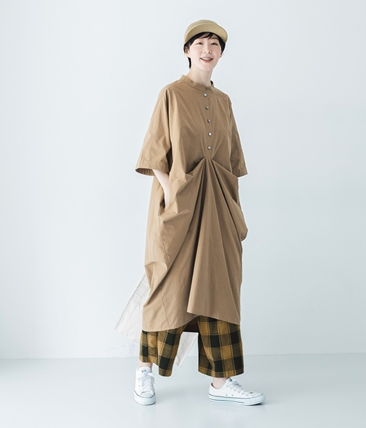 高密度に織り上げた、しなやかでハリのあるコットンを使用。洗いをかけてナチュラルなシワを出し、肌なじみよく仕上げたワンピースです。前身頃の大きなタックがデザインポイントで、動きのあるコクーンシルエットを描きました。カジュアルな着こなしやすさと、モードな雰囲気とのバランスが絶妙。ゆとりのあるスタンドネックが凛々しさを添える一枚です。