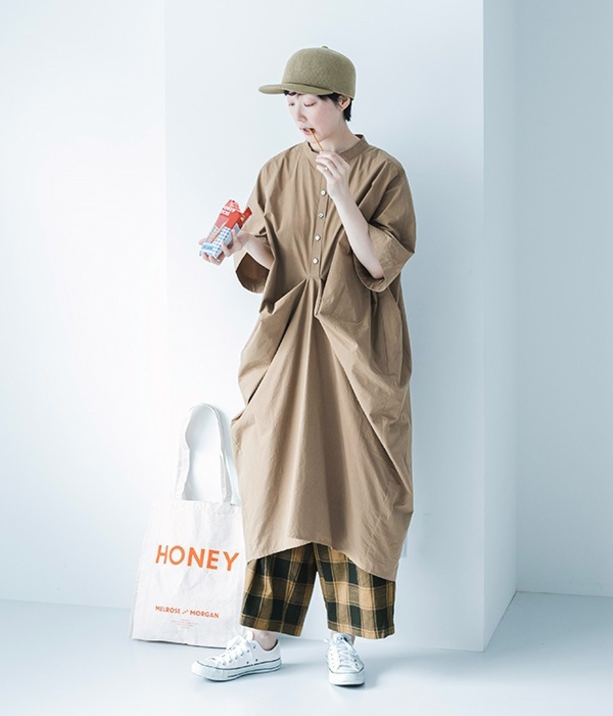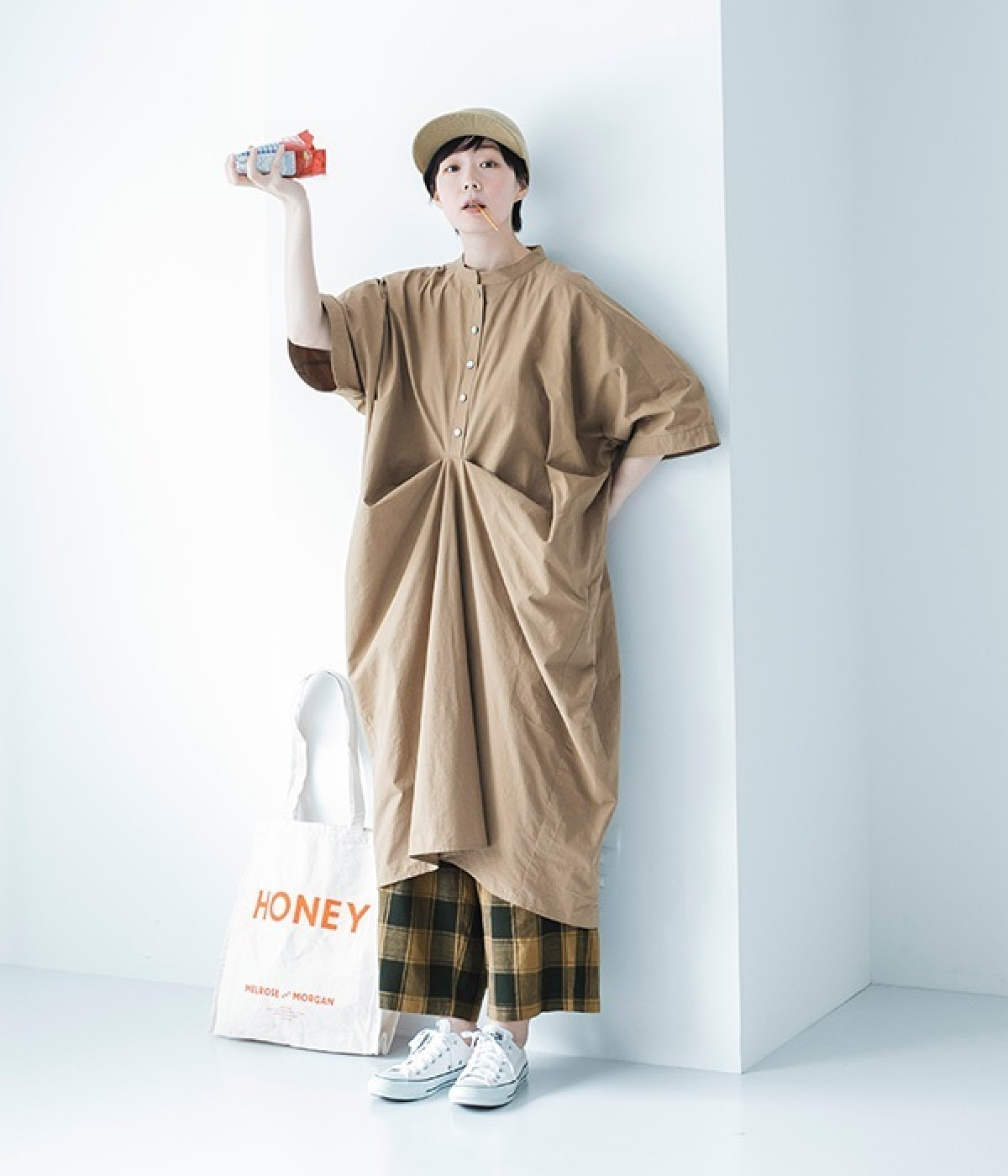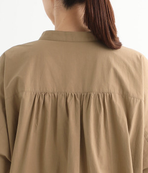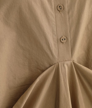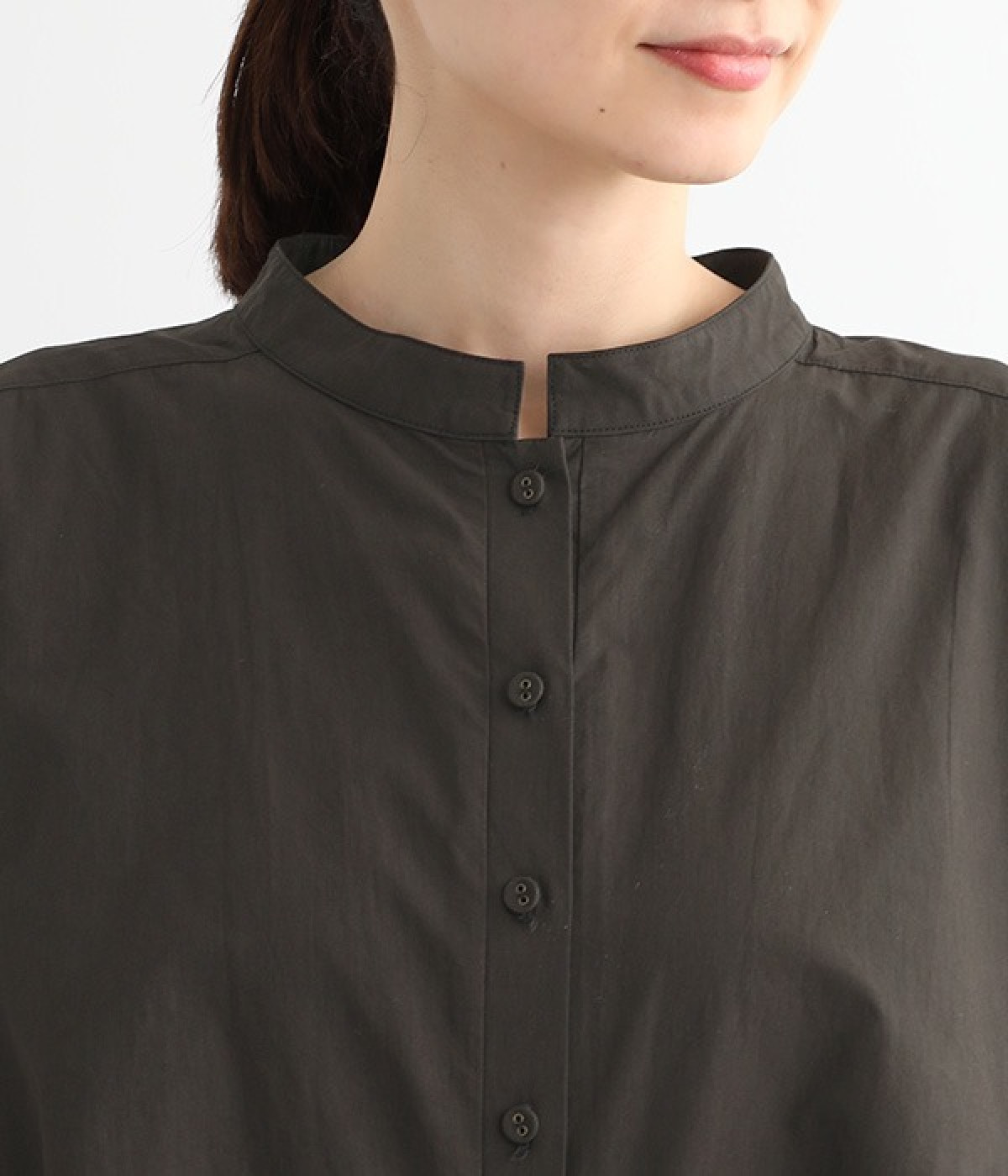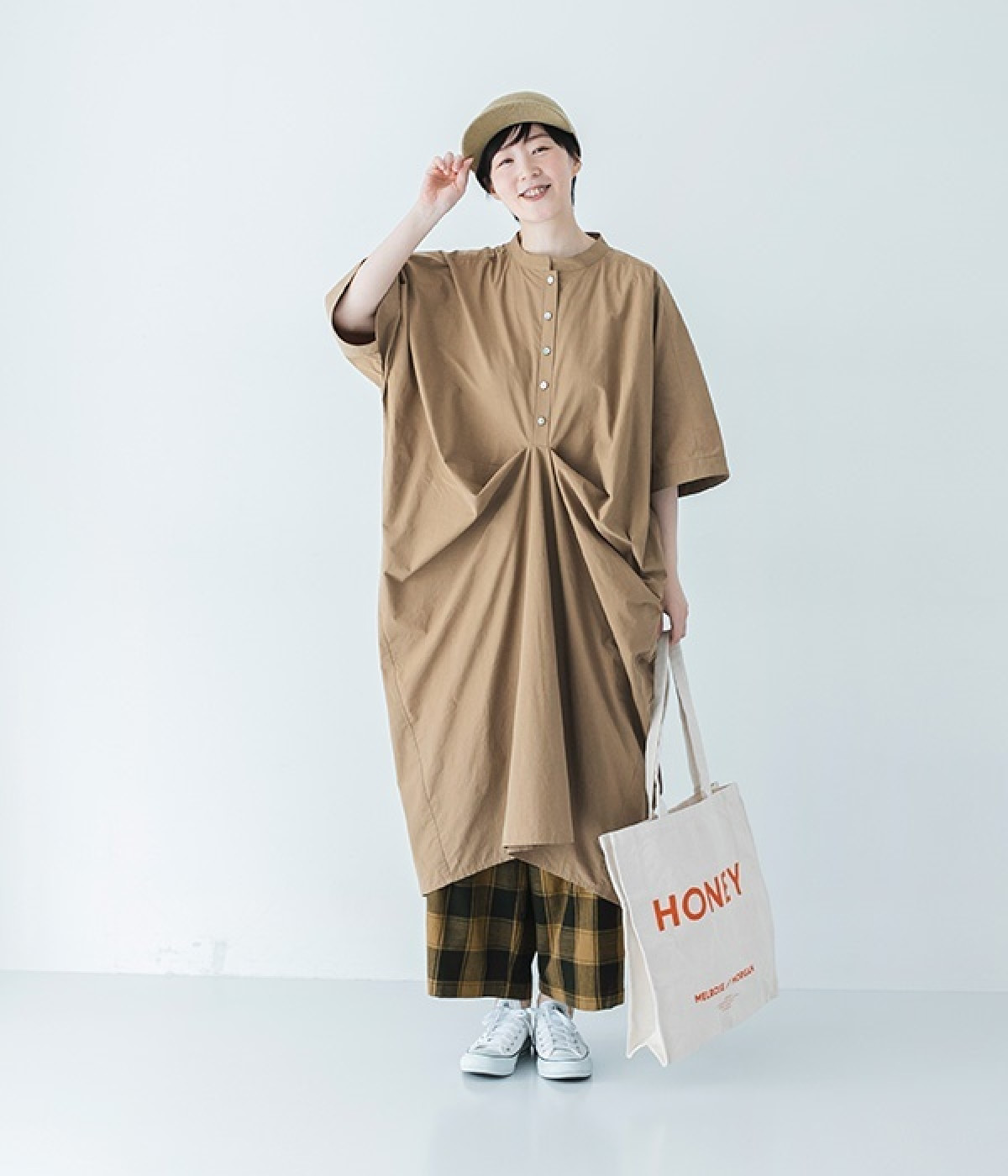 高密度に織り上げた、しなやかでハリのあるコットンを使用。洗いをかけてナチュラルなシワを出し、肌なじみよく仕上げたワンピースです。前身頃の大きなタックがデザインポイントで、動きのあるコクーンシルエットを描きました。カジュアルな着こなしやすさと、モードな雰囲気とのバランスが絶妙。ゆとりのあるスタンドネックが凛々しさを添える一枚です。