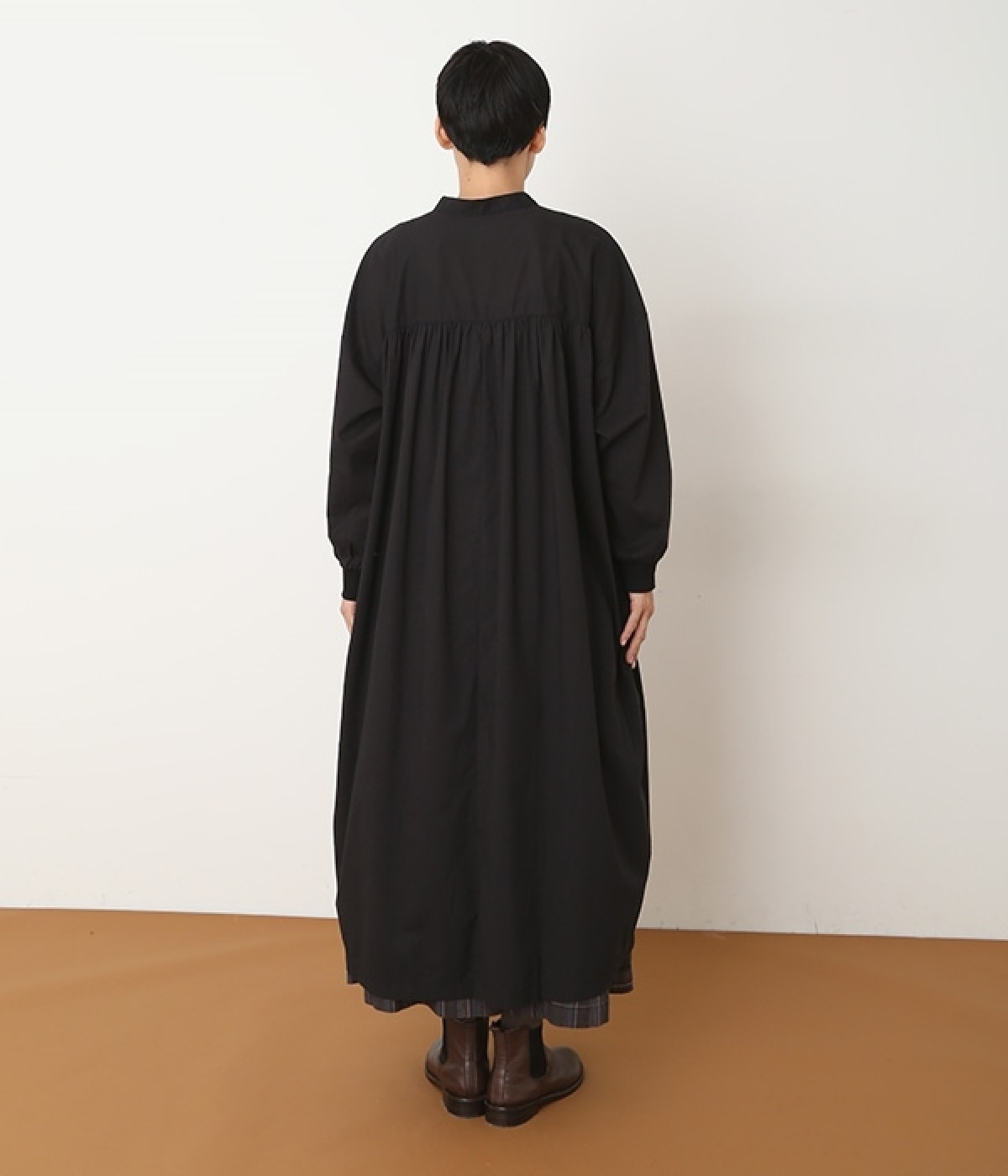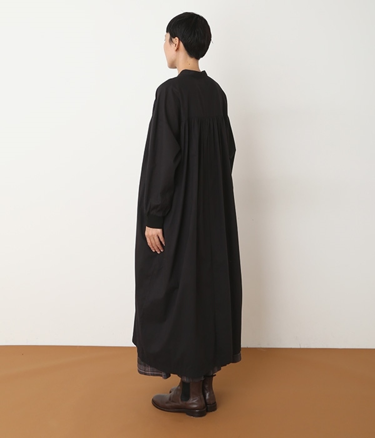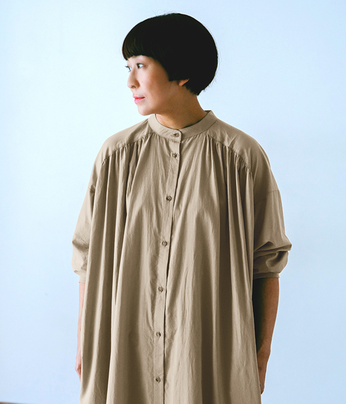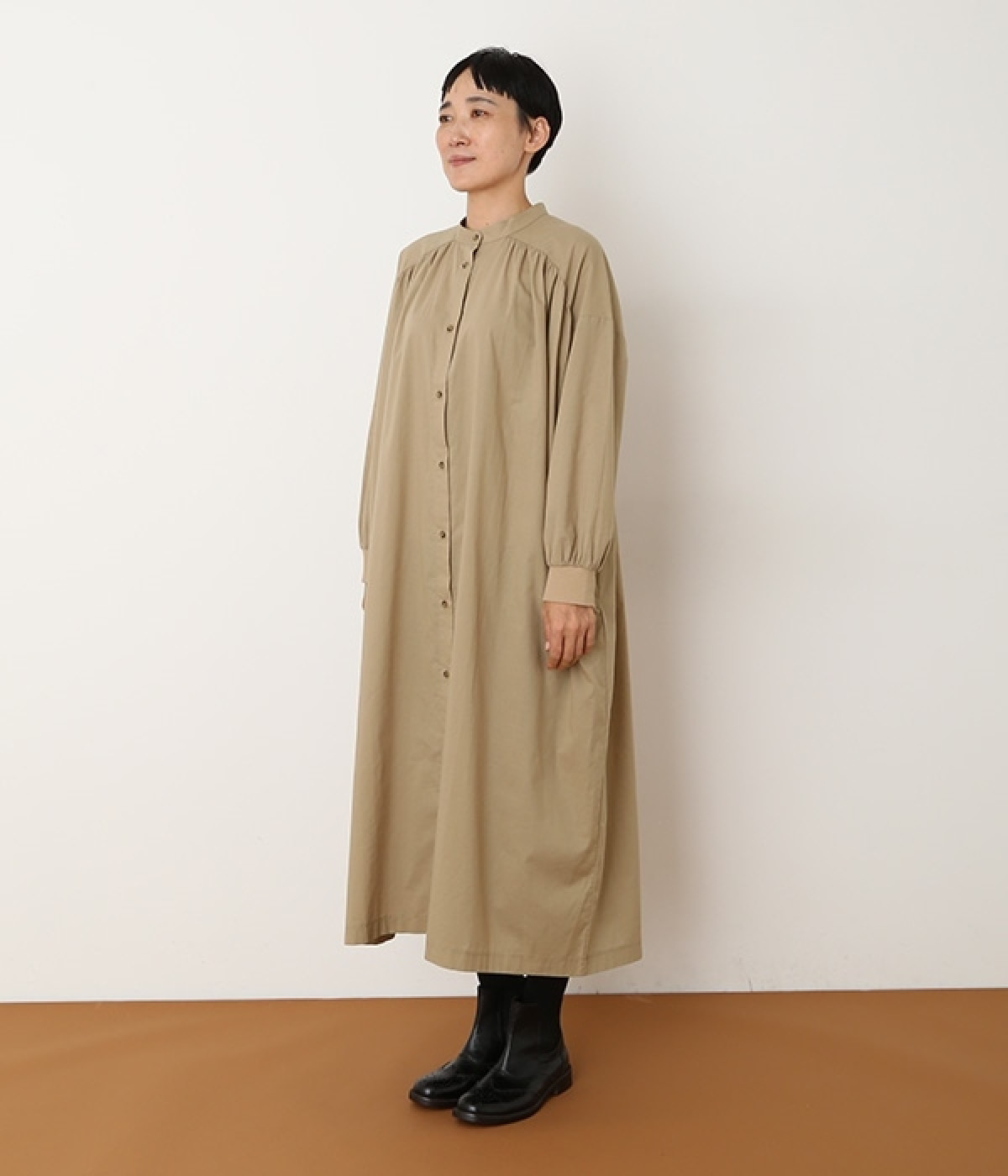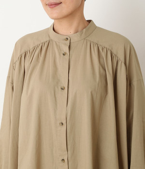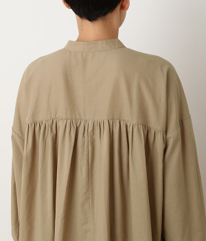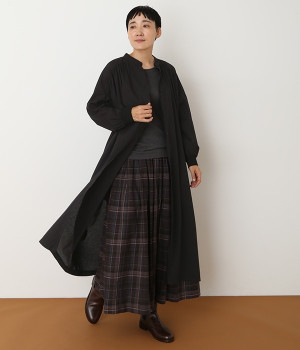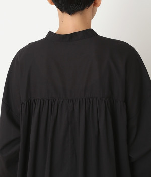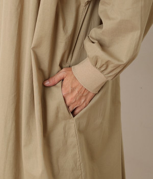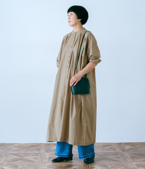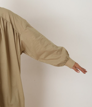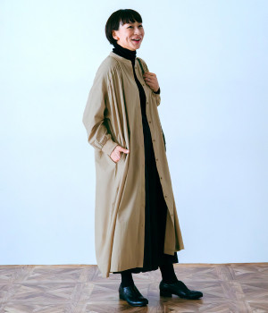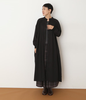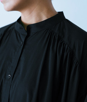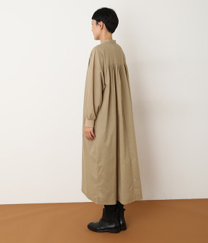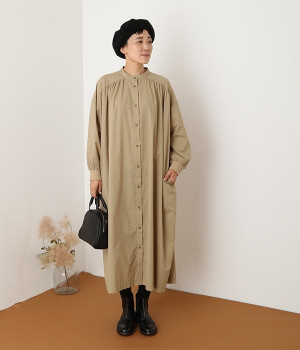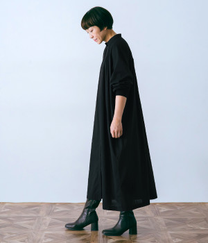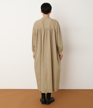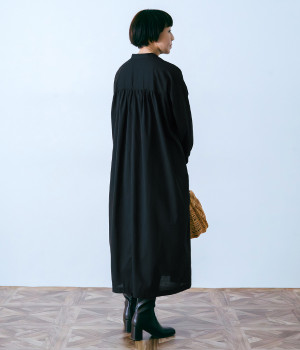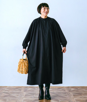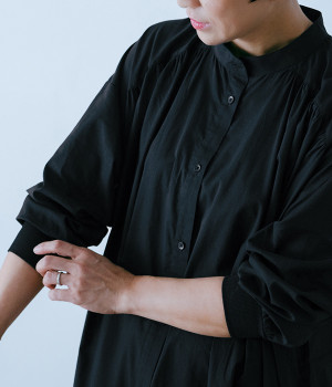 スタイリスト佐藤かなさんとのコラボで生まれたワンピース。身頃と背中に細かくギャザーを入れ、量感のあるフレアラインがとても華やかな印象です。袖口はたくし上げが簡単に行えるリブ仕立てにして、スポーティーなエッセンスをさりげなく。ソフトな肌あたりと軽やかな薄地のコットン生地はほのかなハリと光沢もあり、とても上品な風合いです。肌寒い日にはアウターを重ねたり、暑い日には一枚で着たりと着用のシーズンを選びません。