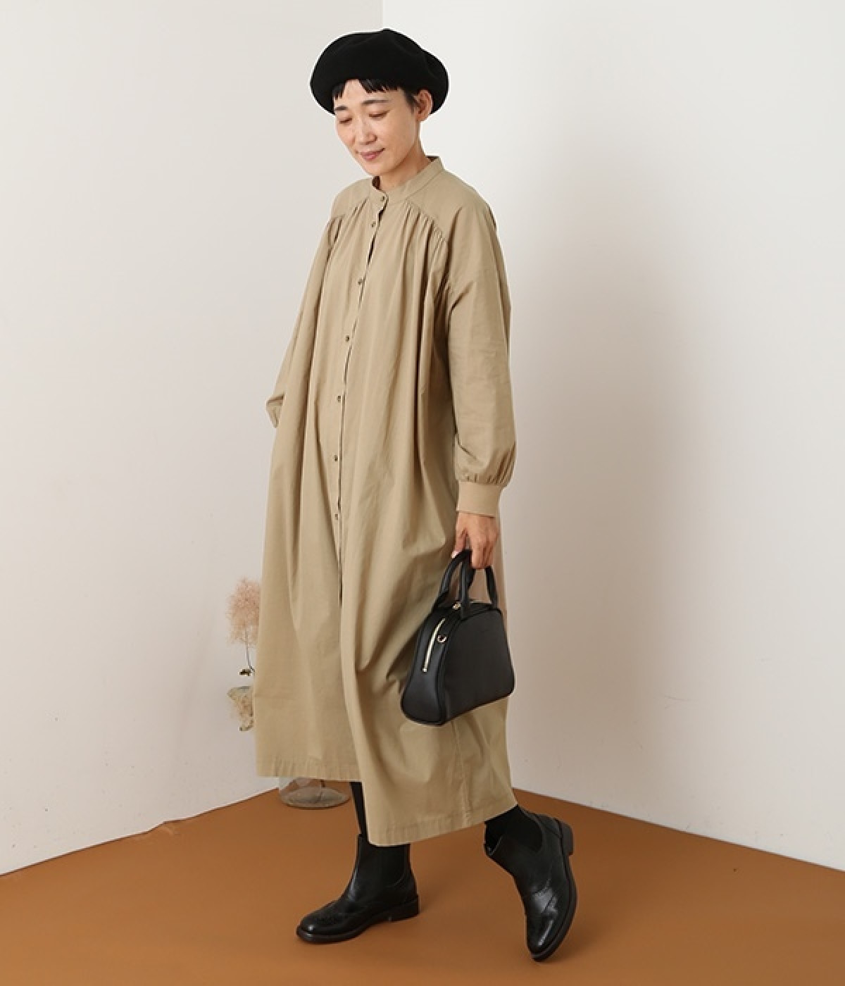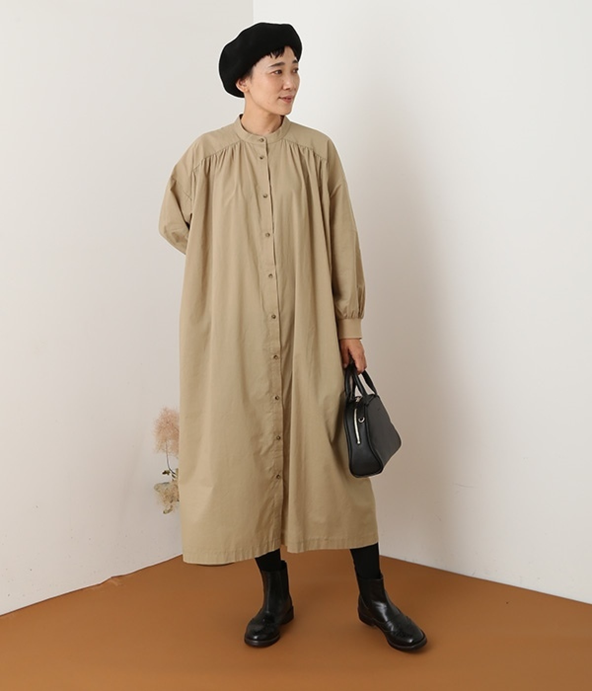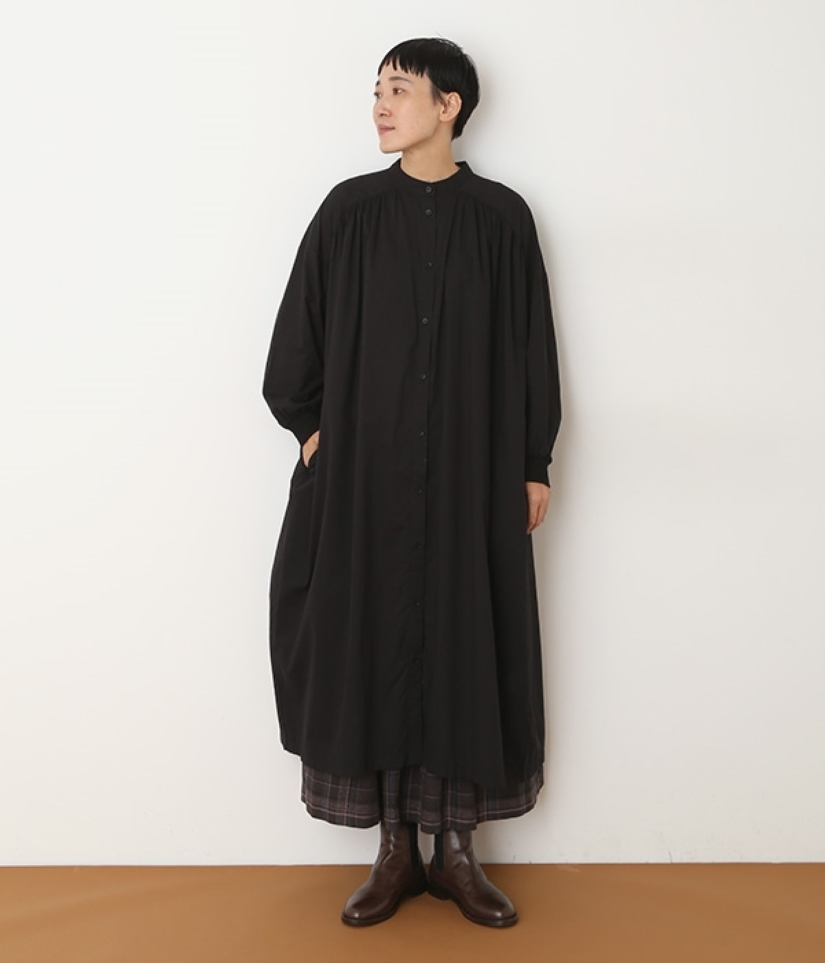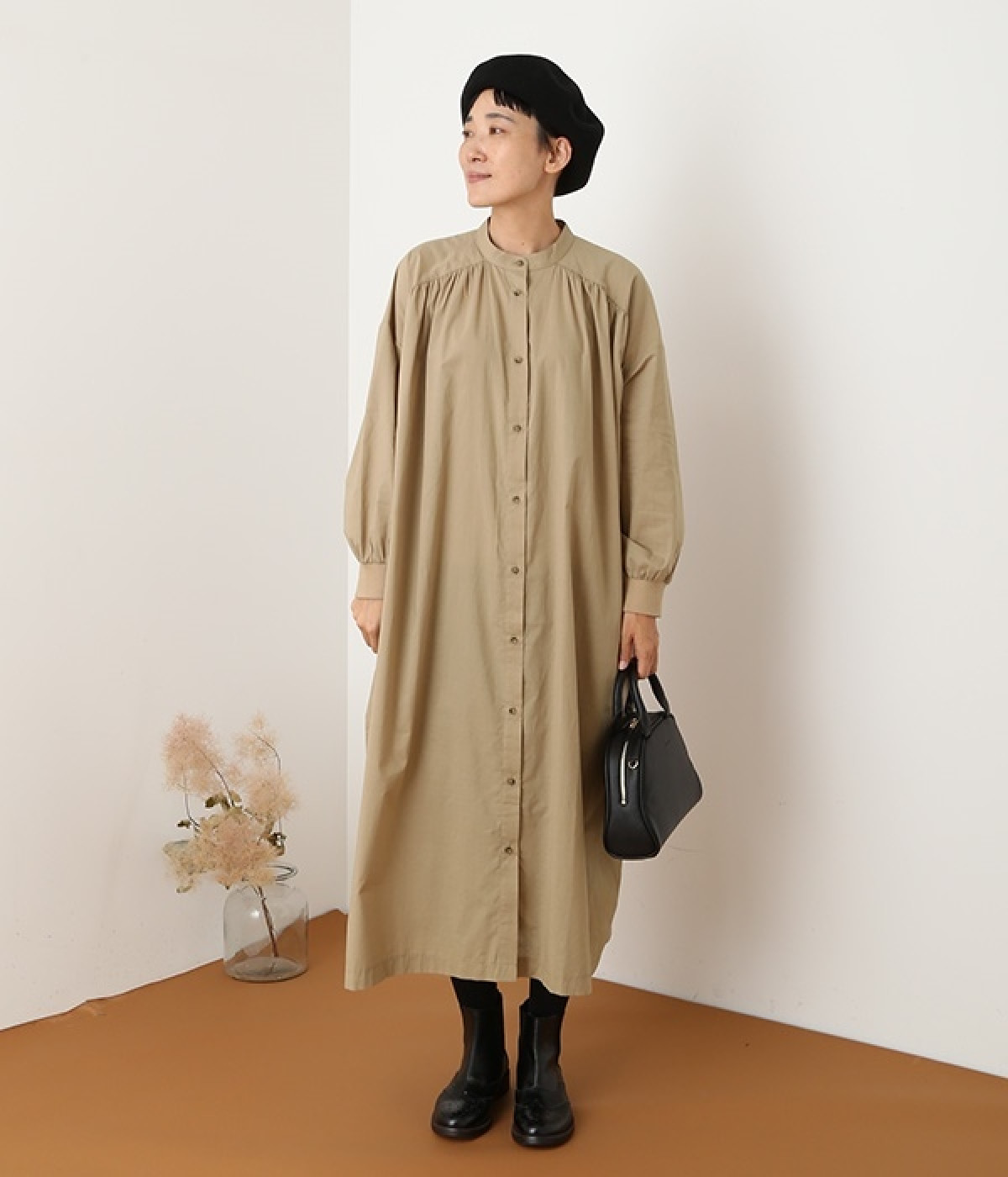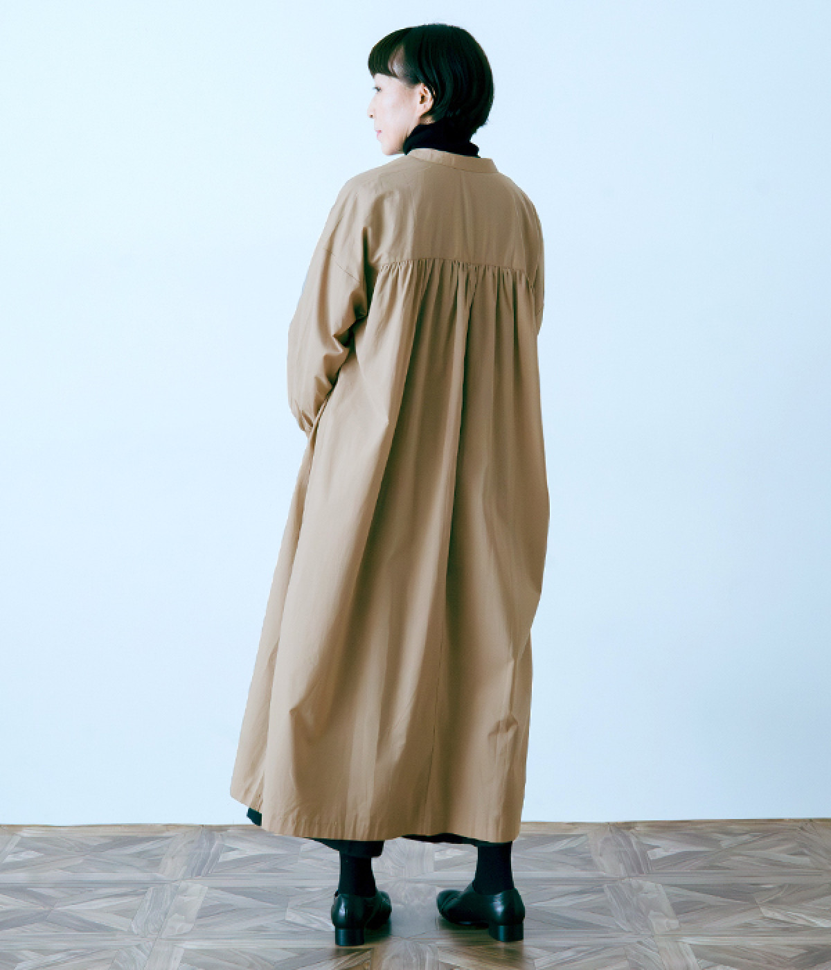 スタイリスト佐藤かなさんとのコラボで生まれたワンピース。身頃と背中に細かくギャザーを入れ、量感のあるフレアラインがとても華やかな印象です。袖口はたくし上げが簡単に行えるリブ仕立てにして、スポーティーなエッセンスをさりげなく。ソフトな肌あたりと軽やかな薄地のコットン生地はほのかなハリと光沢もあり、とても上品な風合いです。肌寒い日にはアウターを重ねたり、暑い日には一枚で着たりと着用のシーズンを選びません。