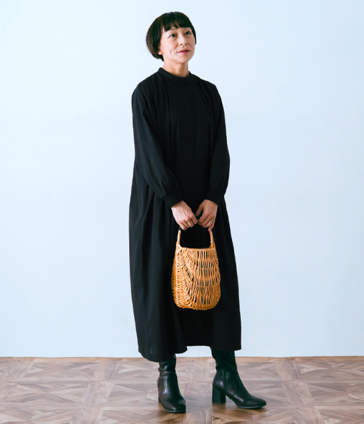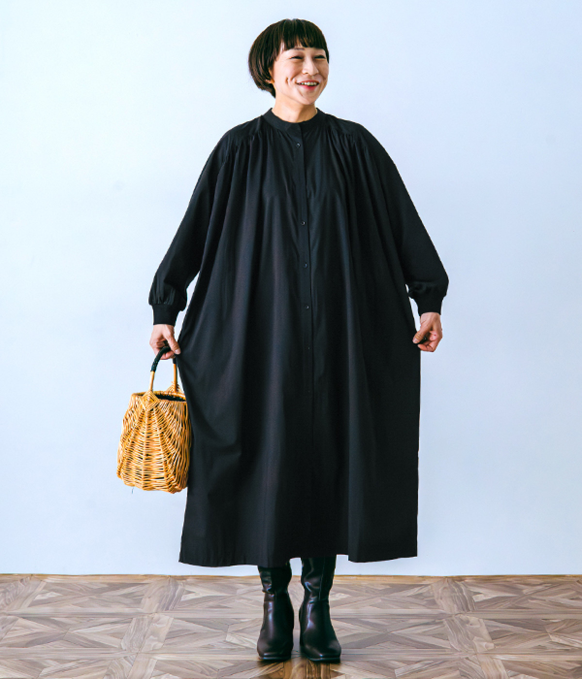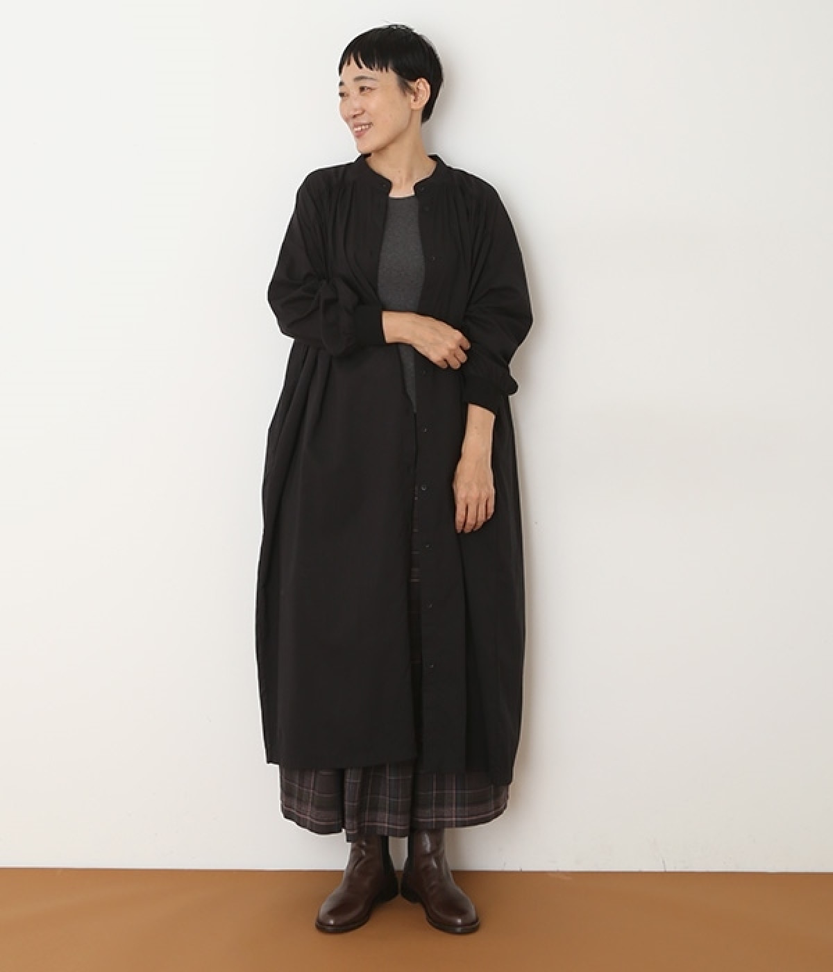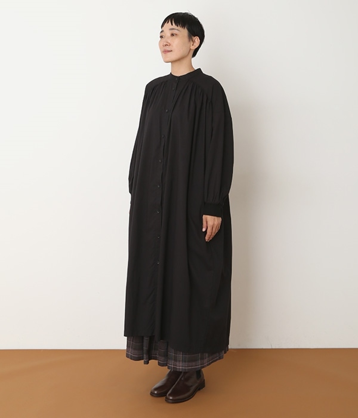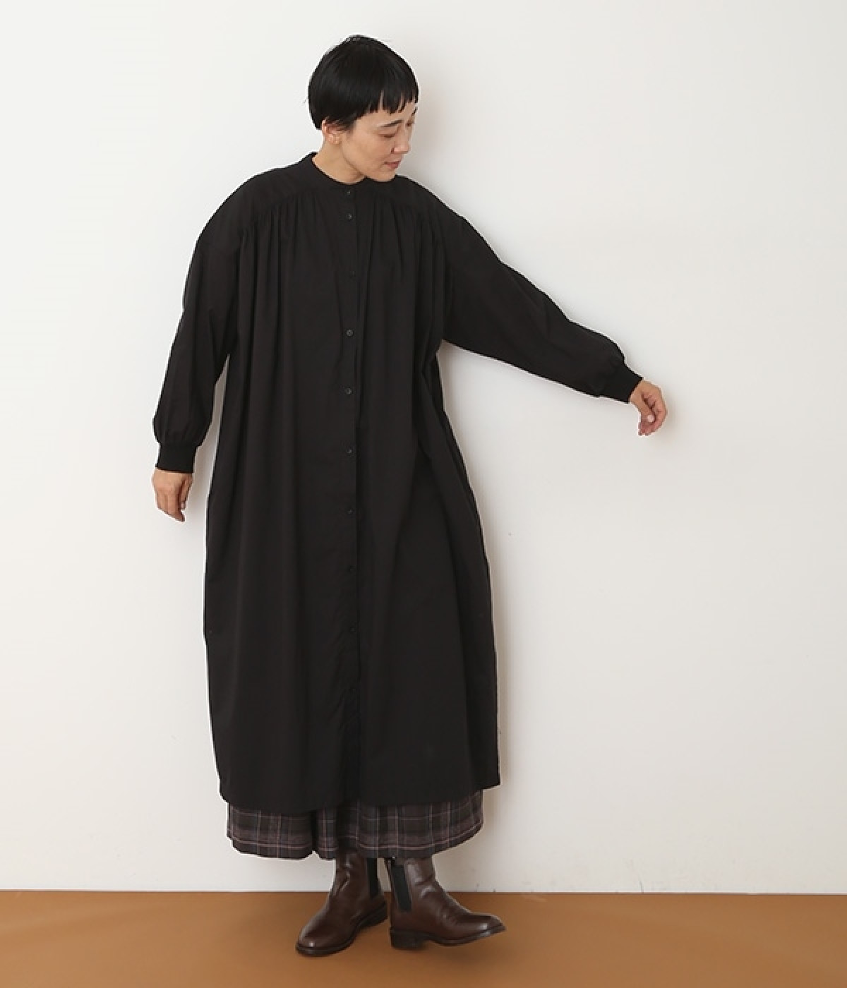 スタイリスト佐藤かなさんとのコラボで生まれたワンピース。身頃と背中に細かくギャザーを入れ、量感のあるフレアラインがとても華やかな印象です。袖口はたくし上げが簡単に行えるリブ仕立てにして、スポーティーなエッセンスをさりげなく。ソフトな肌あたりと軽やかな薄地のコットン生地はほのかなハリと光沢もあり、とても上品な風合いです。肌寒い日にはアウターを重ねたり、暑い日には一枚で着たりと着用のシーズンを選びません。