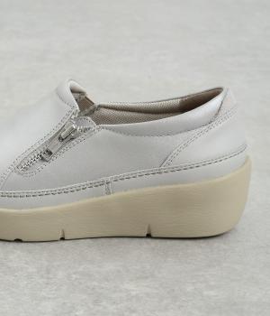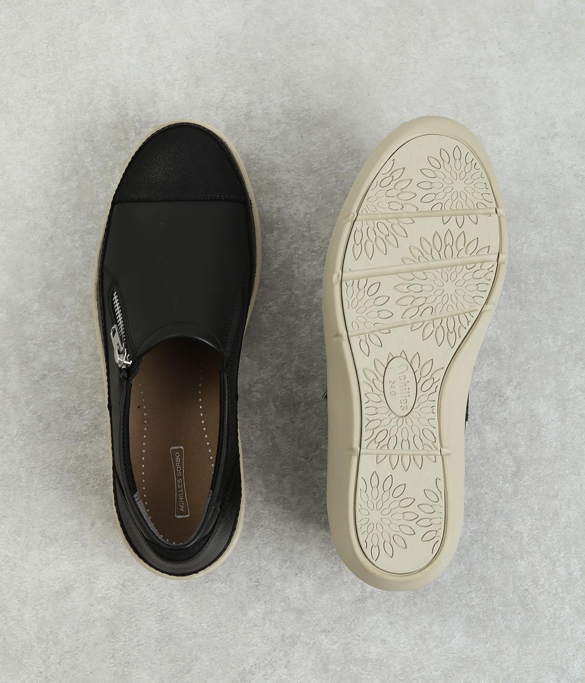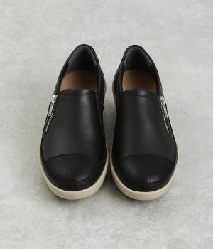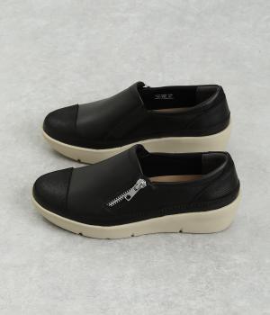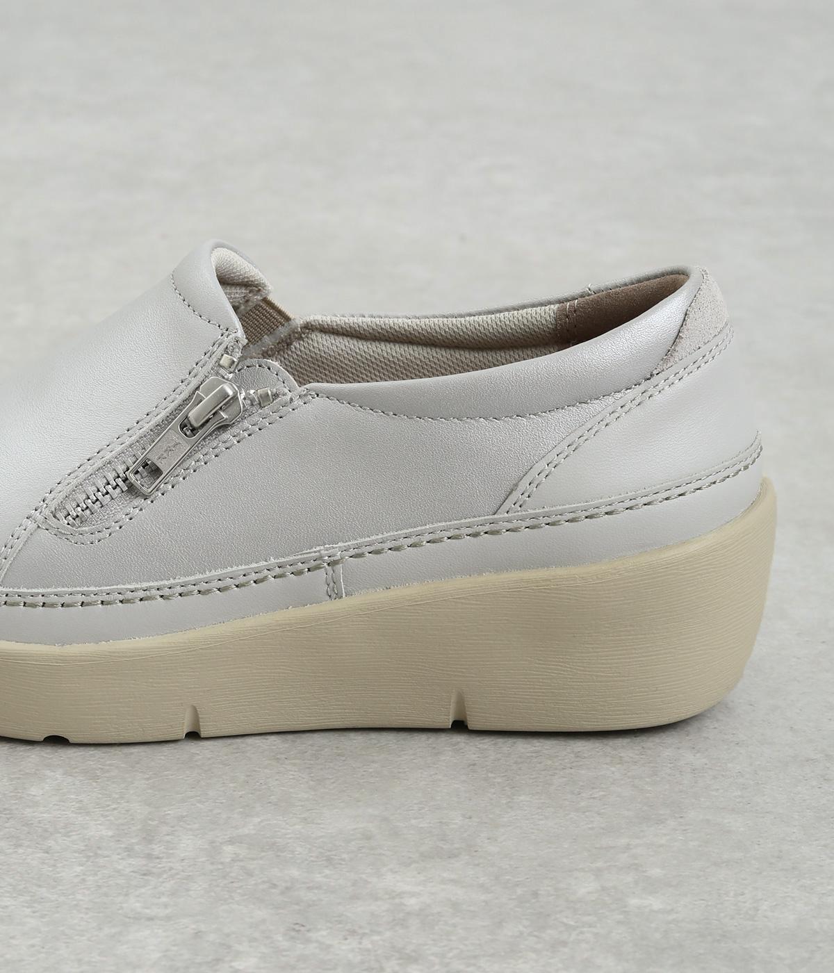 大人カジュアルな足元をつくるスリッポンシューズです。シンプルなデザインの中に、つま先のラメがアクセントをプラス。安定感がありつつも高さのあるソールで、着こなしのバランスをきれいに見せてくれます。サイドはファスナー開閉で脱ぎはきもスムーズ。