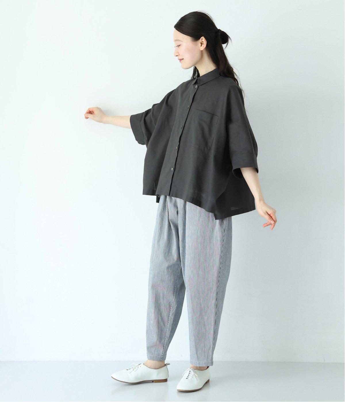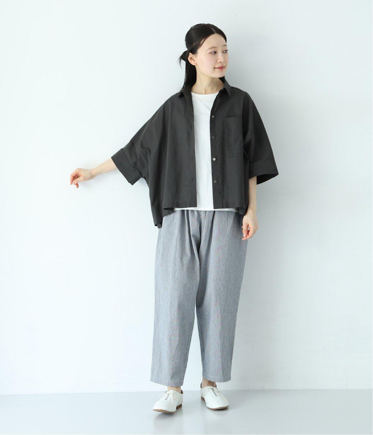 コットンリネンのナチュラルな風合いを感じる生地を使用しています。空気の通りのよい軽い素材で、清涼感たっぷり。肌離れのよいドライな質感が、着用するほどにやわらかくなじんでいきます。