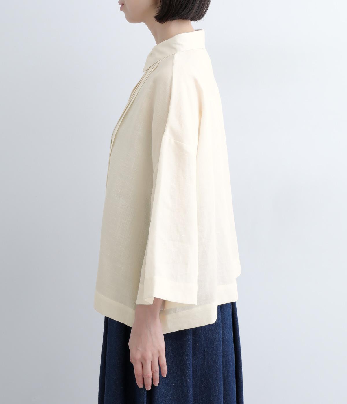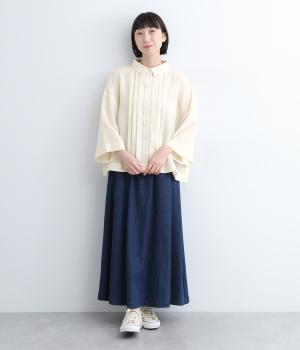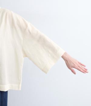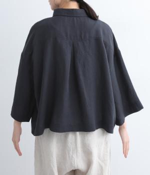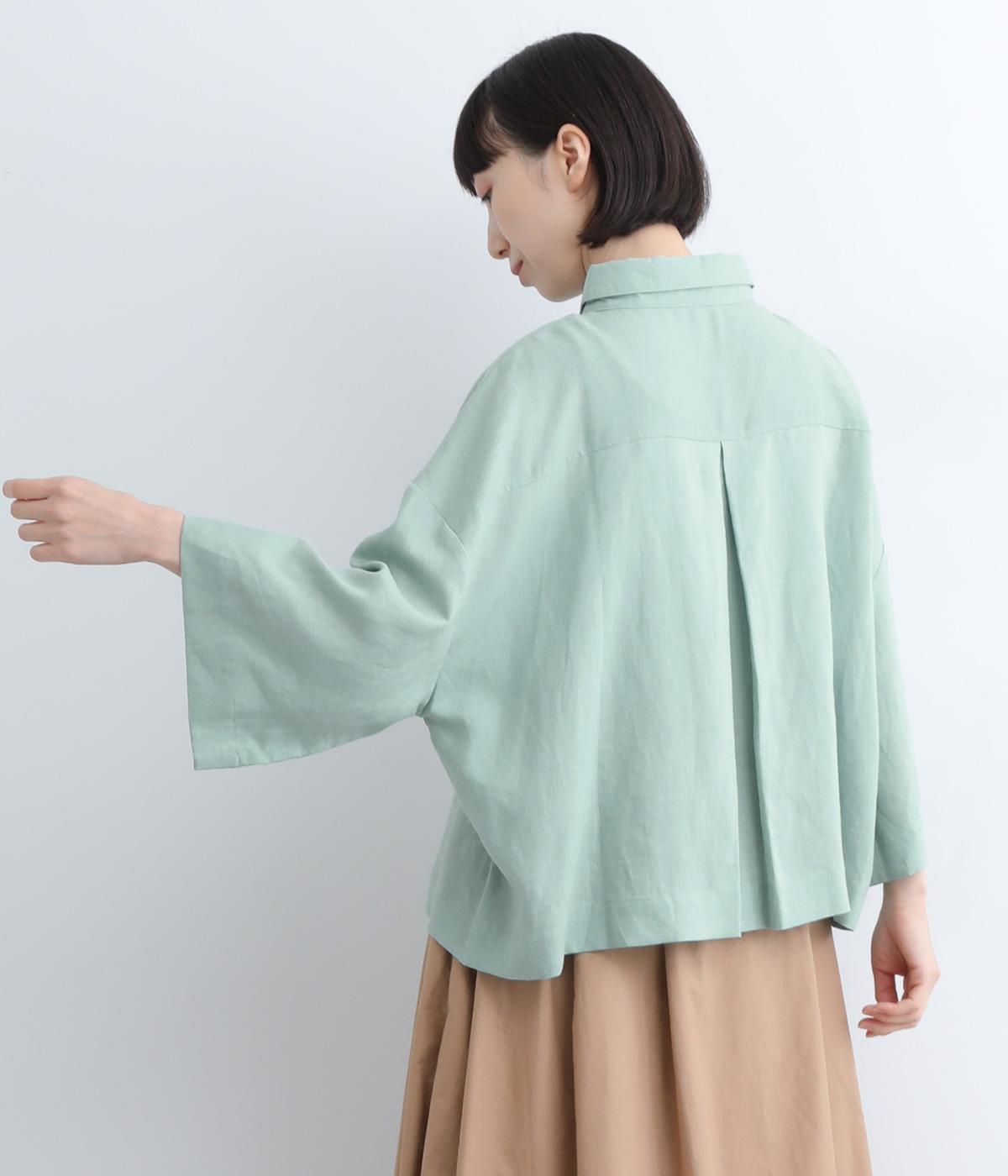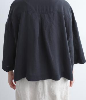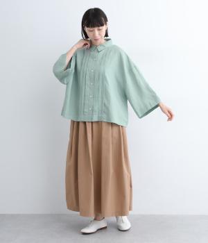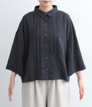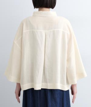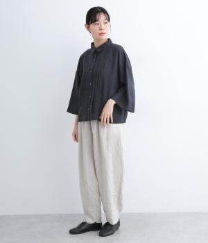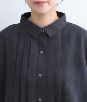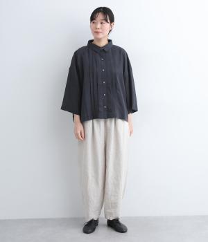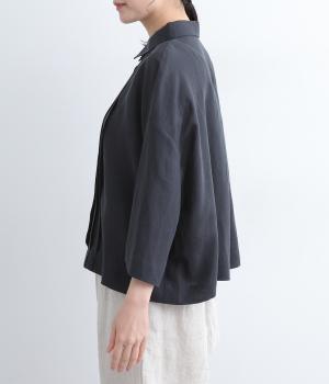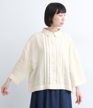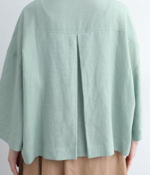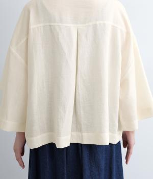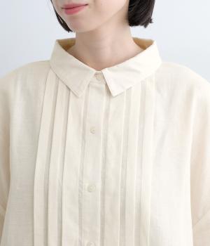 ゆとりのある袖幅やボックスシルエットなど、リラックスムードに仕立てました。前立てに沿ったピンタックがさり気なく品のいい印象に。ボタンを留めても窮屈さを感じにくい襟ぐりも特徴で、あたたかな季節の羽織り使いとしても重宝します。