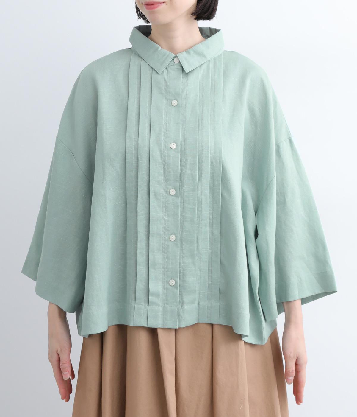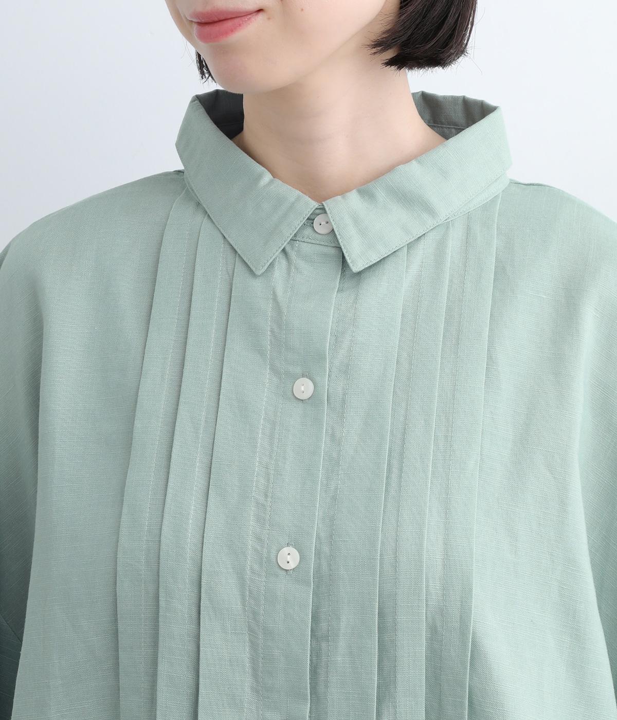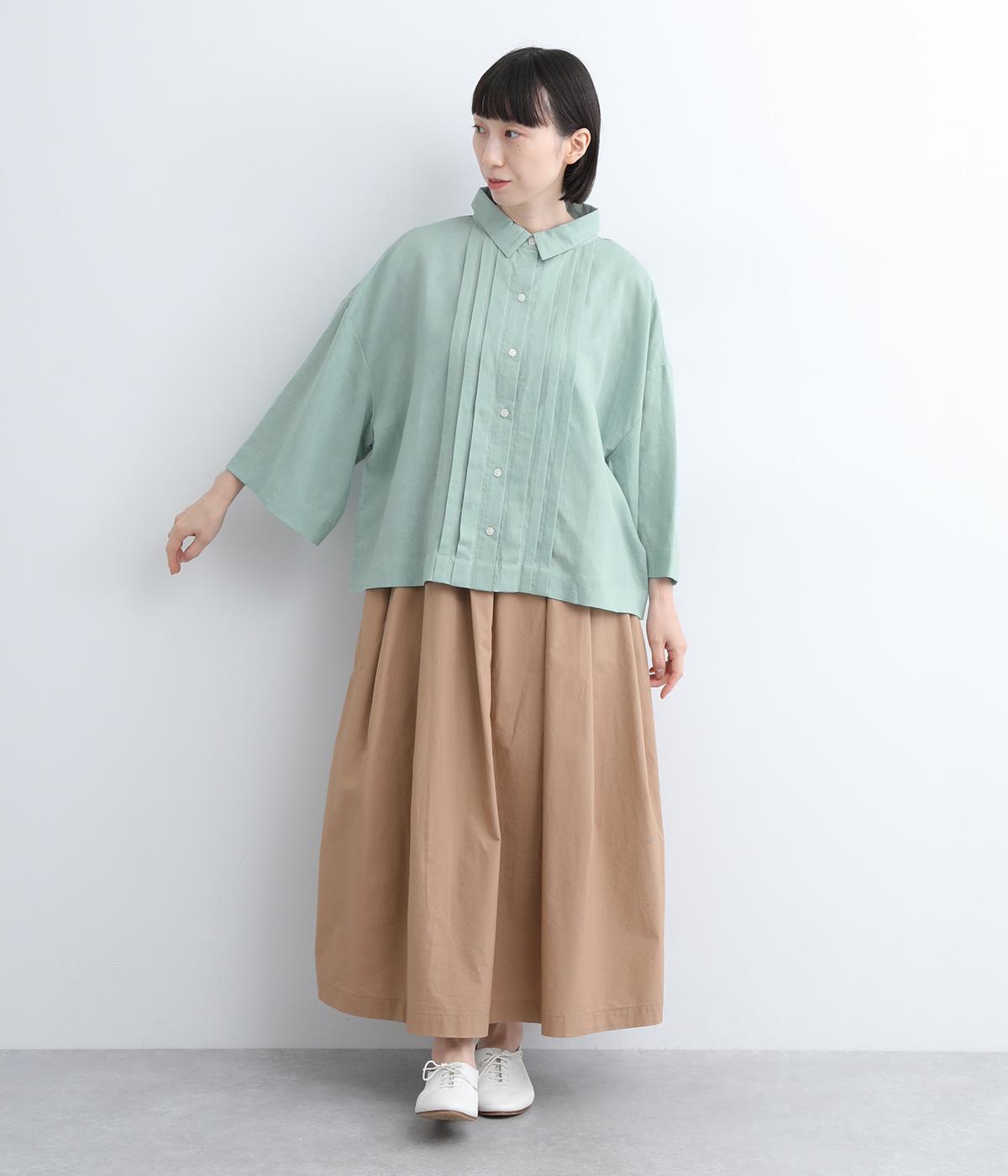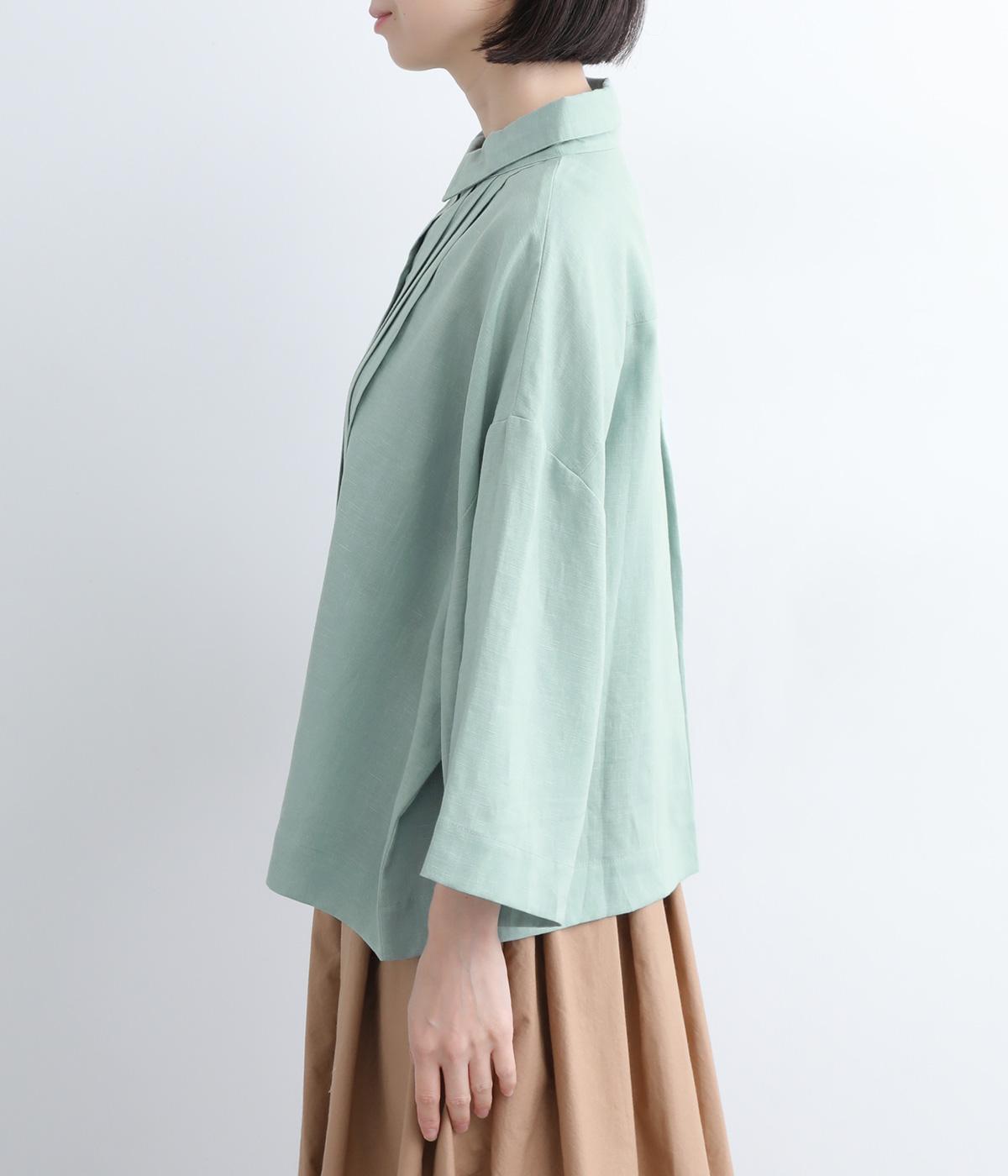 ゆとりのある袖幅やボックスシルエットなど、リラックスムードに仕立てました。前立てに沿ったピンタックがさり気なく品のいい印象に。ボタンを留めても窮屈さを感じにくい襟ぐりも特徴で、あたたかな季節の羽織り使いとしても重宝します。