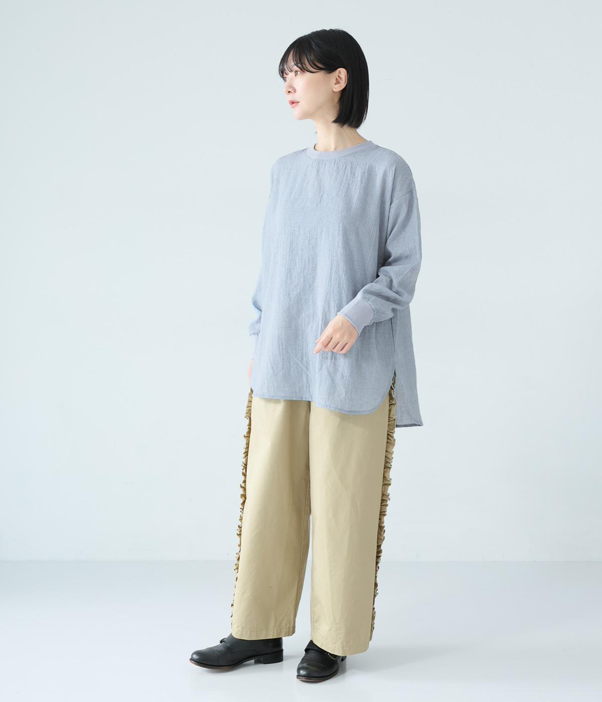 上品な透け感のあるとても軽やかな風合いのコットン混生地を使用しています。洗いざらしのようなシワ感がナチュラルなムードを演出。首まわりと袖口に伸縮性のあるリブをプラスしました。