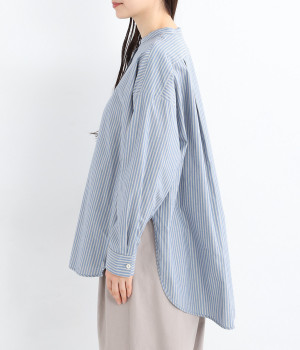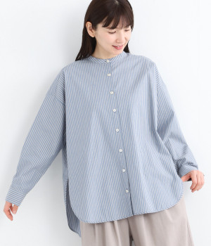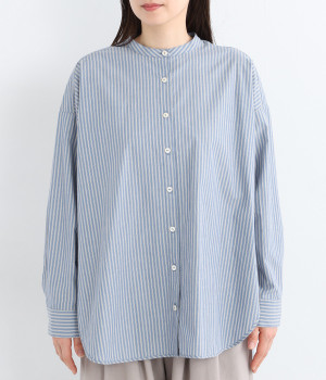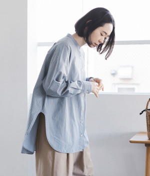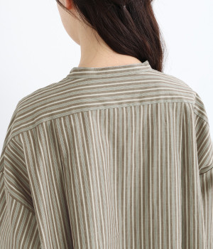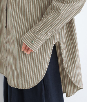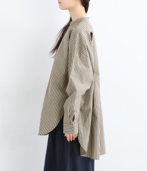 長めの着丈に深くサイドスリットが入っていて、体のラインを拾わないビッグシルエットながらもすっきりとした印象に。デザイン性の高いストライプ柄がコーディネートに清潔感をプラスします。シンプルなインナーに羽織るスタイリングも◎。