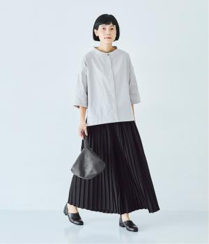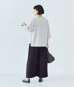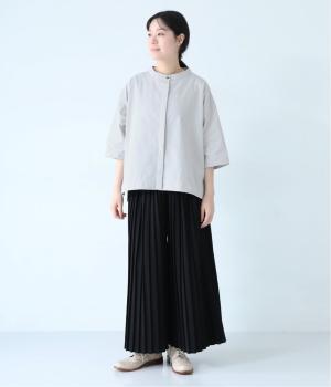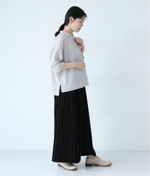 アイスグレーのシャツにプリーツパンツを合わせて、女性らしく上品な印象に。