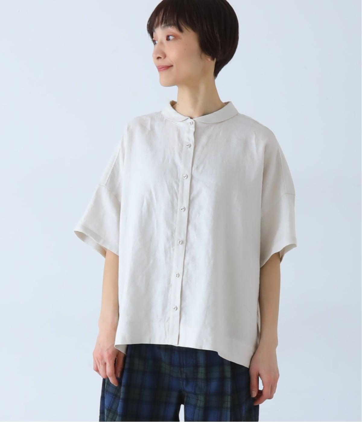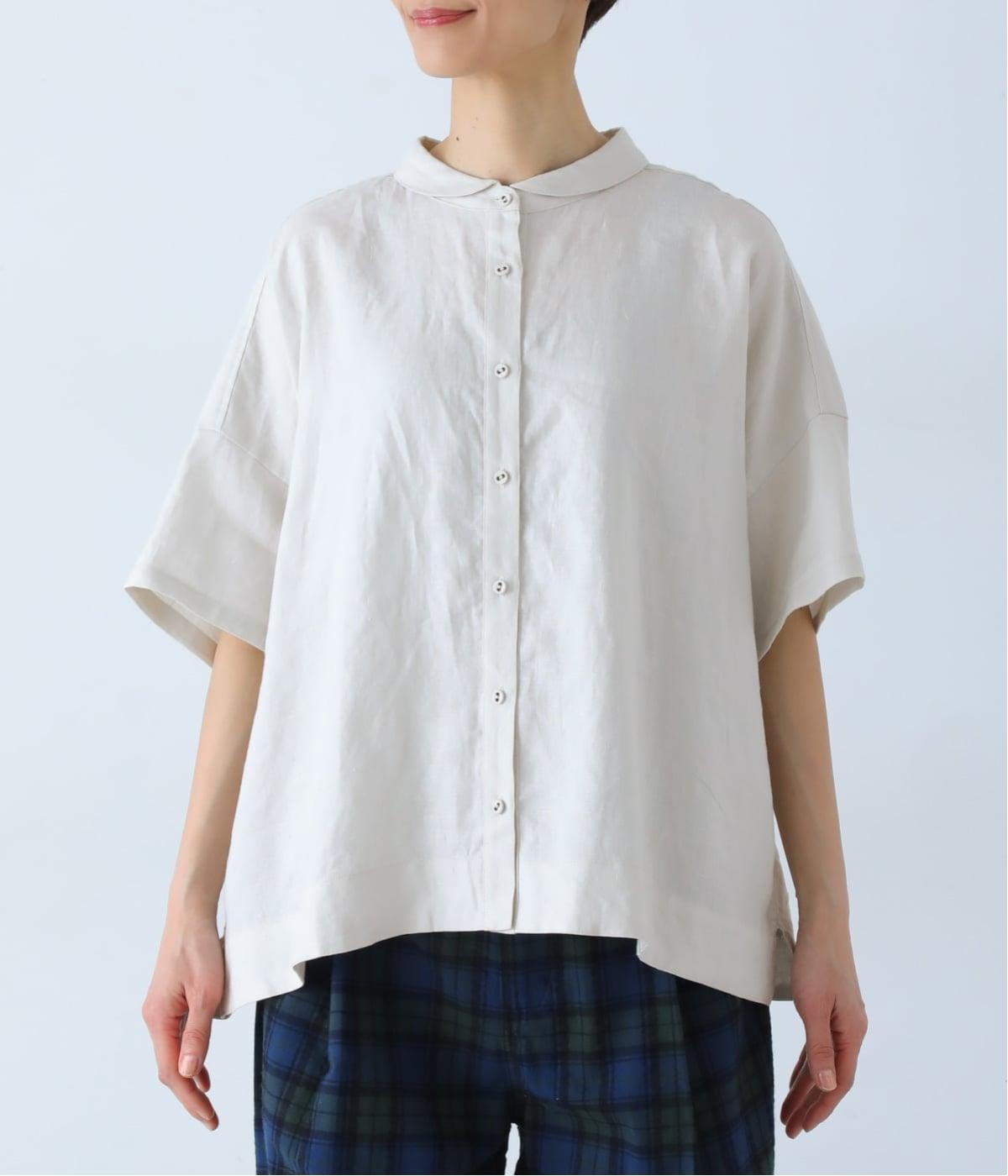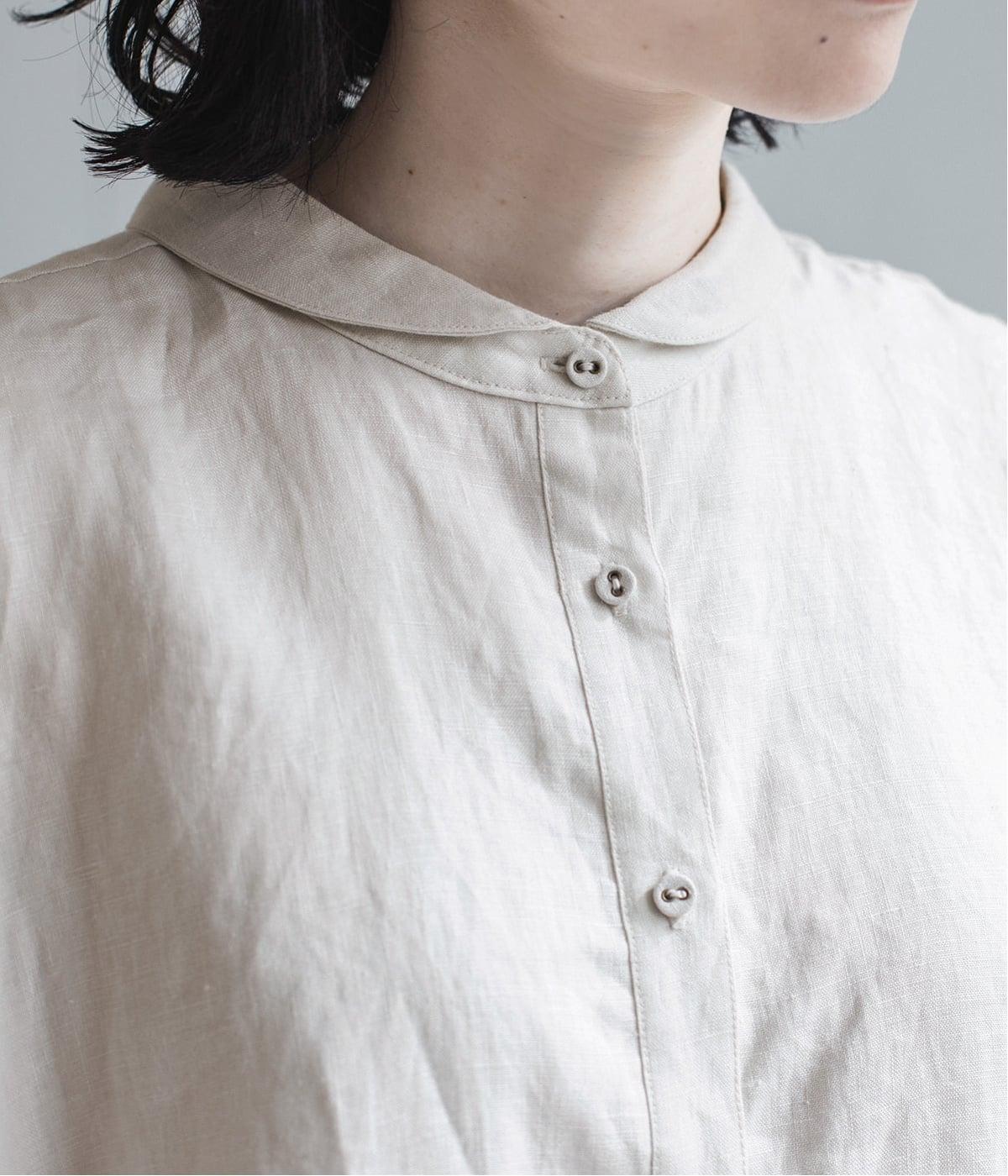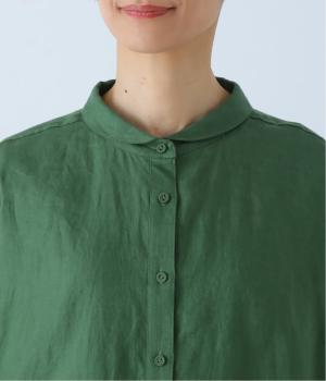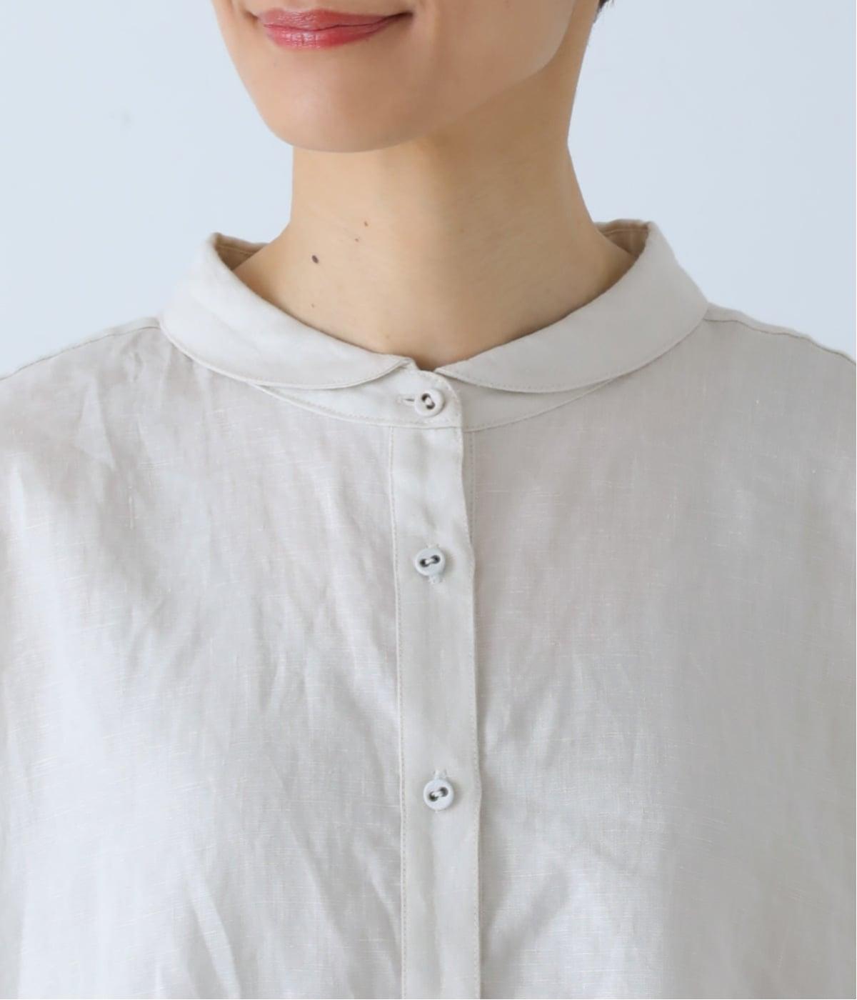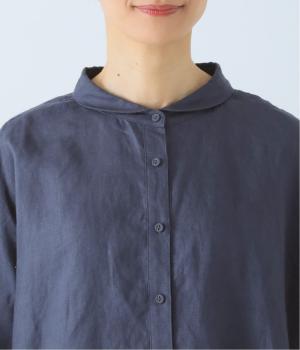 体のラインを拾いにくい、ゆったりとしたボックスシルエットのシャツ。小さな丸襟が女性らしさを添え、一枚でも羽織りとしてもバランスよく着こなせます。
