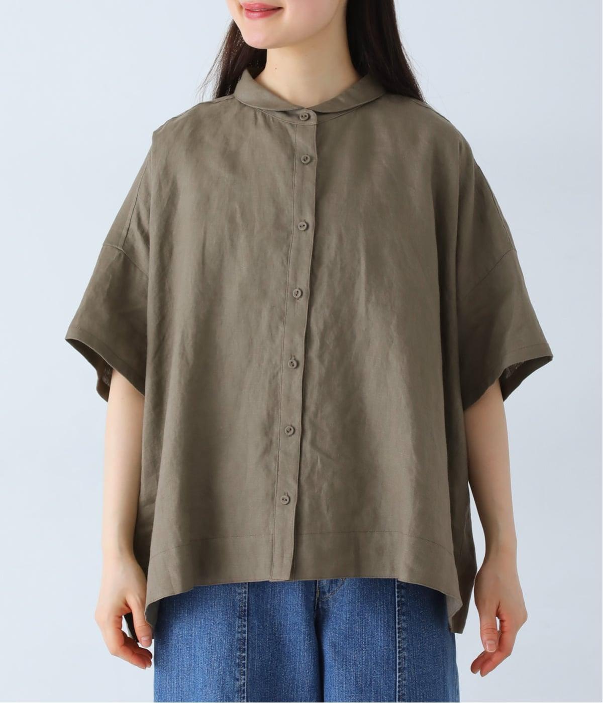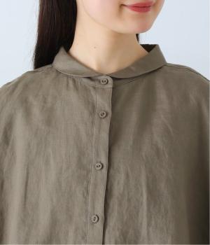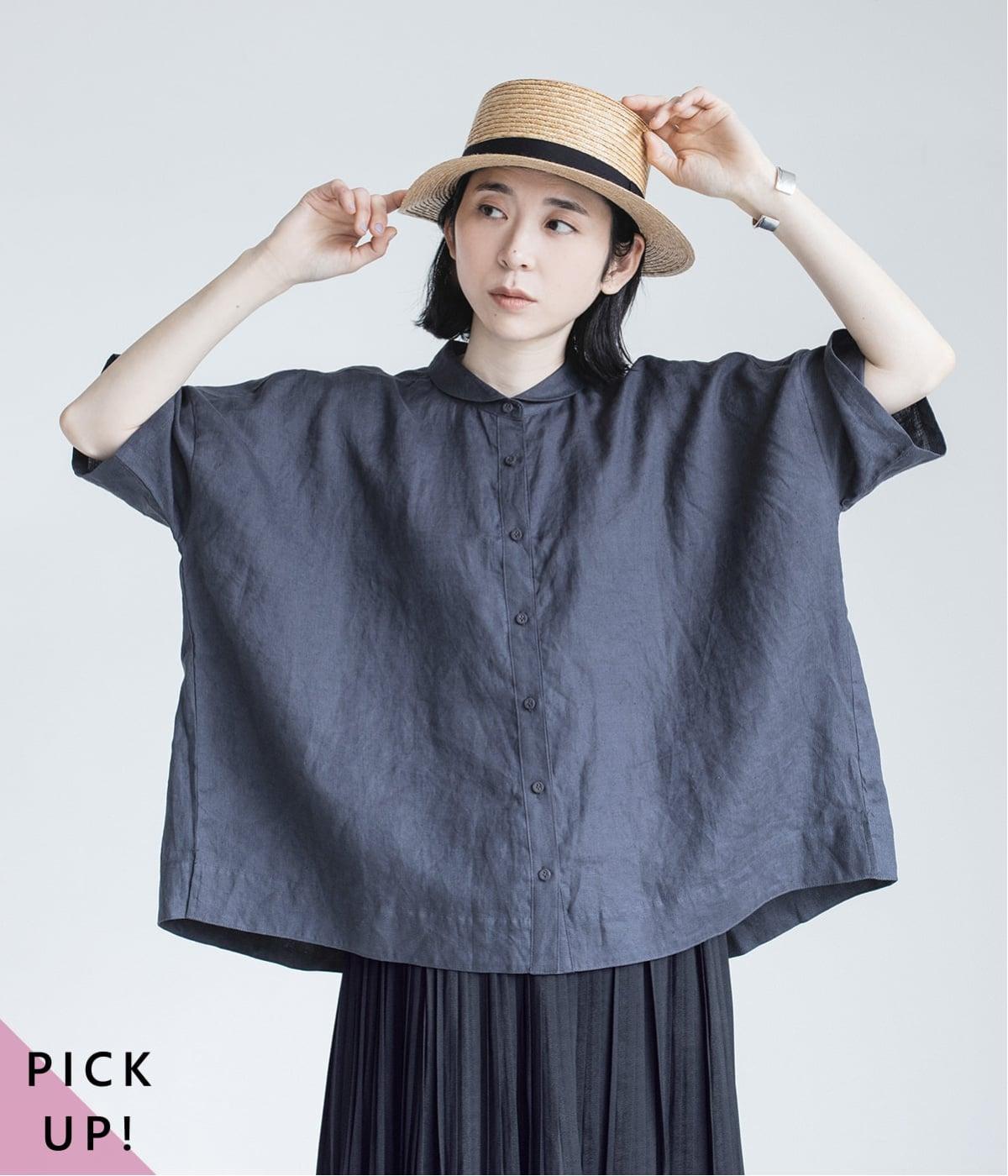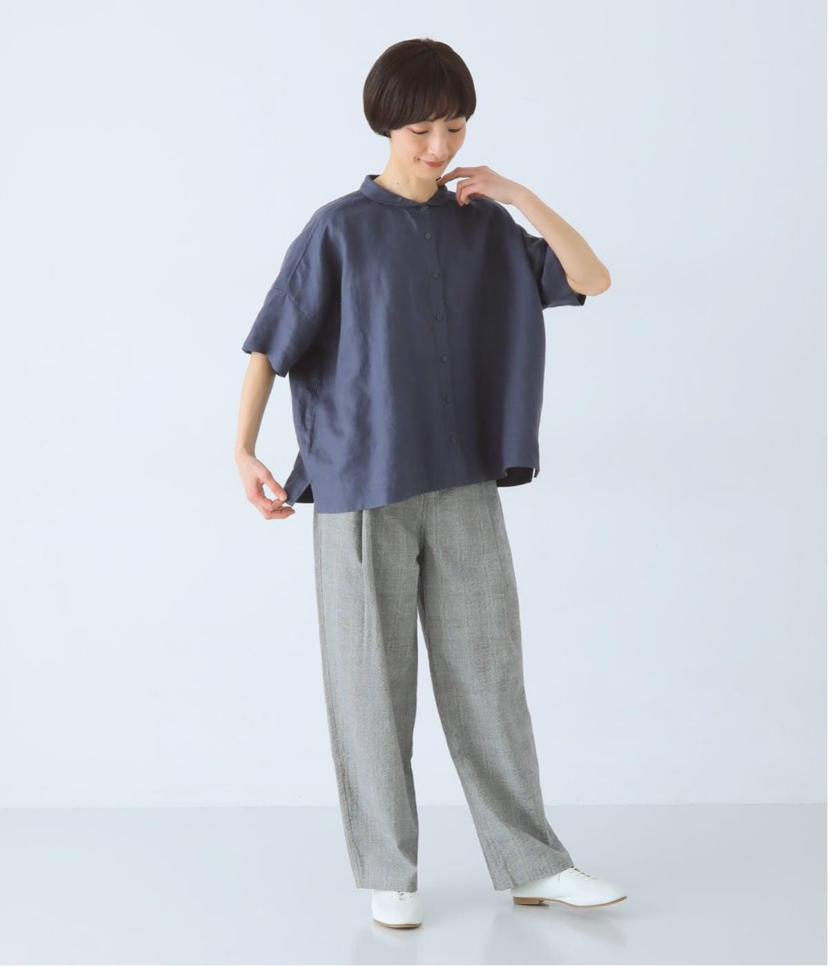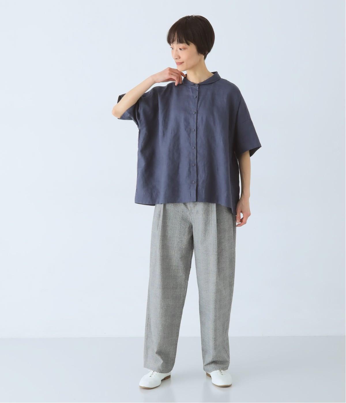 体のラインを拾いにくい、ゆったりとしたボックスシルエットのシャツ。小さな丸襟が女性らしさを添え、一枚でも羽織りとしてもバランスよく着こなせます。