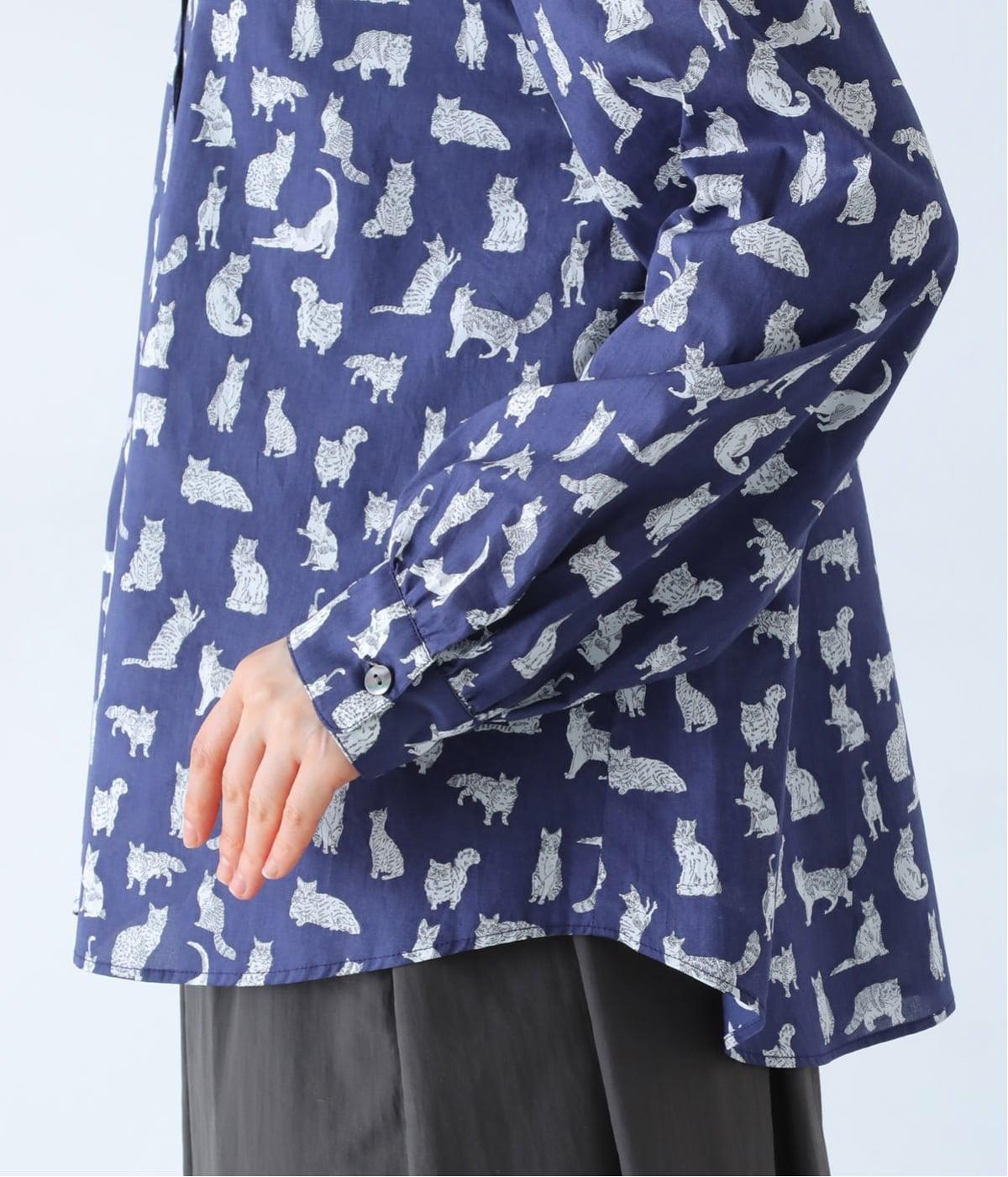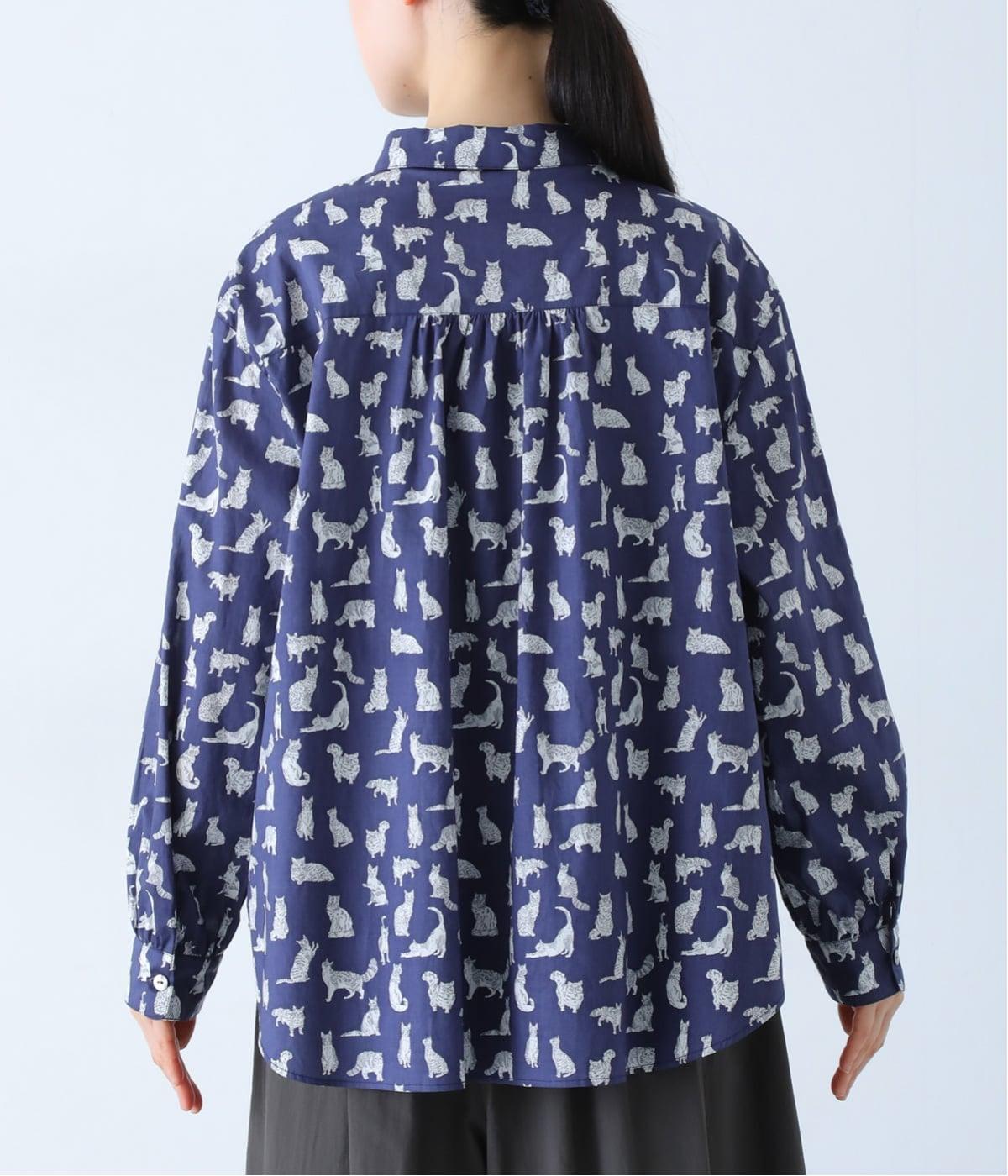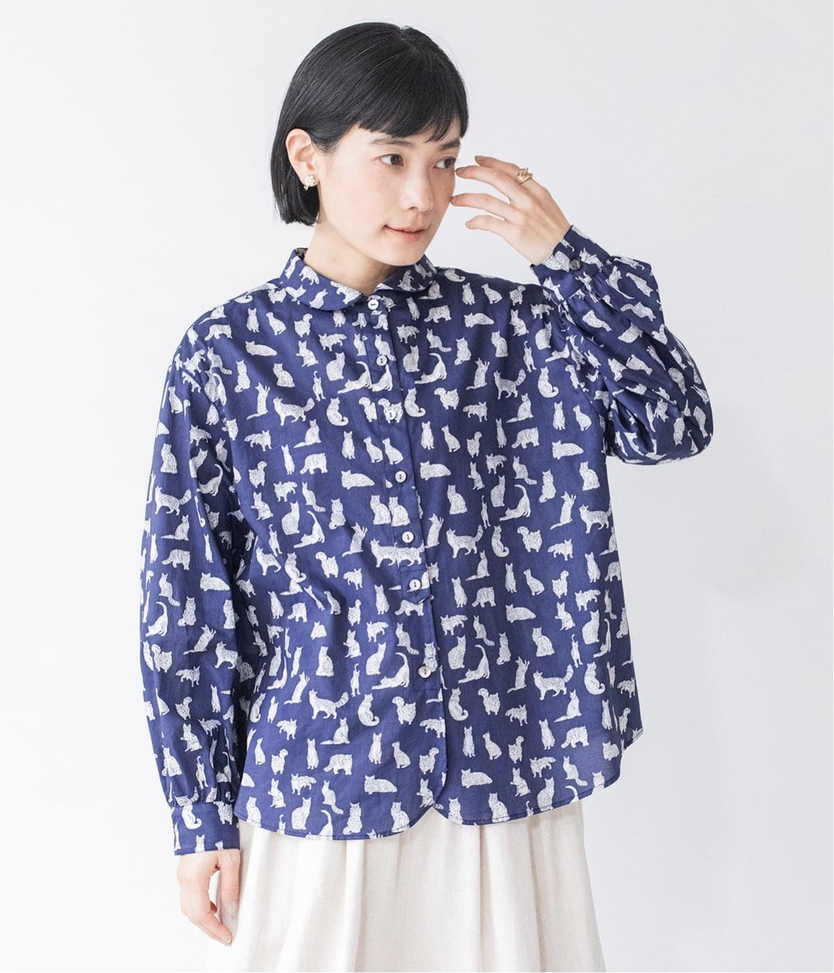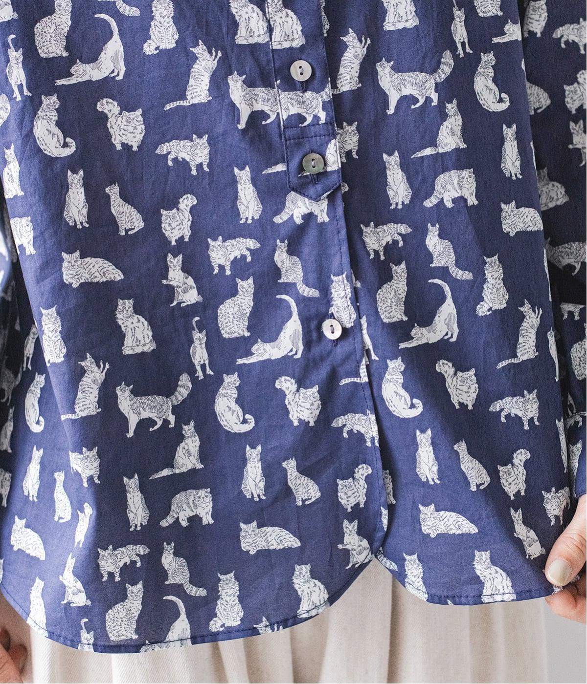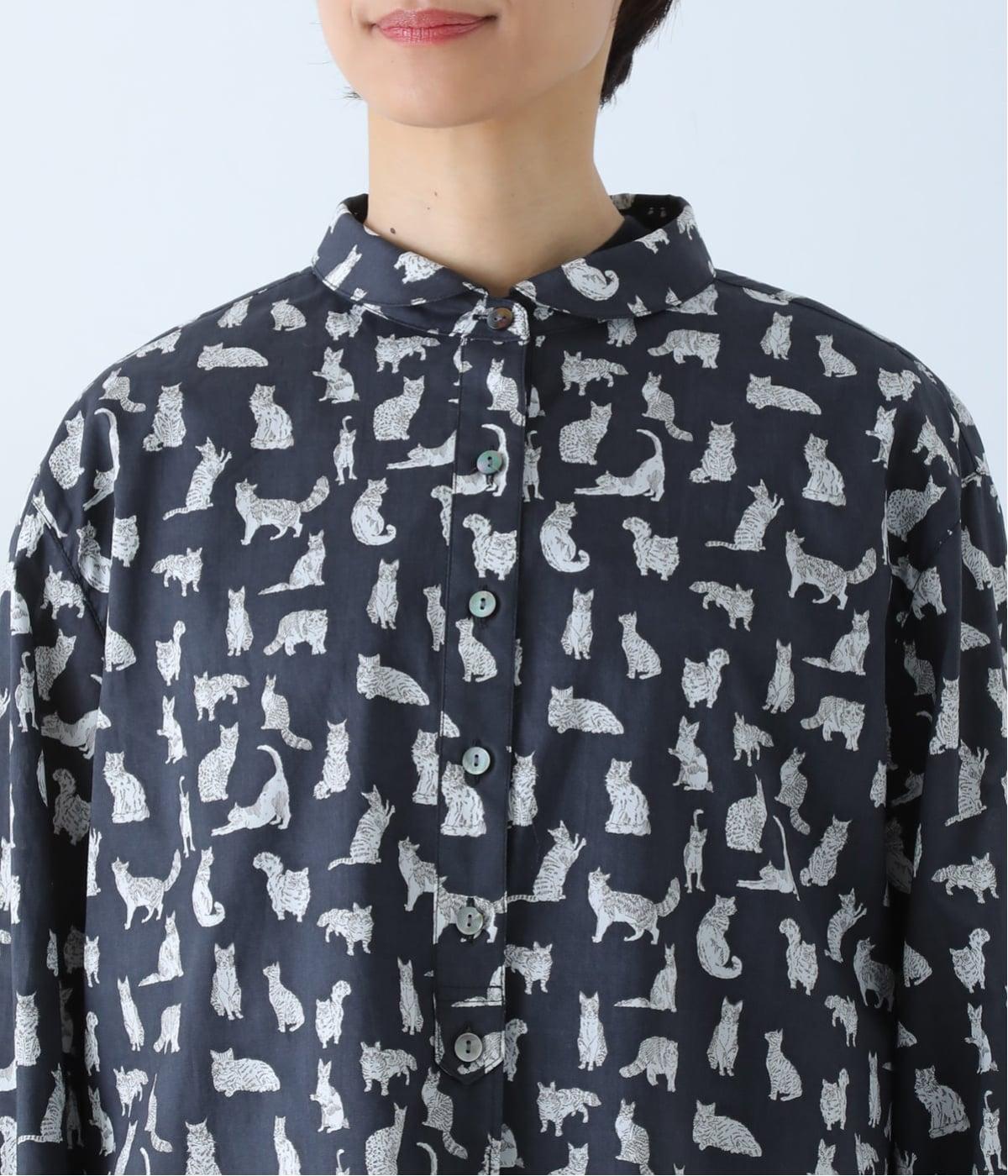 リバティプリントのネコ柄生地でブラウスを仕立てました。詰まった首元や前立ての剣ボロ仕立てがクラッシックな印象で、チビ襟デザインが可愛らしさをプラスします。うしろヨークにはギャザーをほどこし、立体的なシルエットに仕上げました。