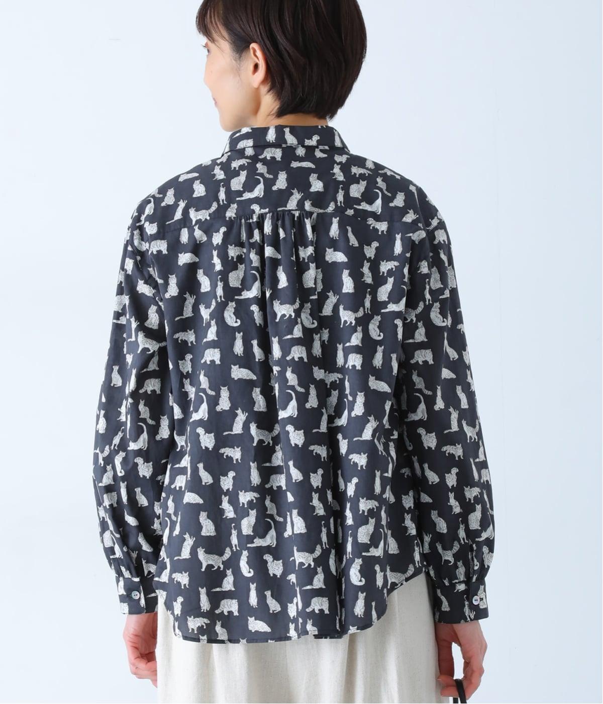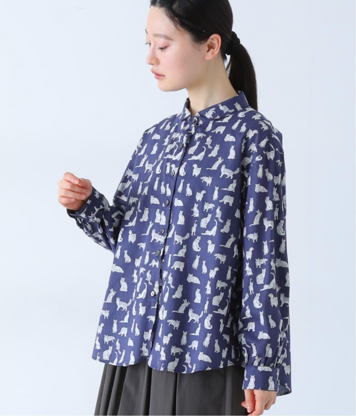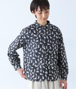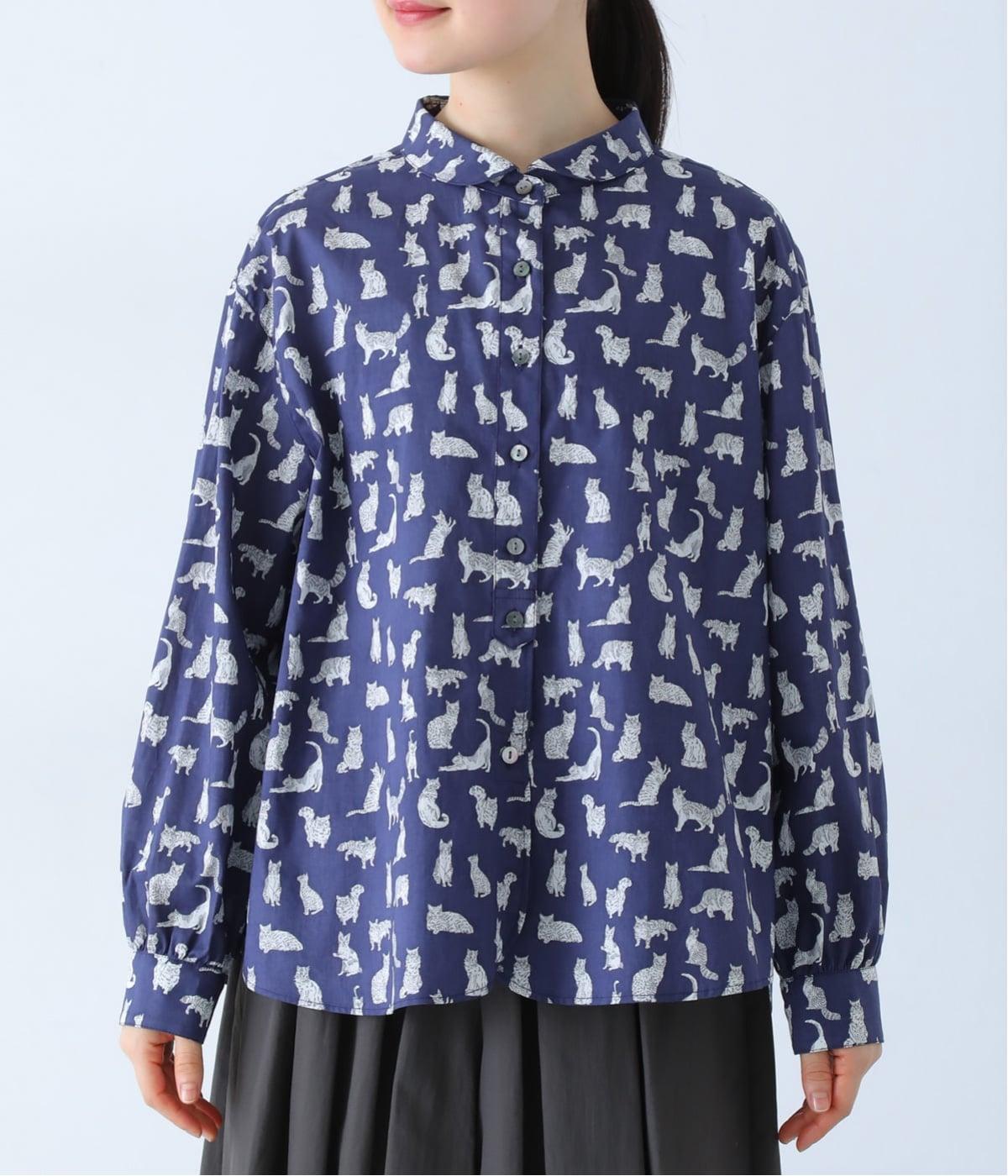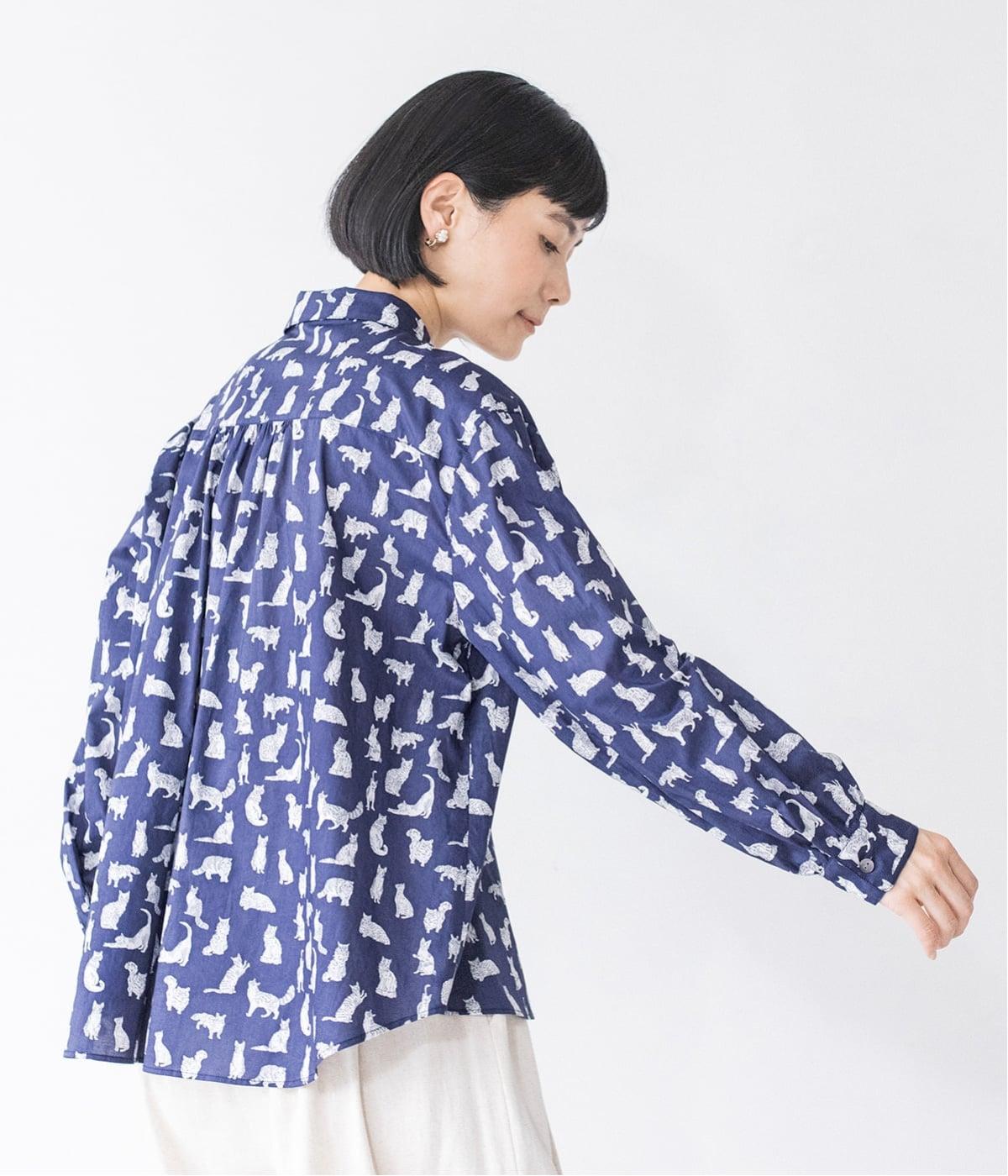 リバティプリントのネコ柄生地でブラウスを仕立てました。詰まった首元や前立ての剣ボロ仕立てがクラッシックな印象で、チビ襟デザインが可愛らしさをプラスします。うしろヨークにはギャザーをほどこし、立体的なシルエットに仕上げました。