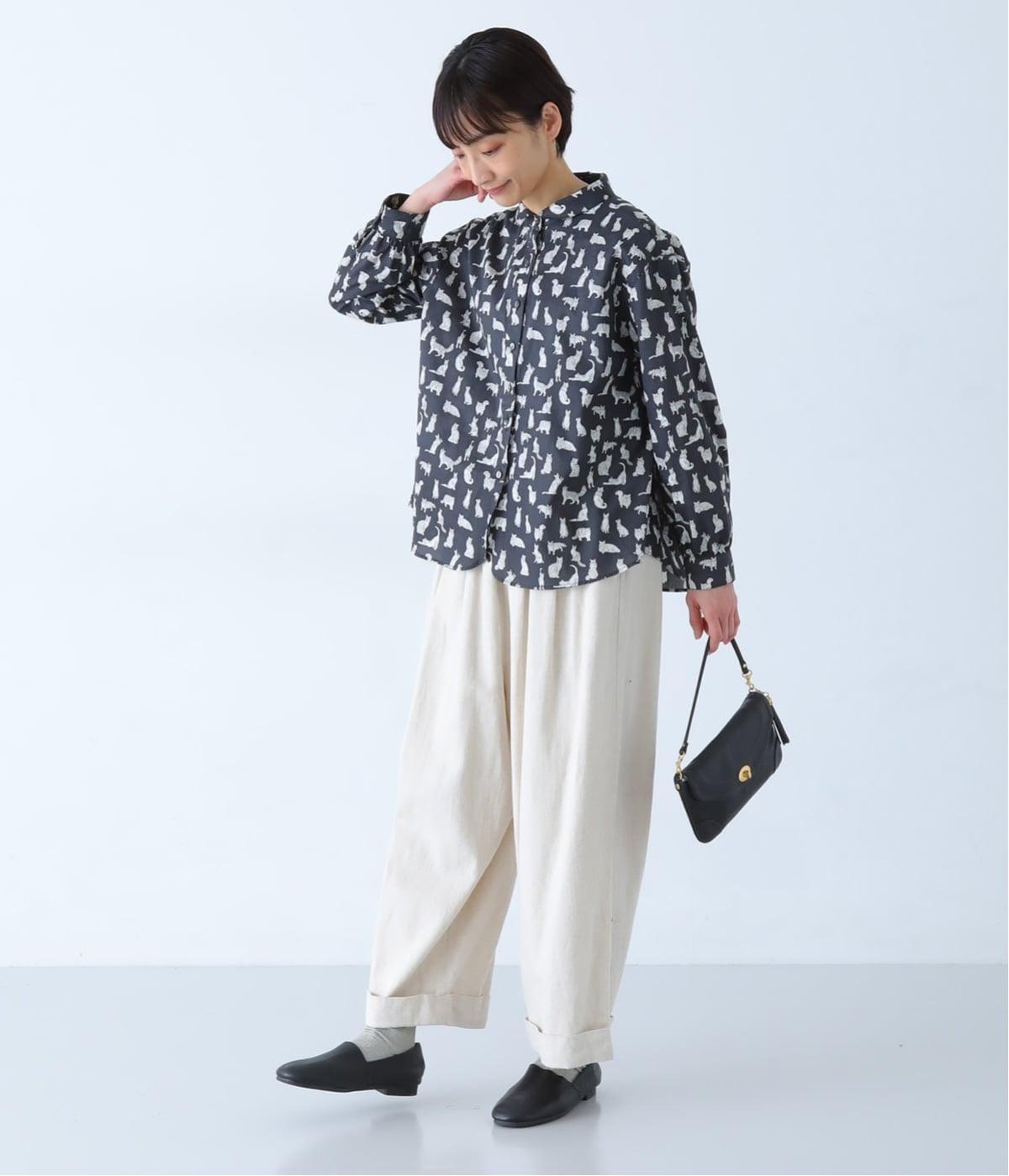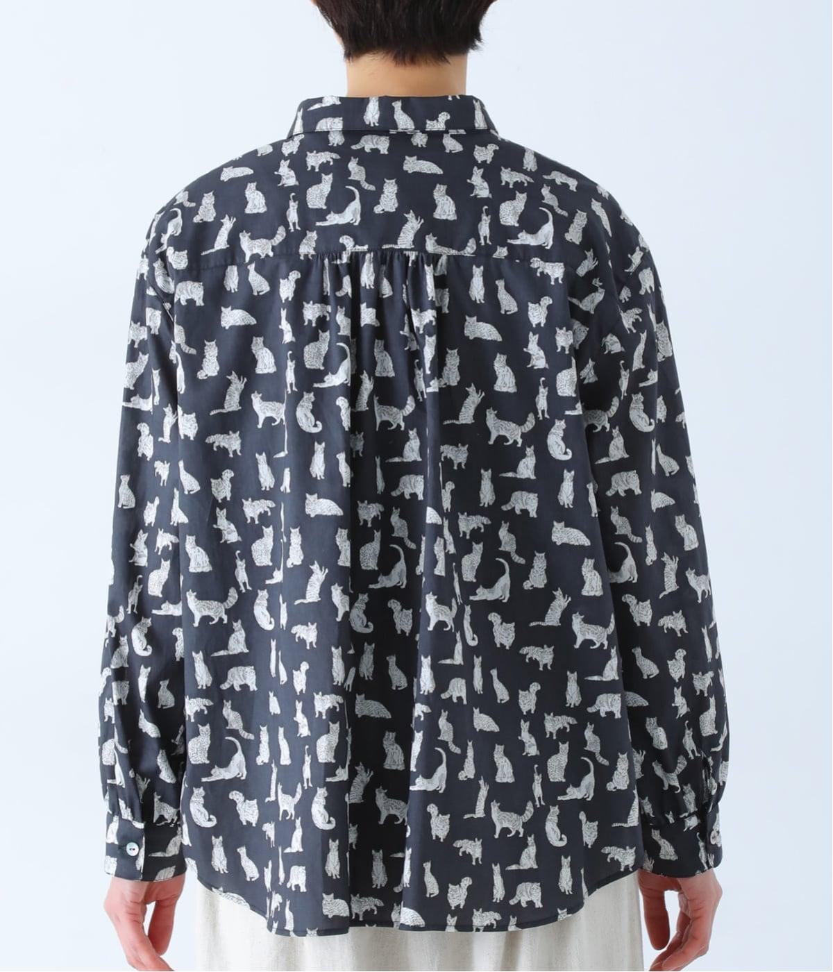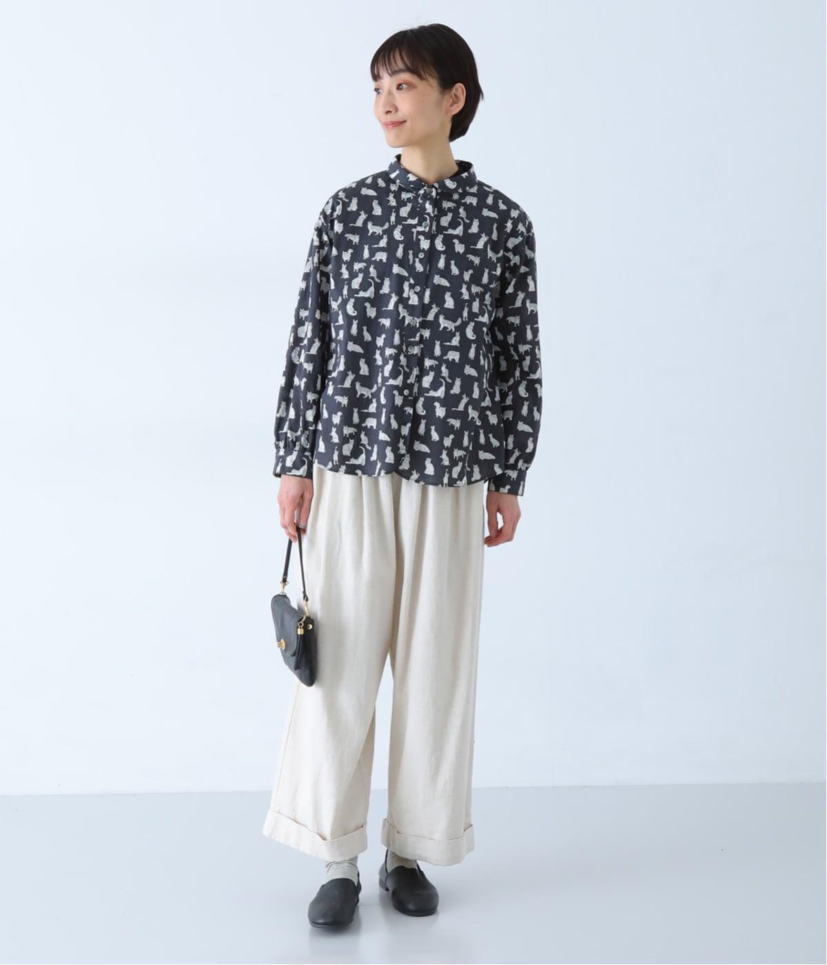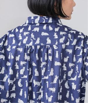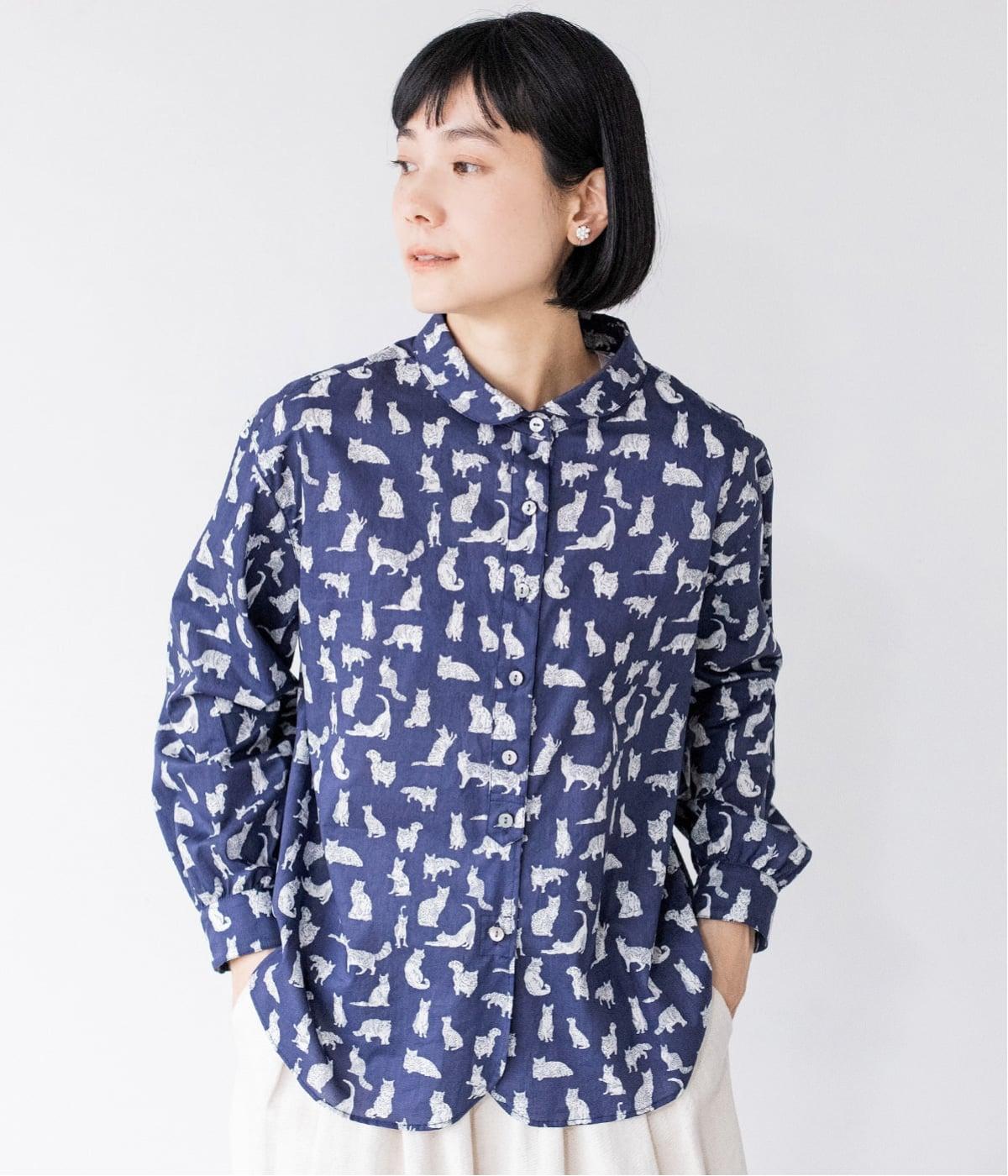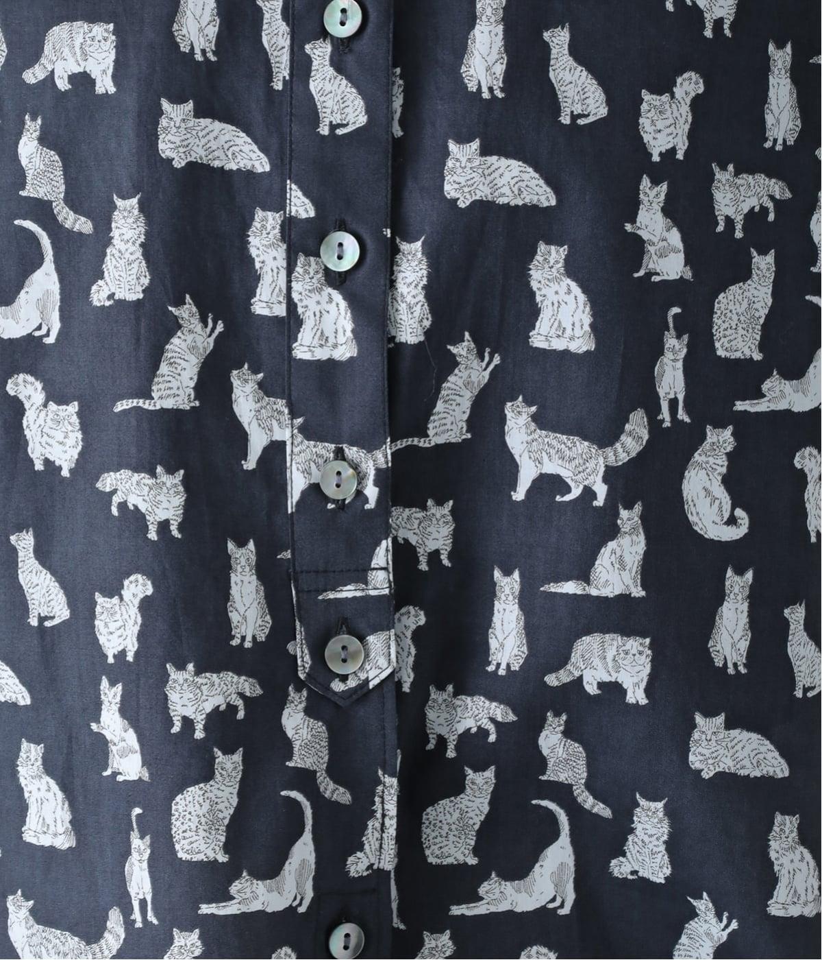 リバティプリントのネコ柄生地でブラウスを仕立てました。詰まった首元や前立ての剣ボロ仕立てがクラッシックな印象で、チビ襟デザインが可愛らしさをプラスします。うしろヨークにはギャザーをほどこし、立体的なシルエットに仕上げました。