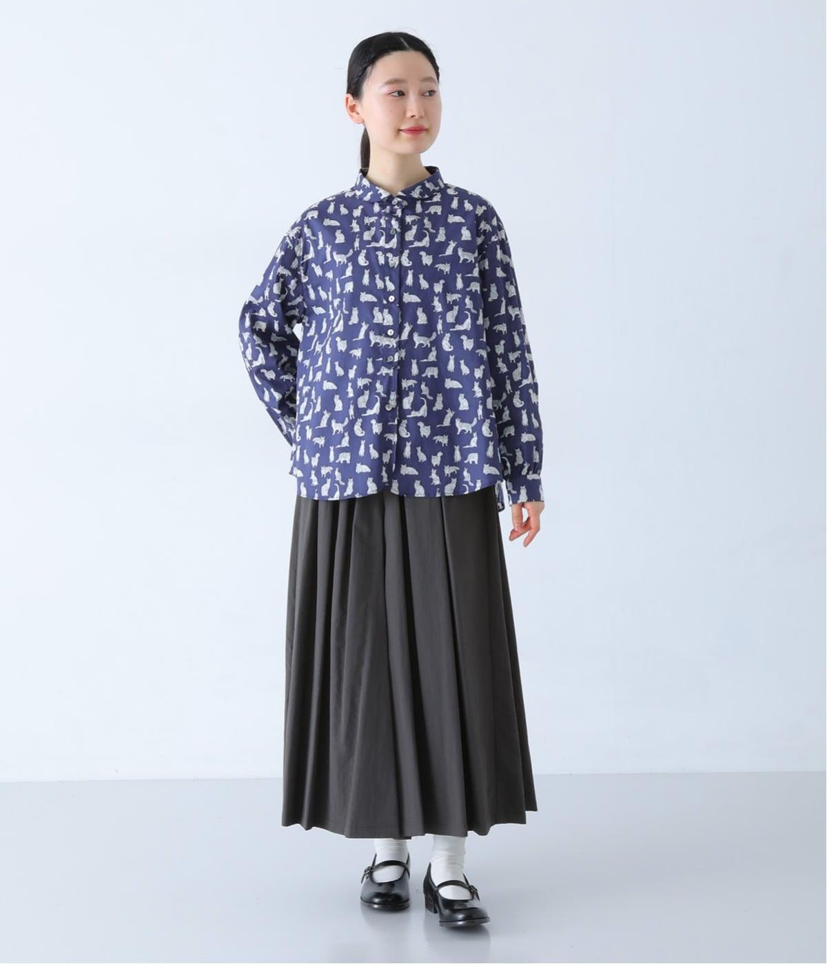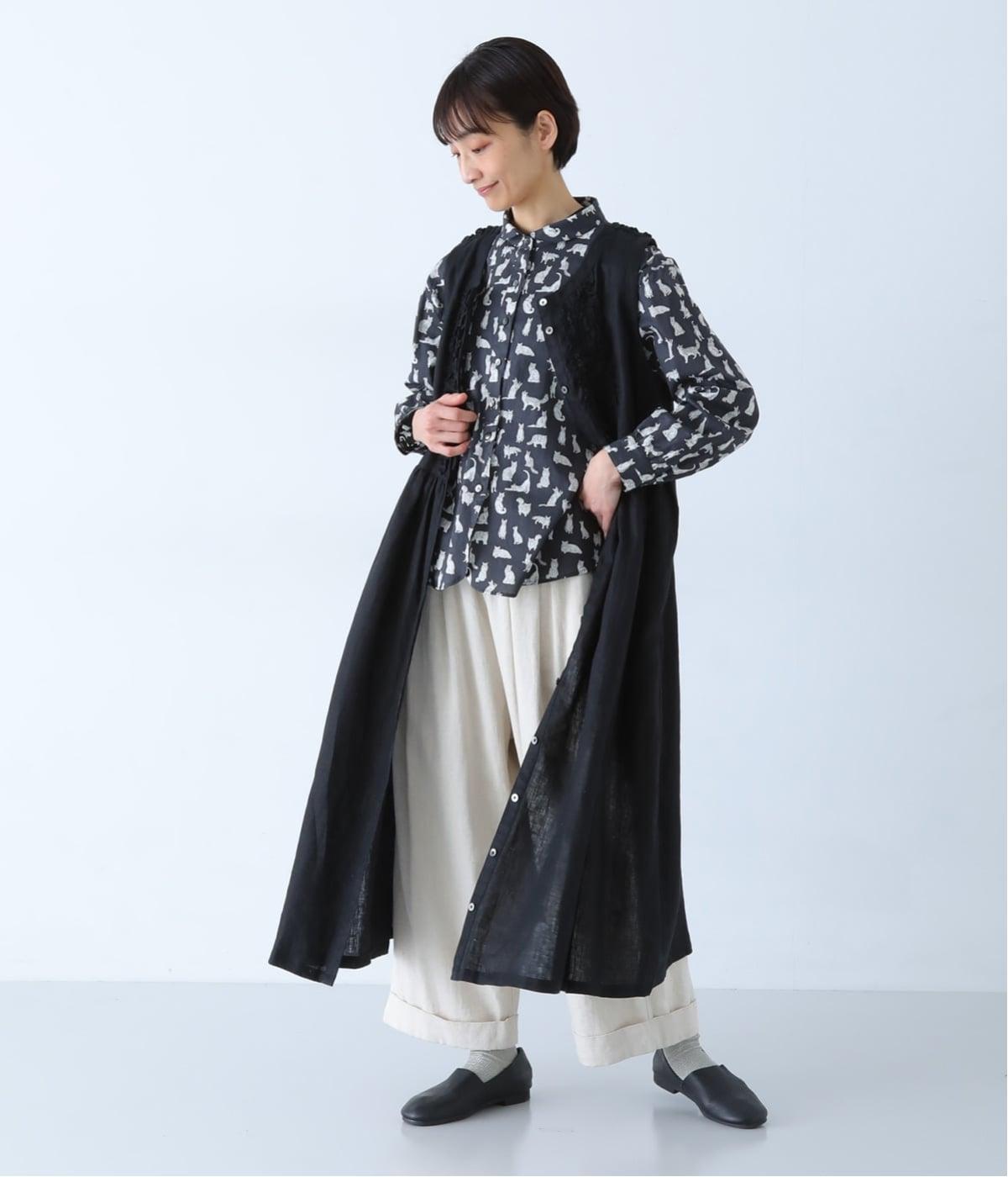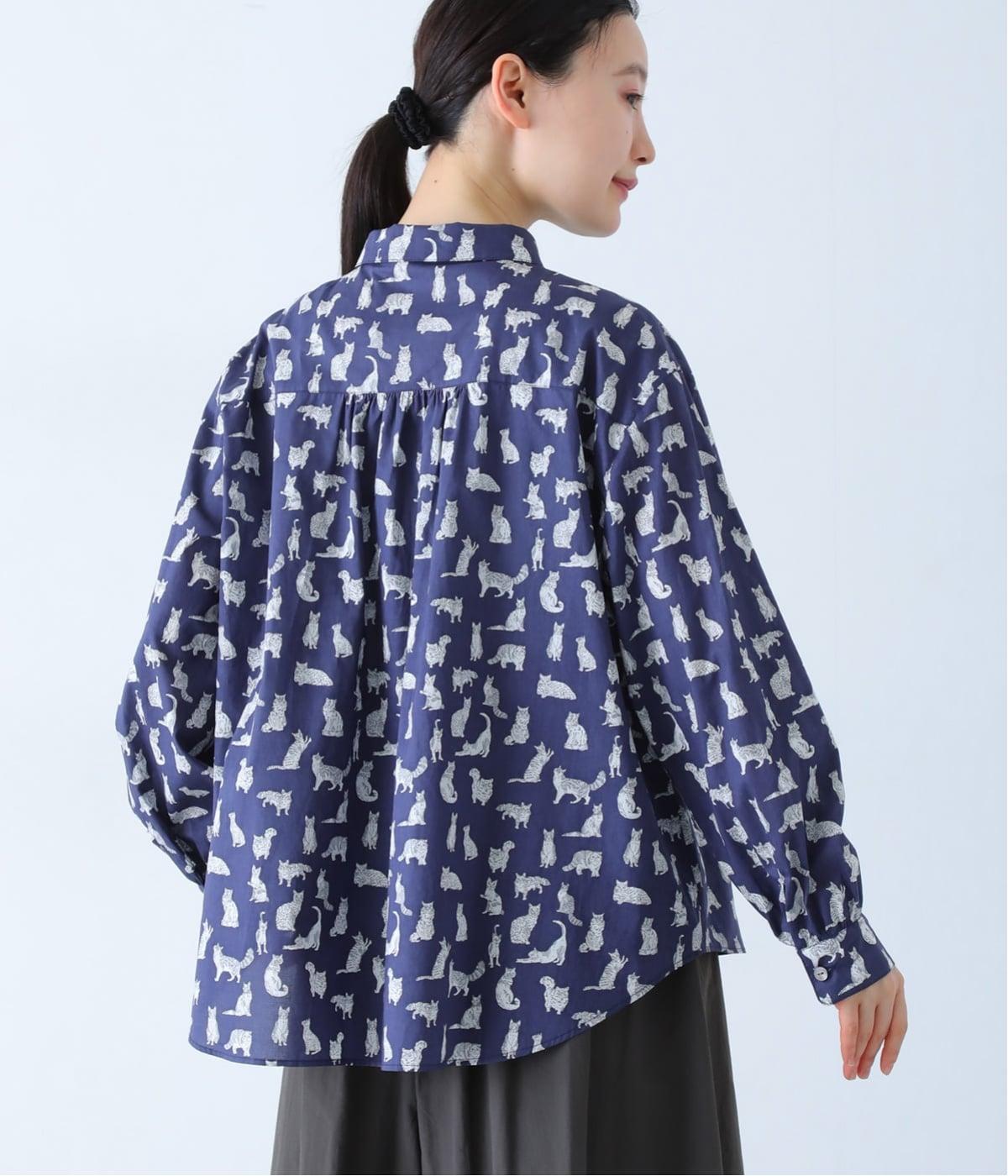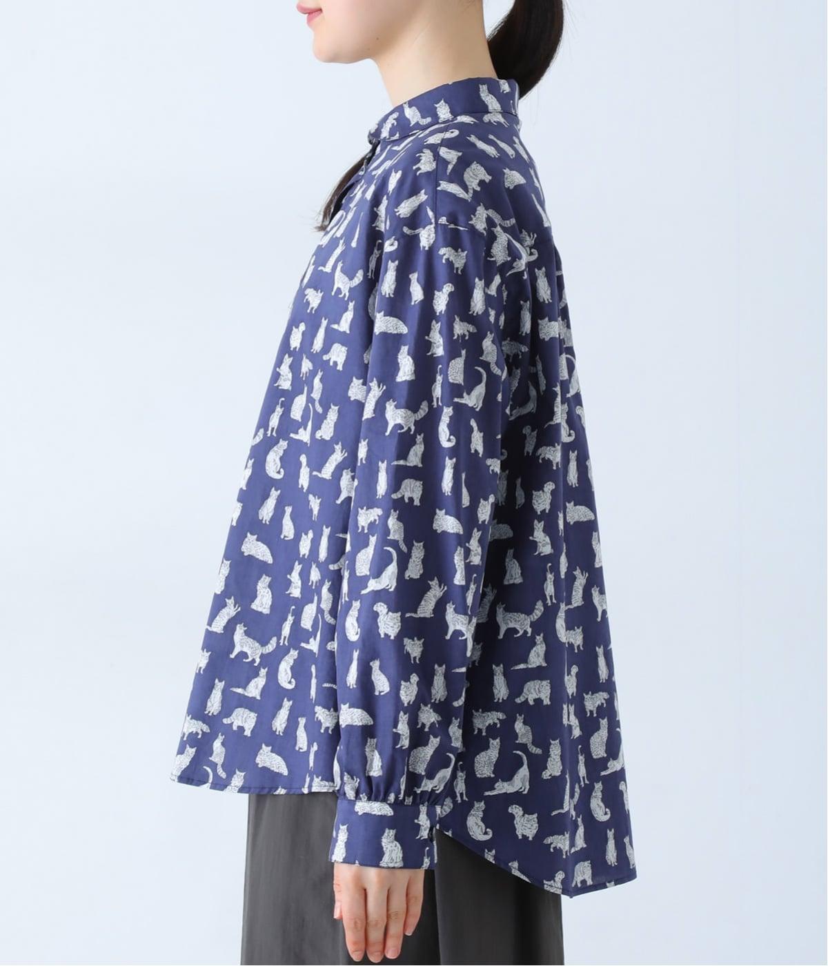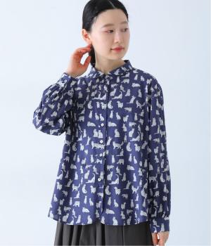 リバティプリントのネコ柄生地でブラウスを仕立てました。詰まった首元や前立ての剣ボロ仕立てがクラッシックな印象で、チビ襟デザインが可愛らしさをプラスします。うしろヨークにはギャザーをほどこし、立体的なシルエットに仕上げました。