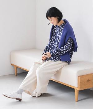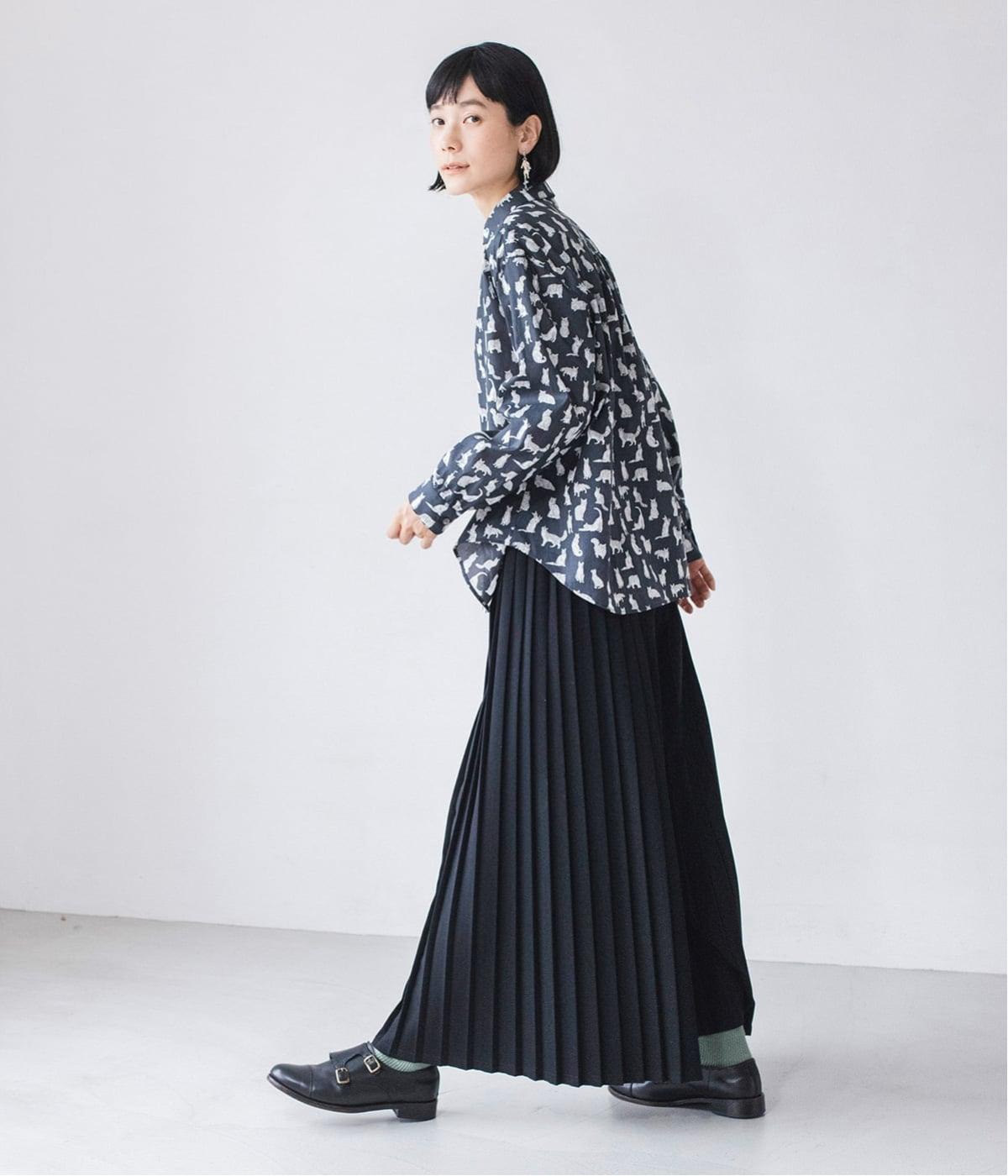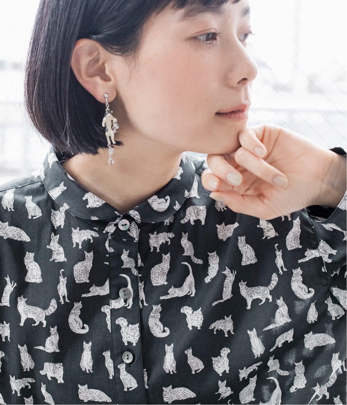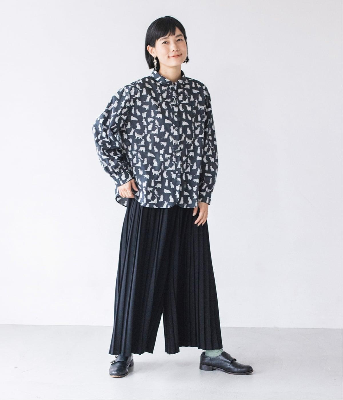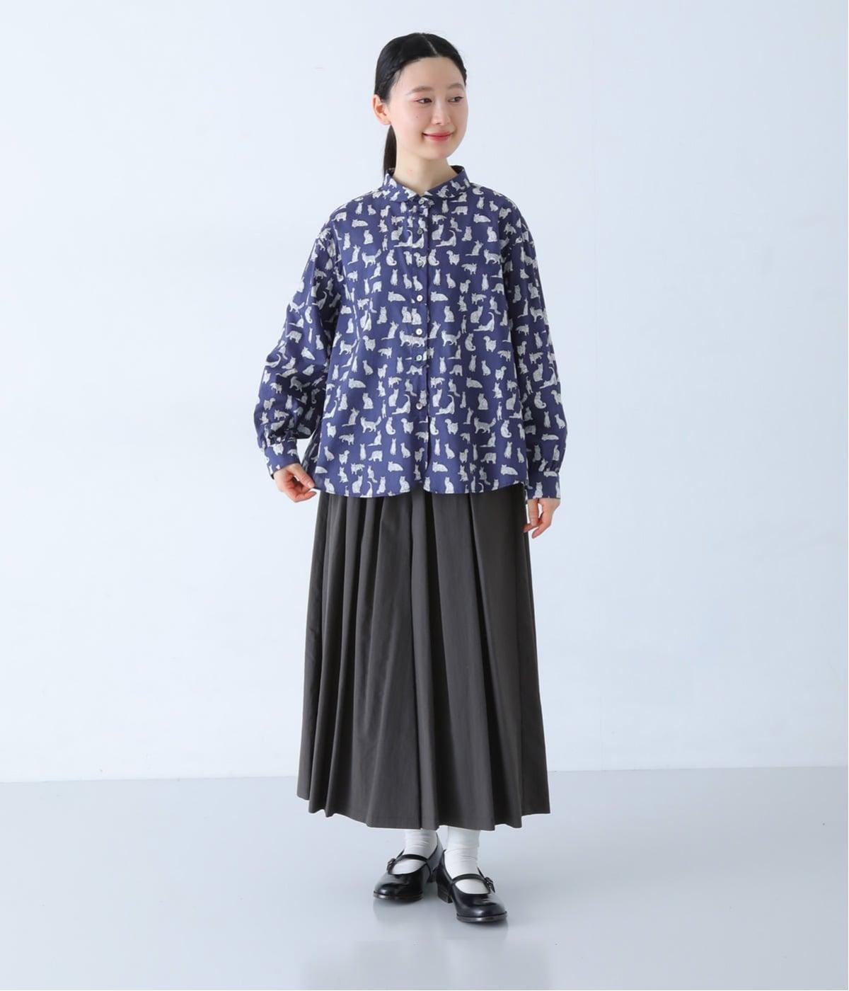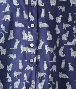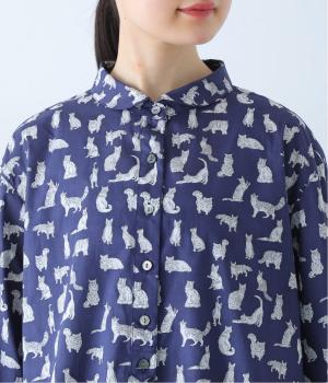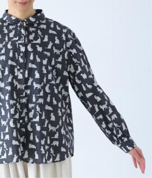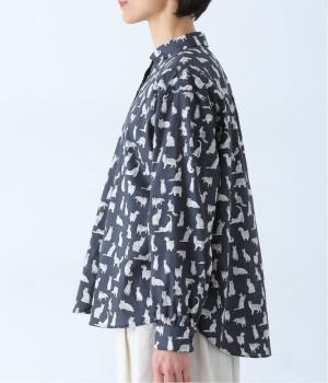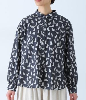 リバティプリントのネコ柄生地でブラウスを仕立てました。詰まった首元や前立ての剣ボロ仕立てがクラッシックな印象で、チビ襟デザインが可愛らしさをプラスします。うしろヨークにはギャザーをほどこし、立体的なシルエットに仕上げました。